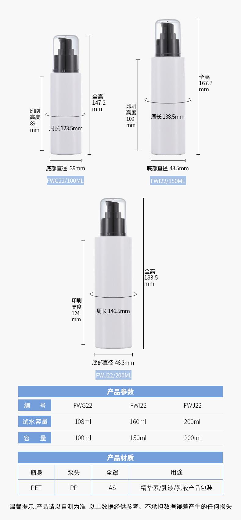 Envases disponibles: botella de emulsión cosmética de 100-150 ml, botella con cabezal de bomba a presión de 200 ml, plástico, conveniente subembotellado.