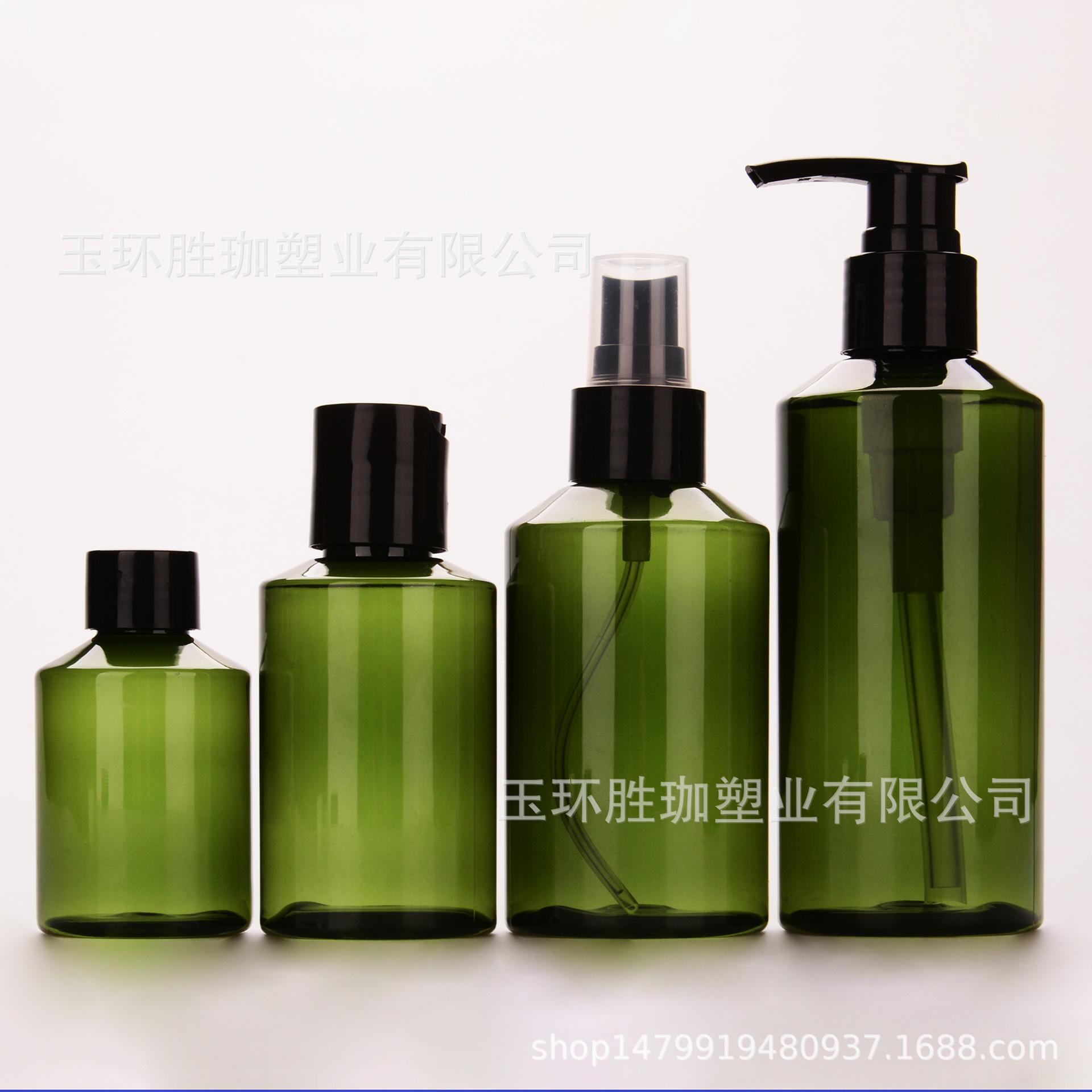 Nuevo producto, botella de plástico PET transparente con tinta verde para cosméticos, botella con pulverizador, limpiador facial, gel de ducha, prensa para botellas.