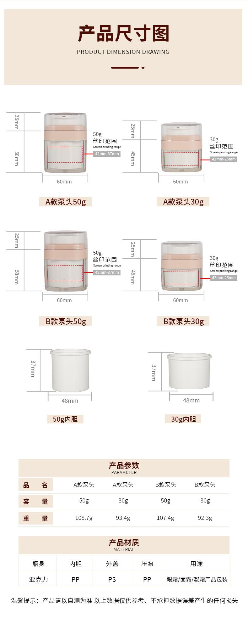 Type a pump head 50g, Type b pump head 30g, Type a pump head 30g, Type b pump head 50g