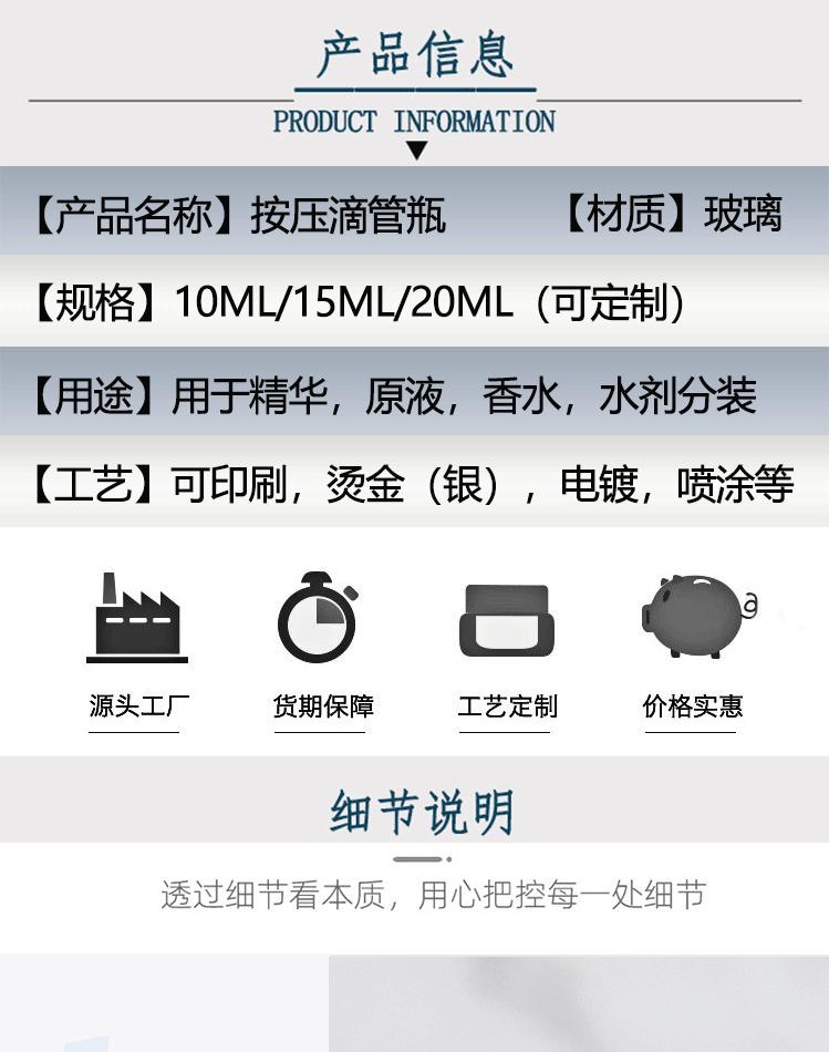 Guangzhou Lizhi Packaging Products Co., Ltd. es una empresa especializada en la producción y el procesamiento de frascos para aceites esenciales, viales, frascos de tubo de tracción, frascos de perfume, frascos roll-on, frascos para cosméticos, frascos de rosca, frascos para líquidos orales, accesorios de envasado, etc. También ofrece tecnologías de posprocesamiento como serigrafía, pulverización, estampado en caliente y galvanoplastia. La empresa ha establecido relaciones de cooperación duraderas y estables con numerosas empresas.