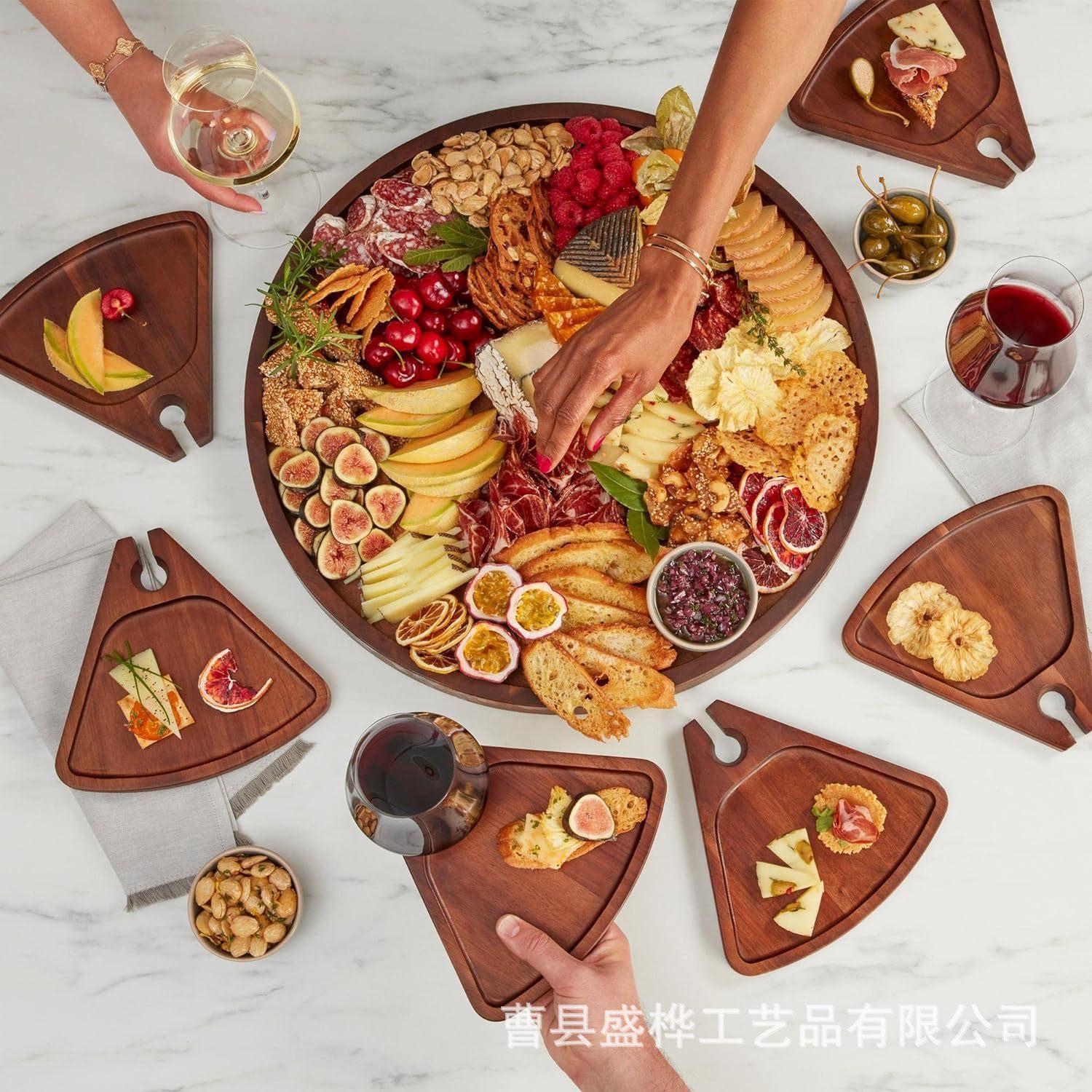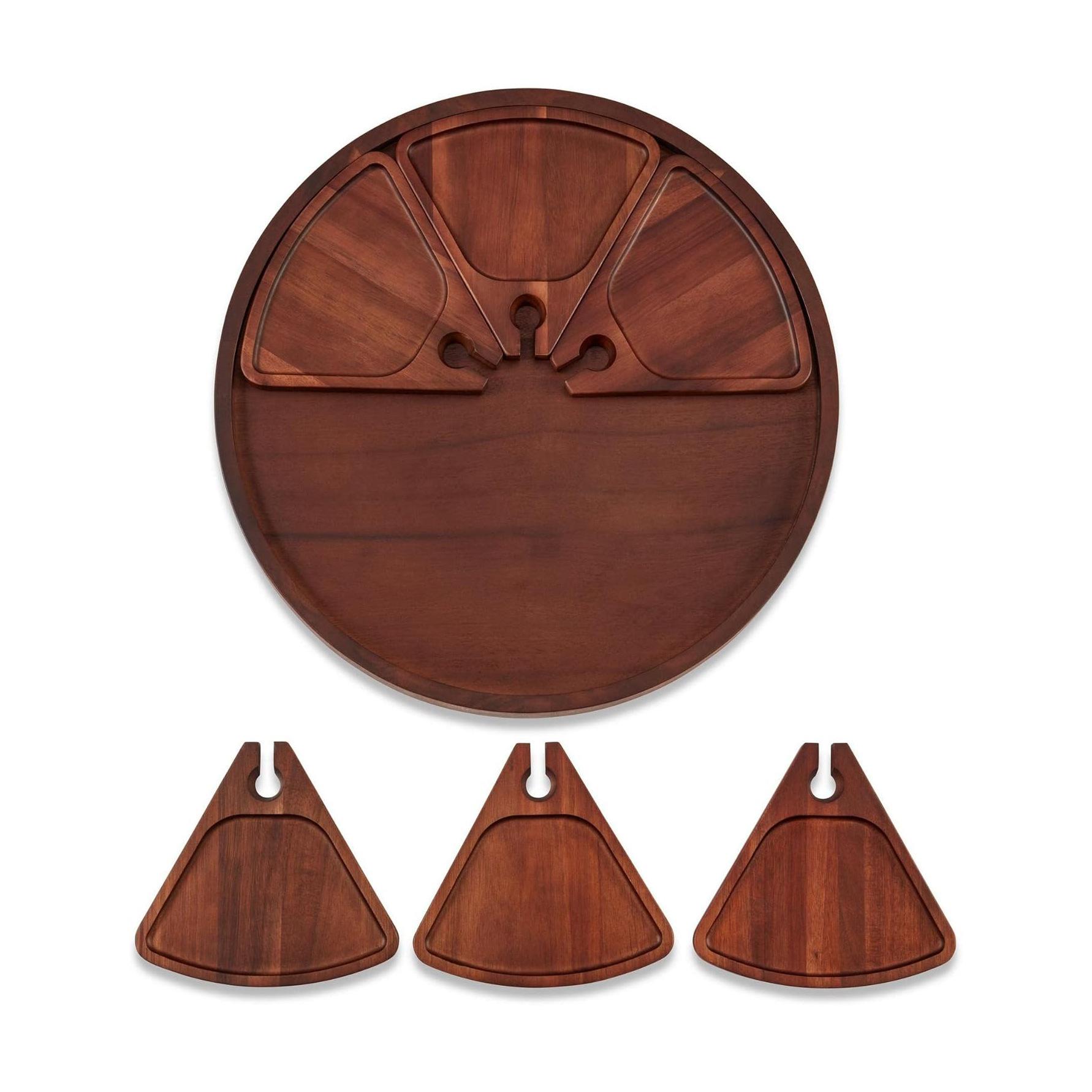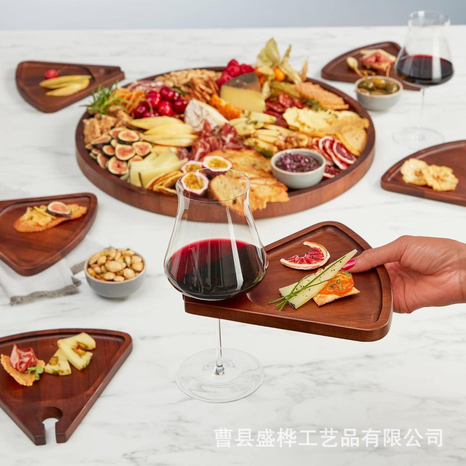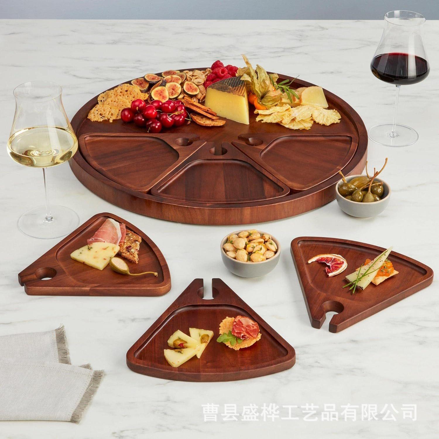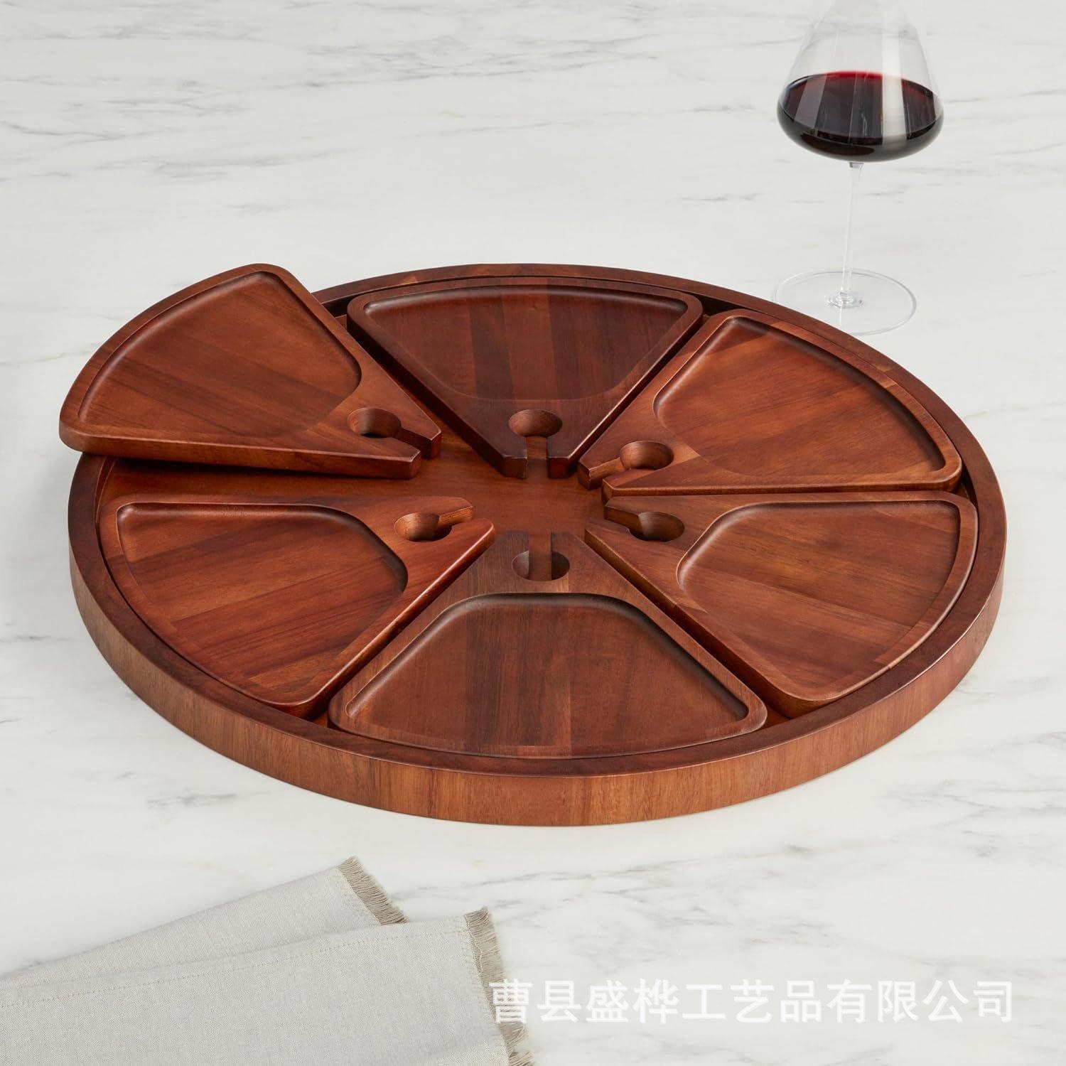Nueva bandeja de madera de acacia se puede empalmar bandeja redonda para frutas y bocadillos madera maciza soporte integrado para copas de vino tinto
