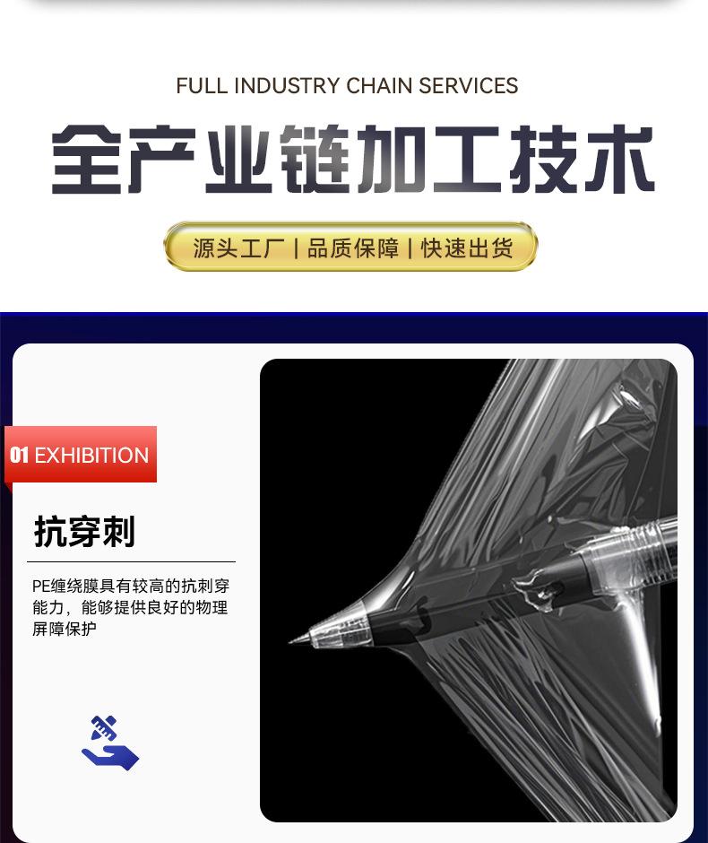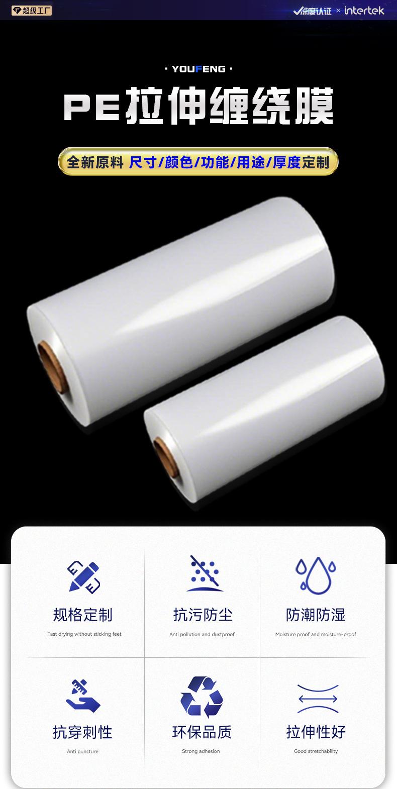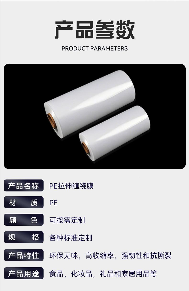 Película de embalaje de PE, película estirable transparente para embalaje, película de refuerzo para bandejas, película de embalaje para transporte logístico, rollo grande, película industrial para conservación de alimentos frescos.