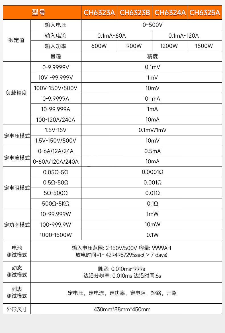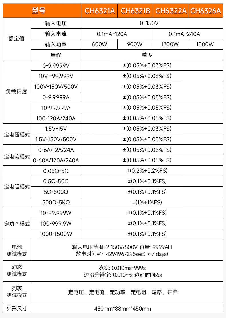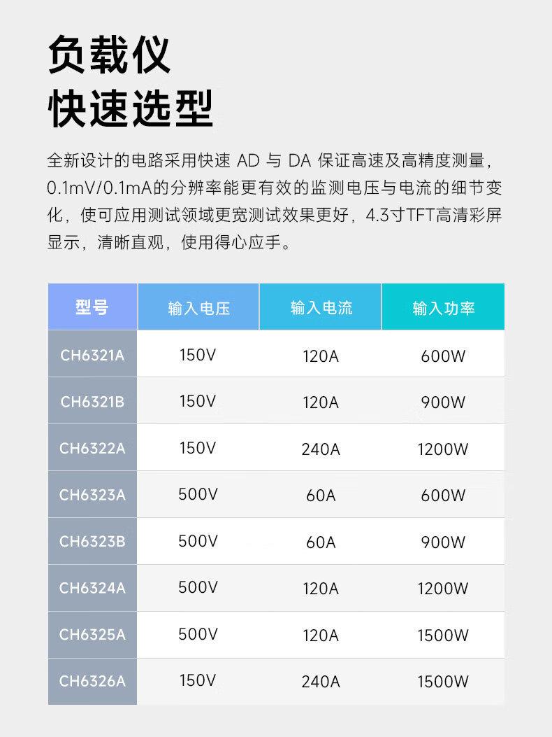 CH6321A(600W 150V 120A), CH6321B(900W 150V 120A), CH6322A(1200W 150V 240A), CH6323A(600W 500V 60A), CH6323B(90...