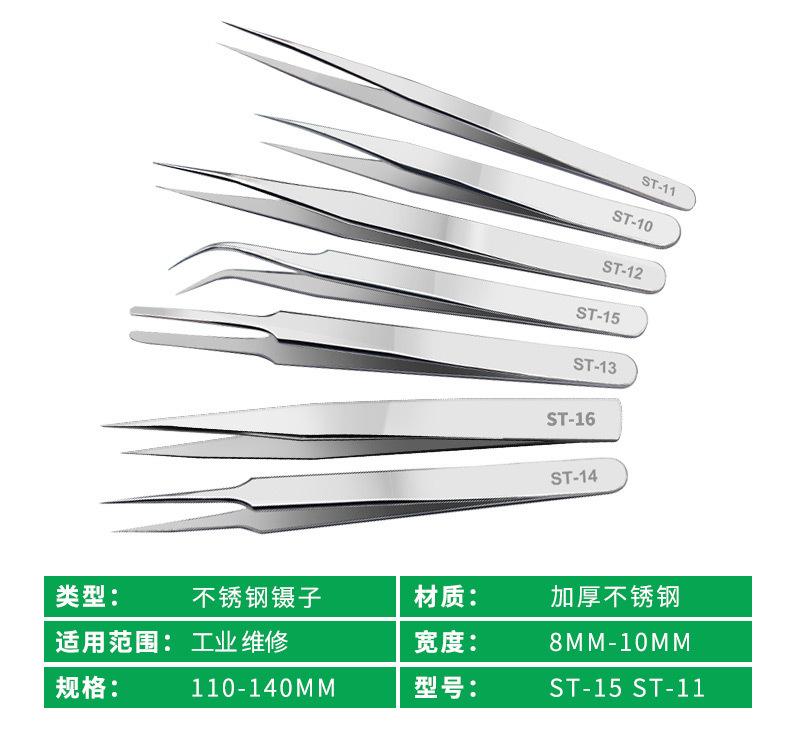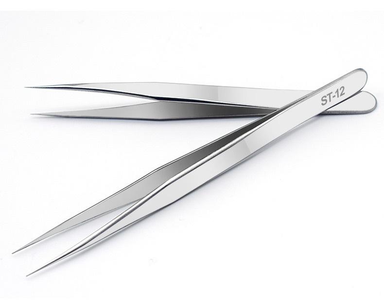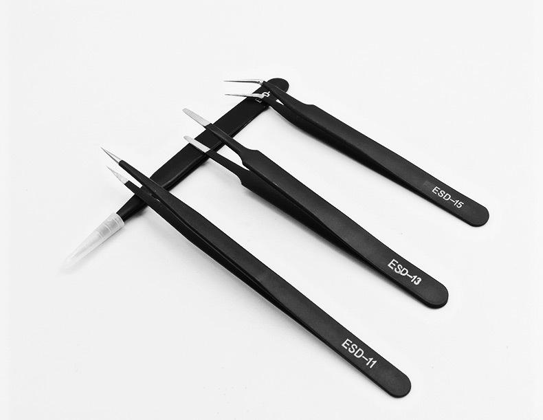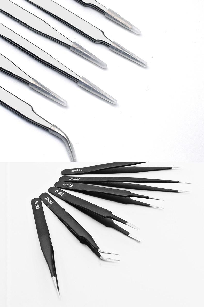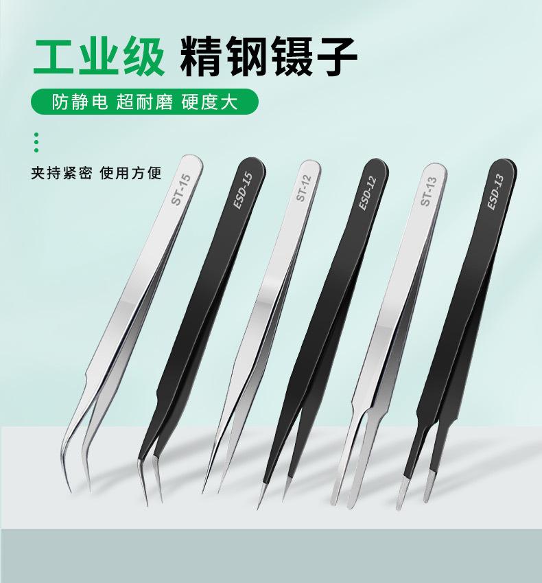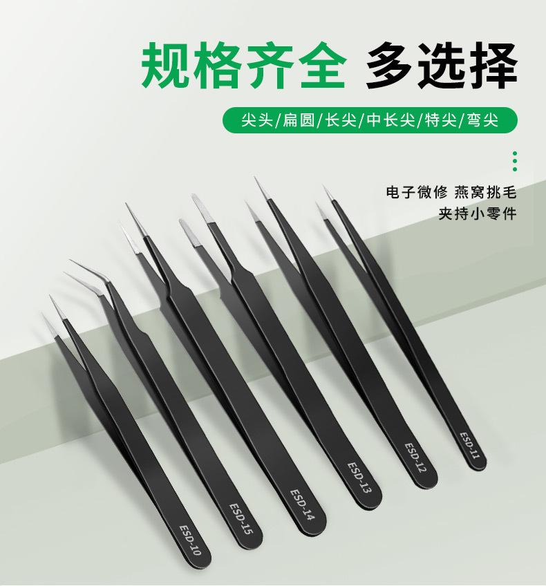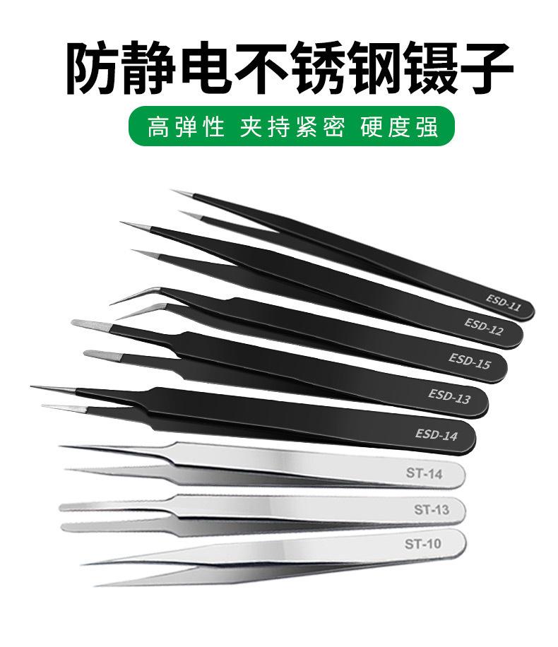 Pinzas de fábrica de acero inoxidable de alta precisión para reparación de herramientas electrónicas, pinzas pequeñas industriales antiestáticas con punta fina y codo.