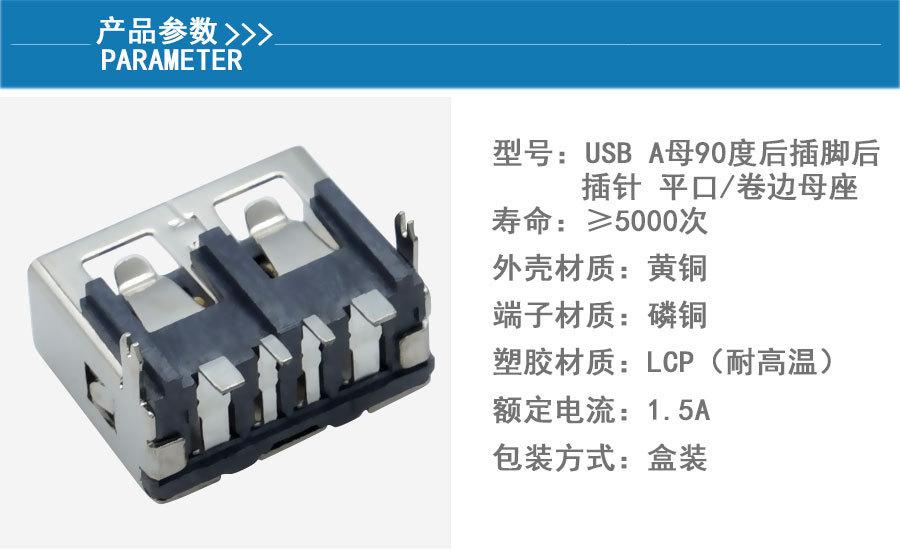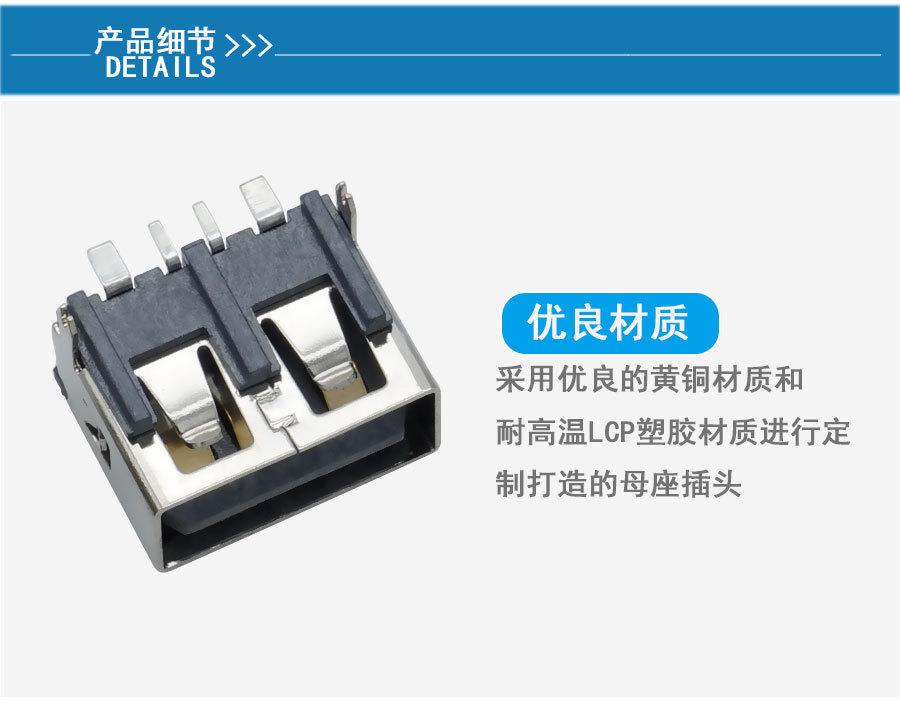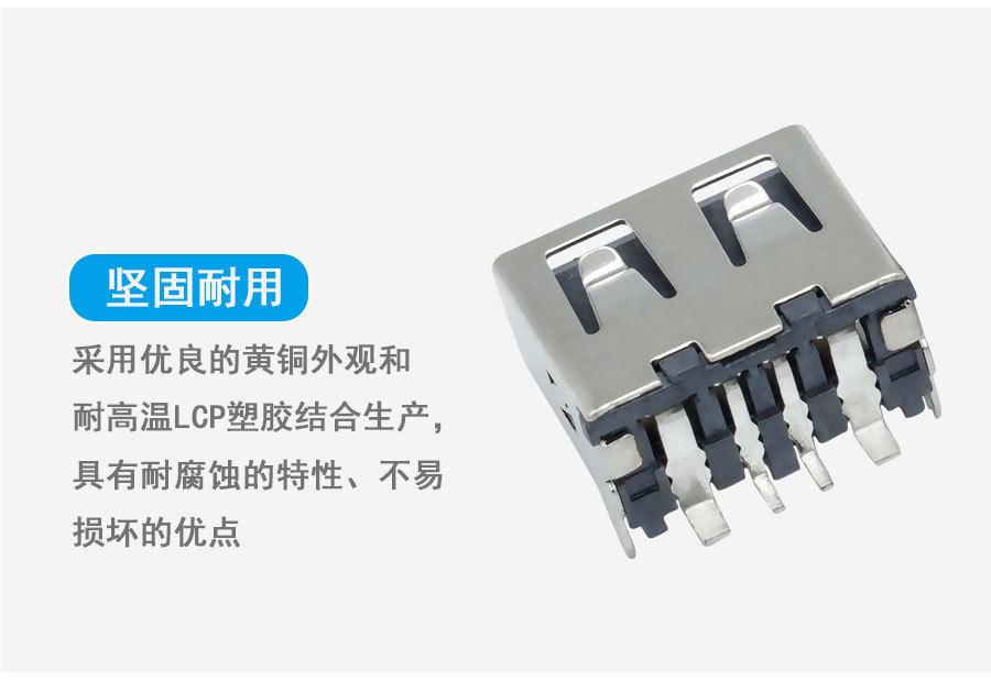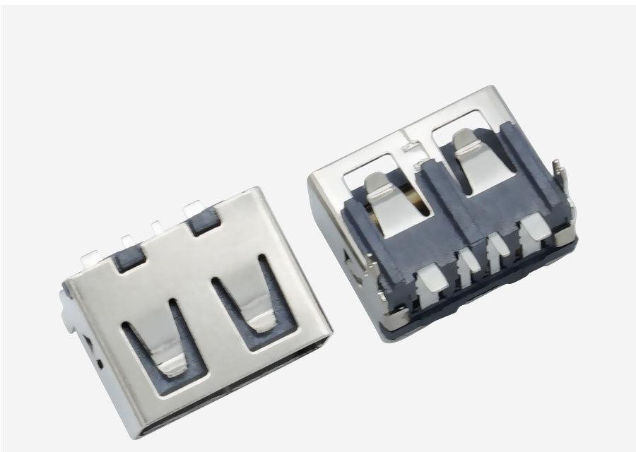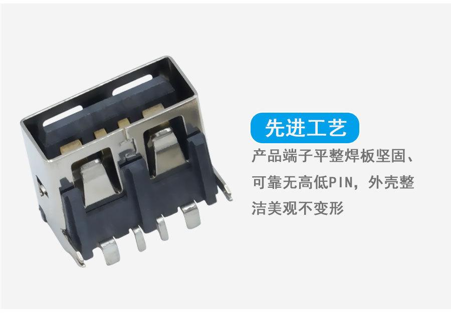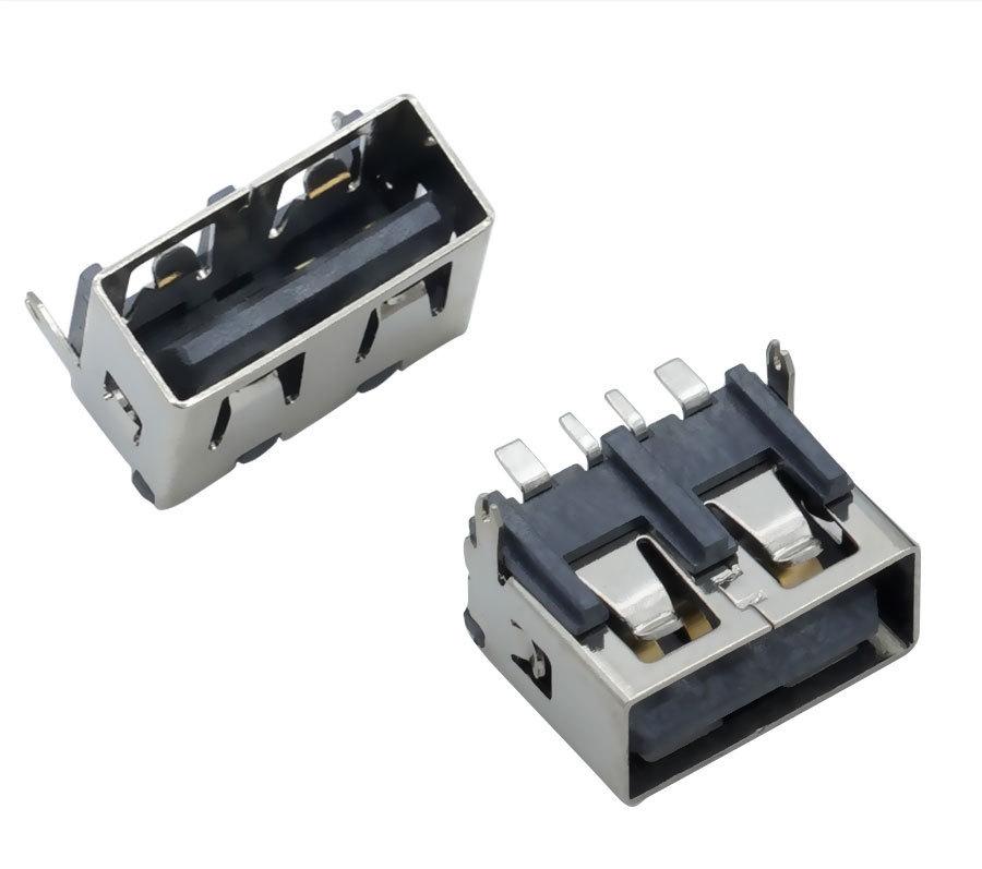 Suministro de conector USB tipo A hembra de cuerpo corto 10.0, asiento hembra plano AF90 grados, base recta de goma negra.