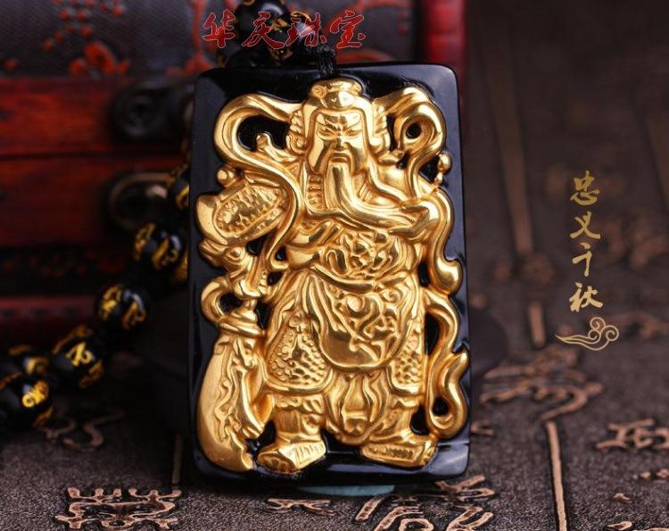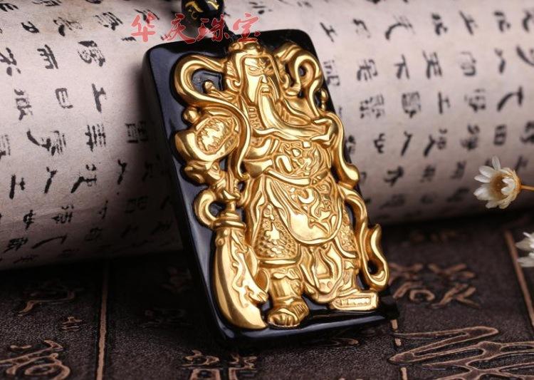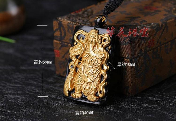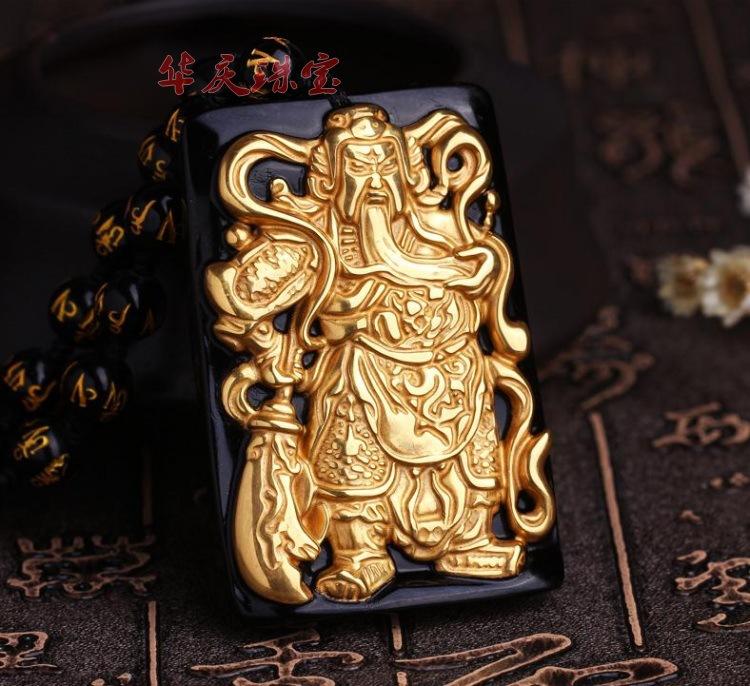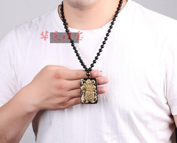 Collar con colgante de obsidiana Guan Gong al por mayor de fábrica para hombre, chapado en oro, cadena larga tipo suéter para hombre y mujer, joyería
