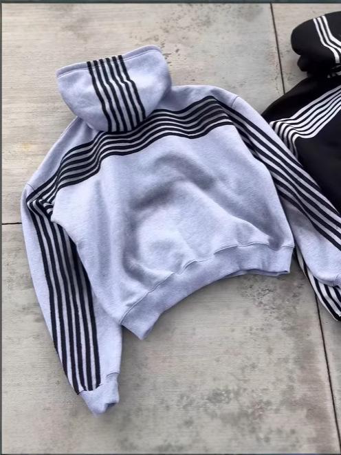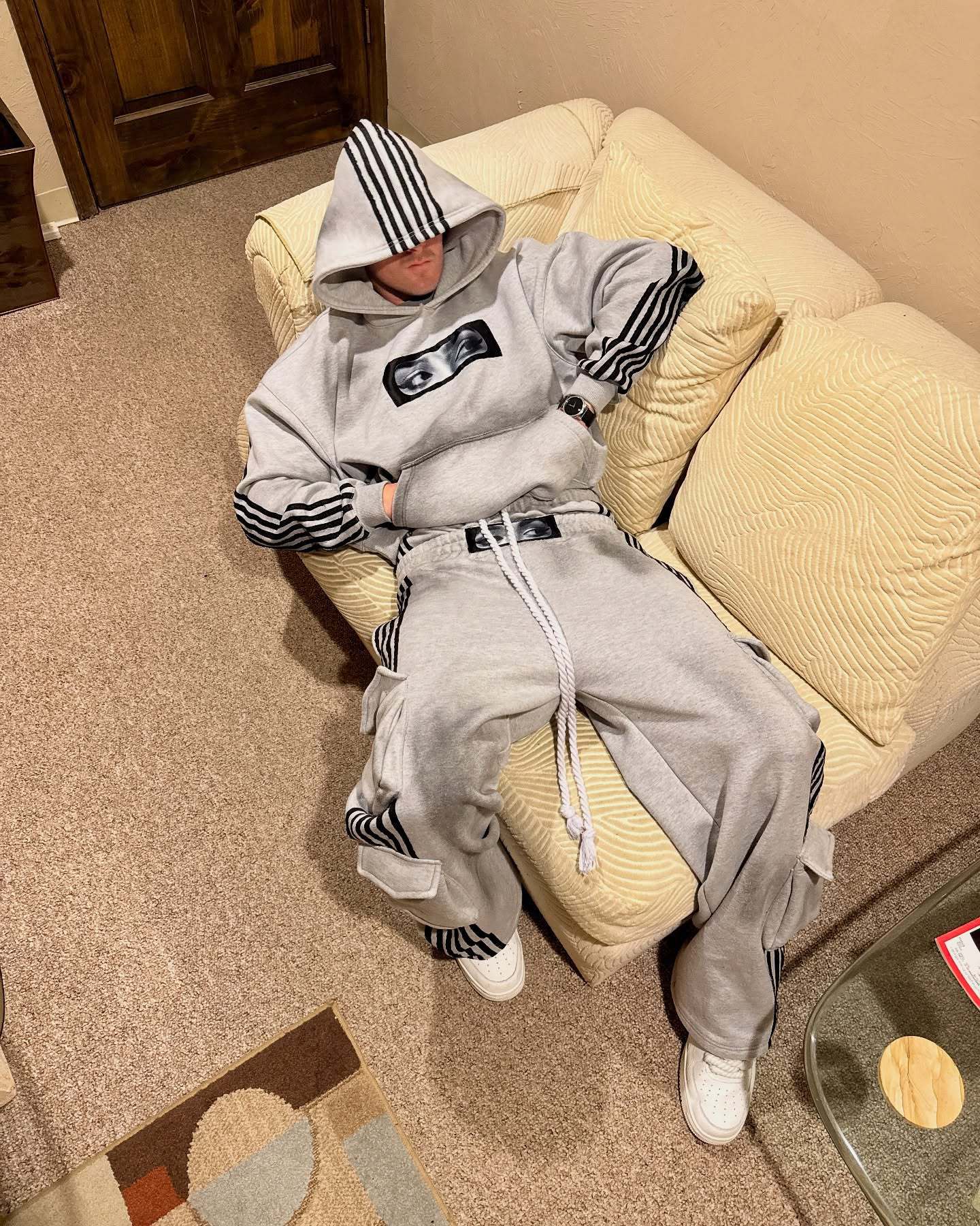 Black sweatshirt, Black pants, Gray sweatshirt, Gray pants