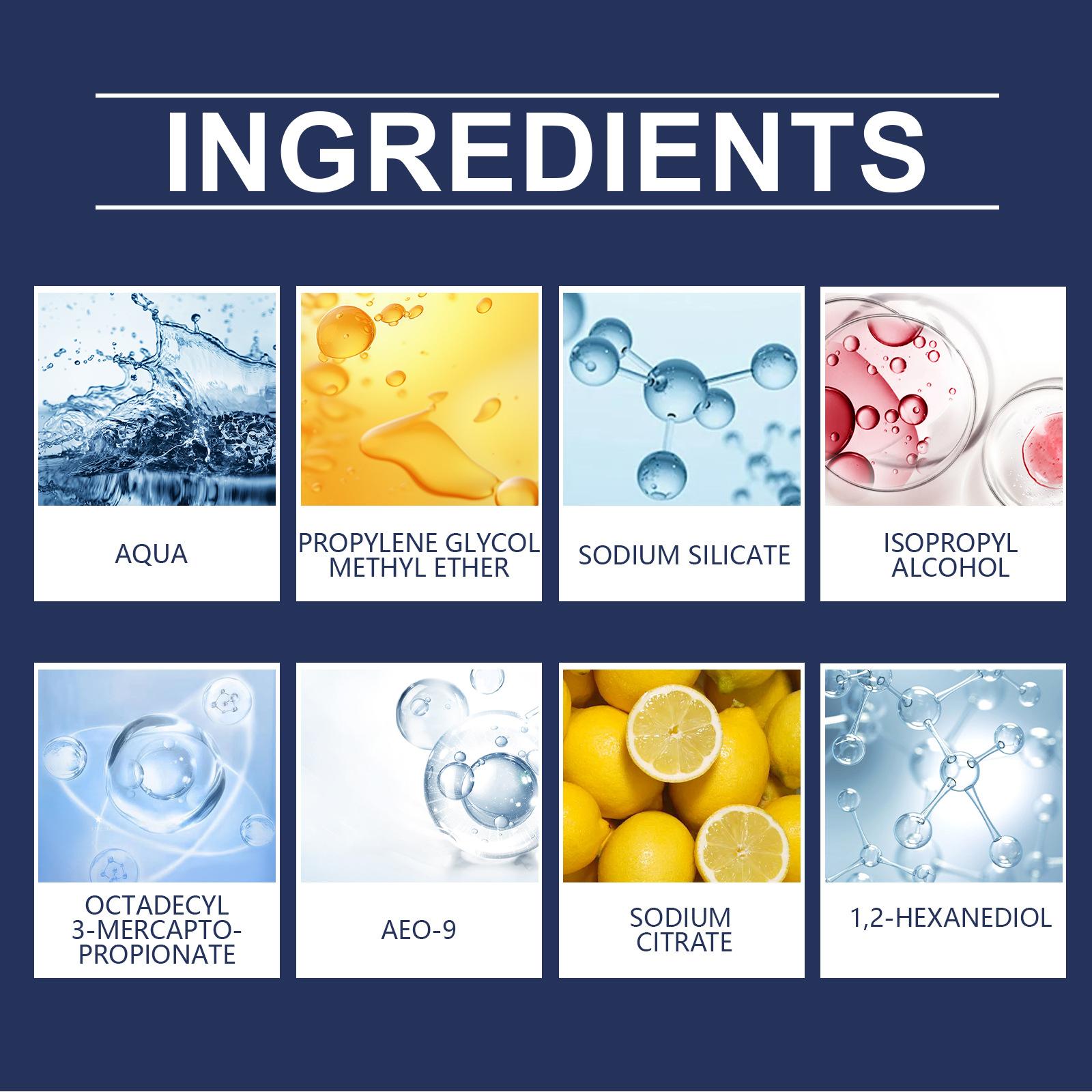 Water, propylene glycol methyl ether, sodium silicate, isopropyl alcohol, 3-thiopropionic acid octadecyl ester...