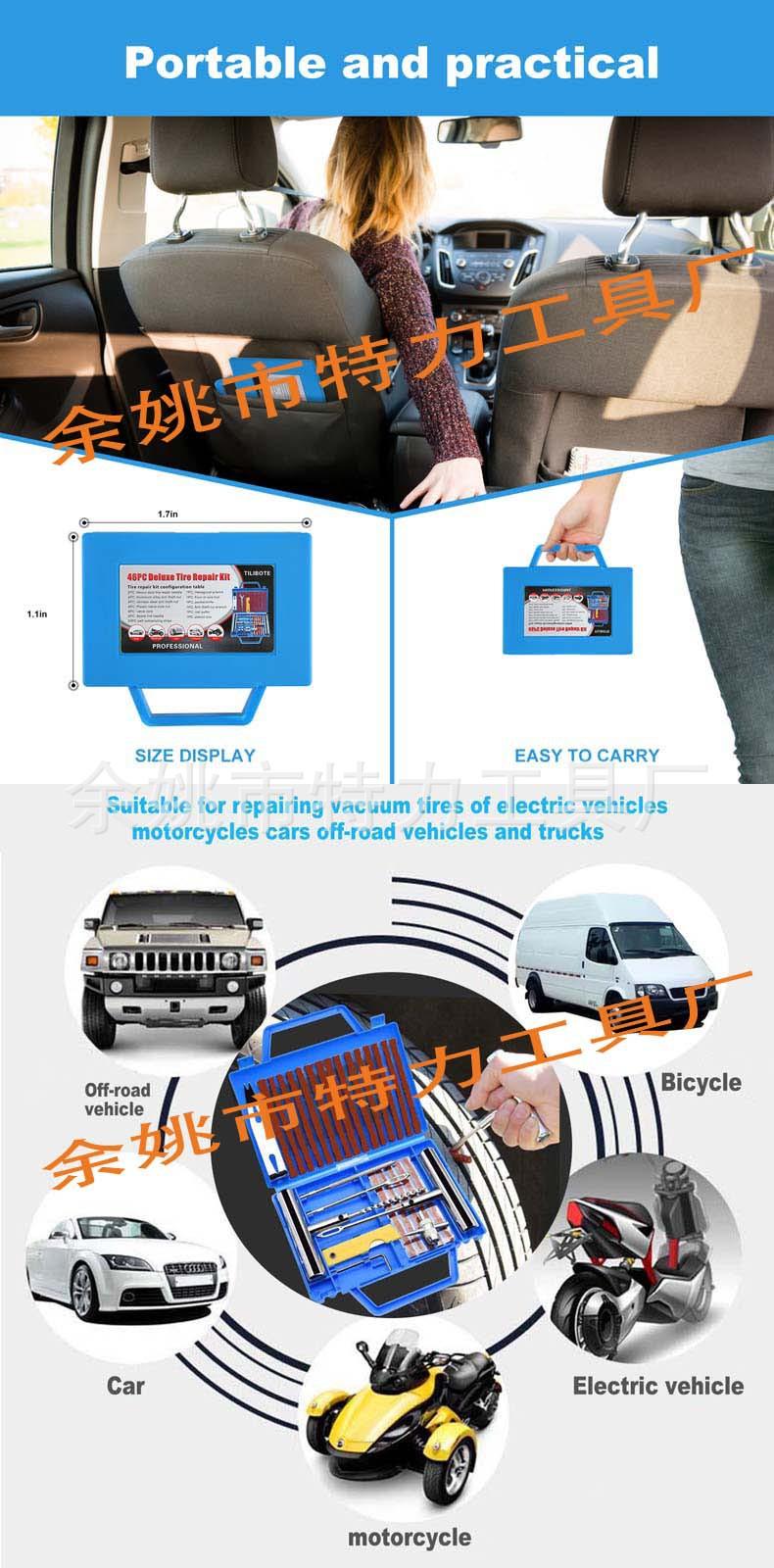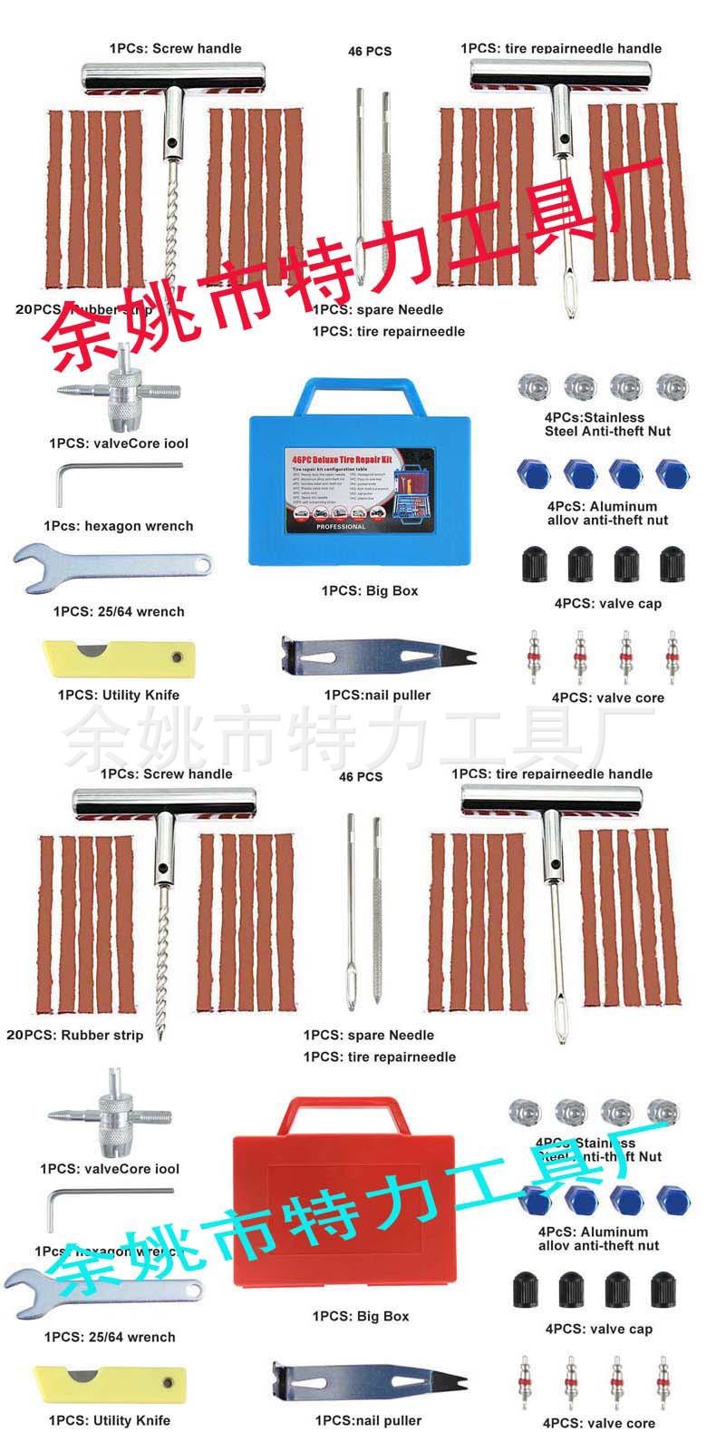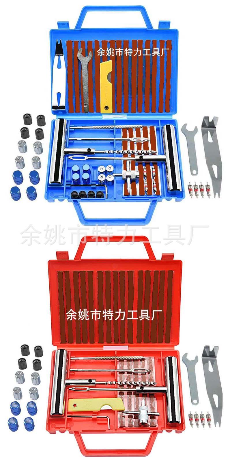 Juego de herramientas de reparación de neumáticos de 46 piezas Colores del producto: azul, rojo, amarillo, tamaño único: 17.3X15X25cm, peso individual 486 gramos, tamaño de la caja exterior:38X31.5X18.5