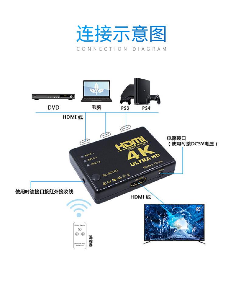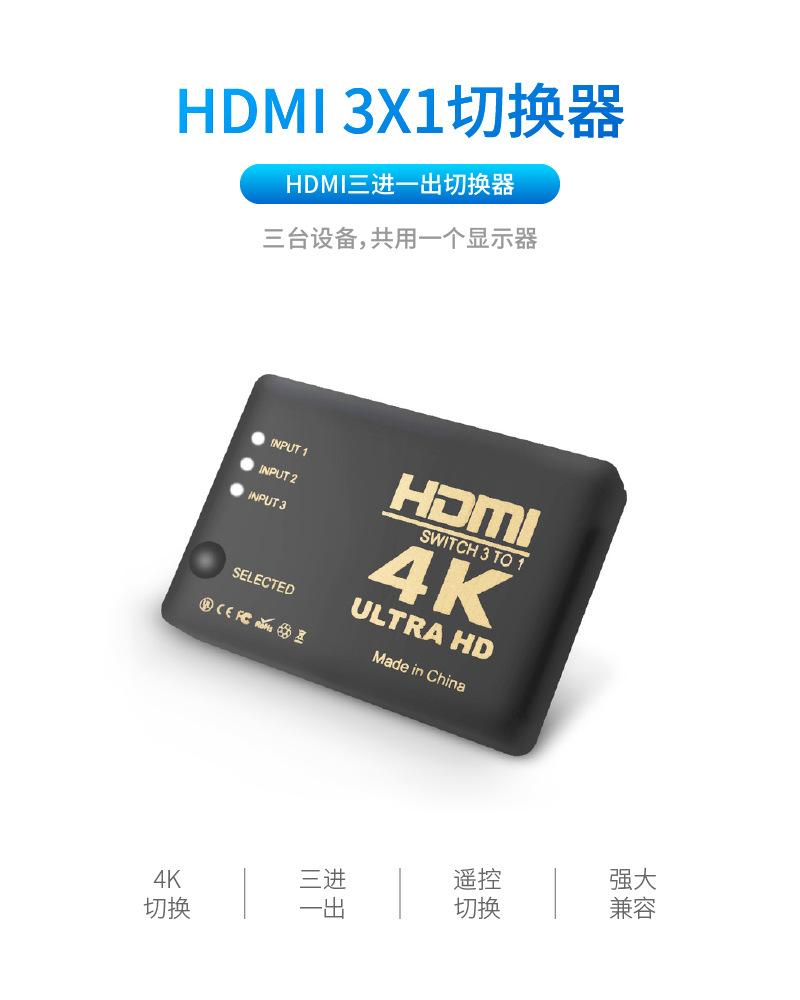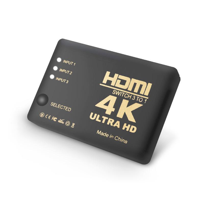 Este conmutador de alto rendimiento con 3 entradas HDMI y 1 salida de audio digital/analógico HDMI es compatible con la función de repetidor HDCP y la conmutación rápida de puertos de entrada HDMI. Además de ser compatible con todos los formatos HDTV hasta 4Kx2K, el sistema también es compatible con todos los formatos de TV 3D. Además, los usuarios pueden seleccionar la fuente de señal a voluntad mediante el control remoto, lo que resulta muy práctico.