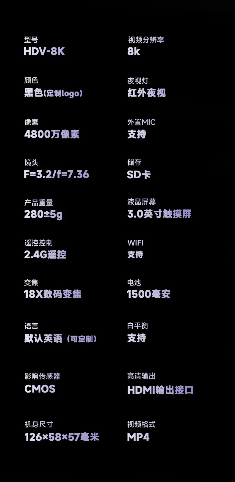 Camera function, Recording function, Support wifi, Night photography function