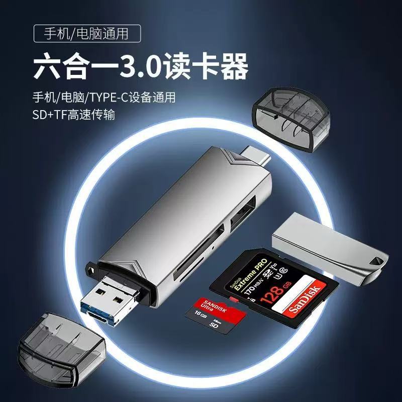 Lector de tarjetas OTG multifunción seis en uno para ordenador, teléfono móvil, lector de tarjetas universal tipo C con puerto USB 3.0