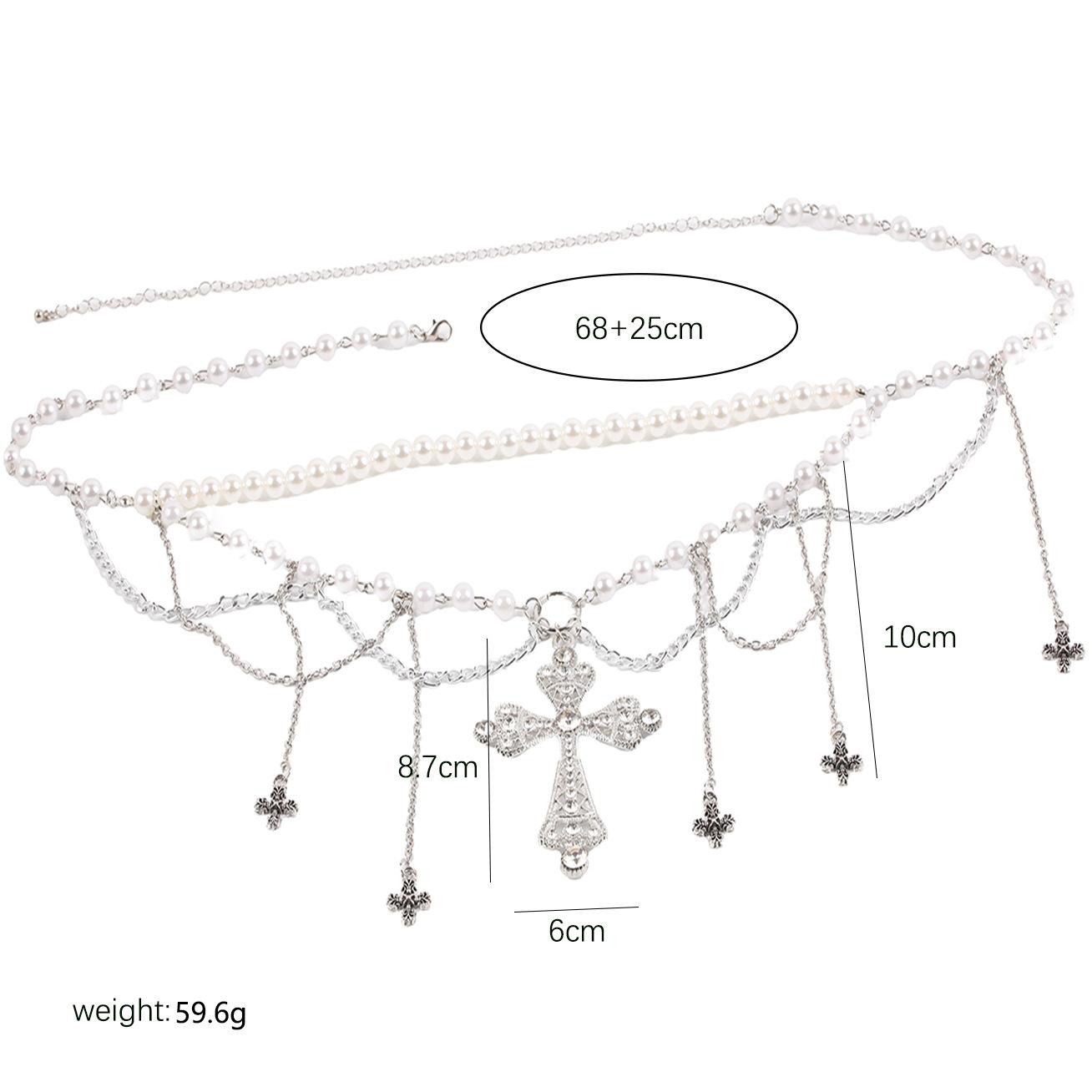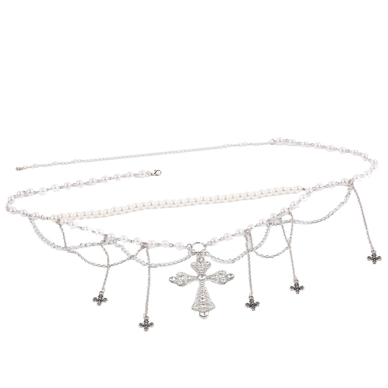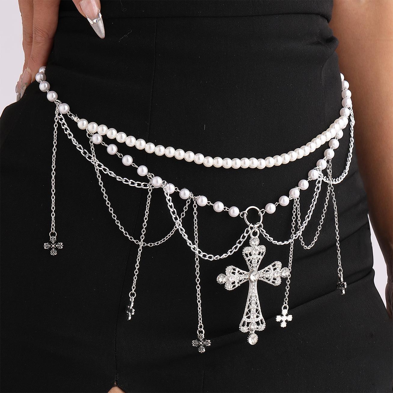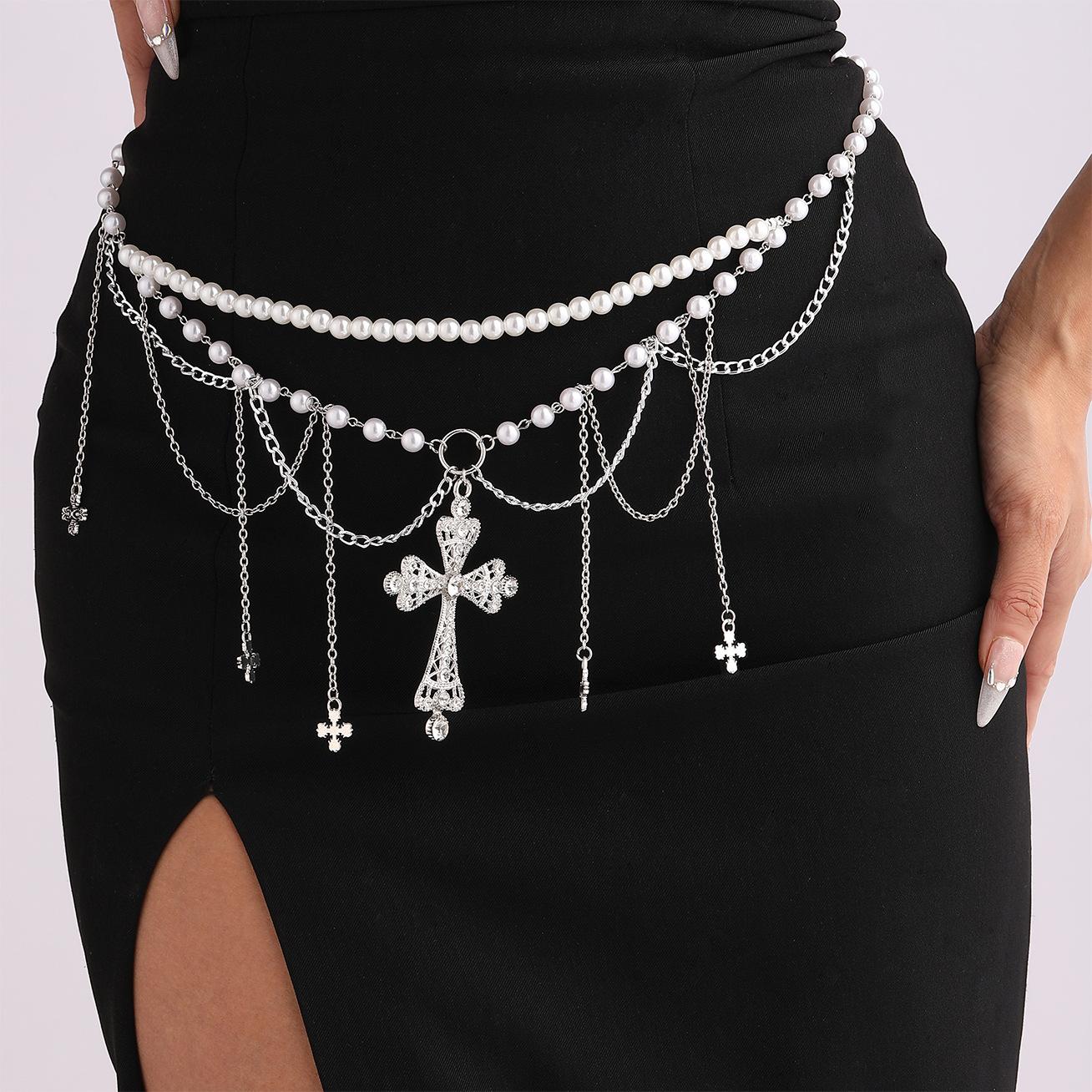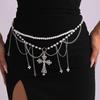 Joyería Transfronteriza Europea y Americana Sexy Cadena de Cintura con Borla de Cruz Metálica Decoración para Mujer Perla de Imitación Vintage con Cuentas Cadena para el Cuerpo