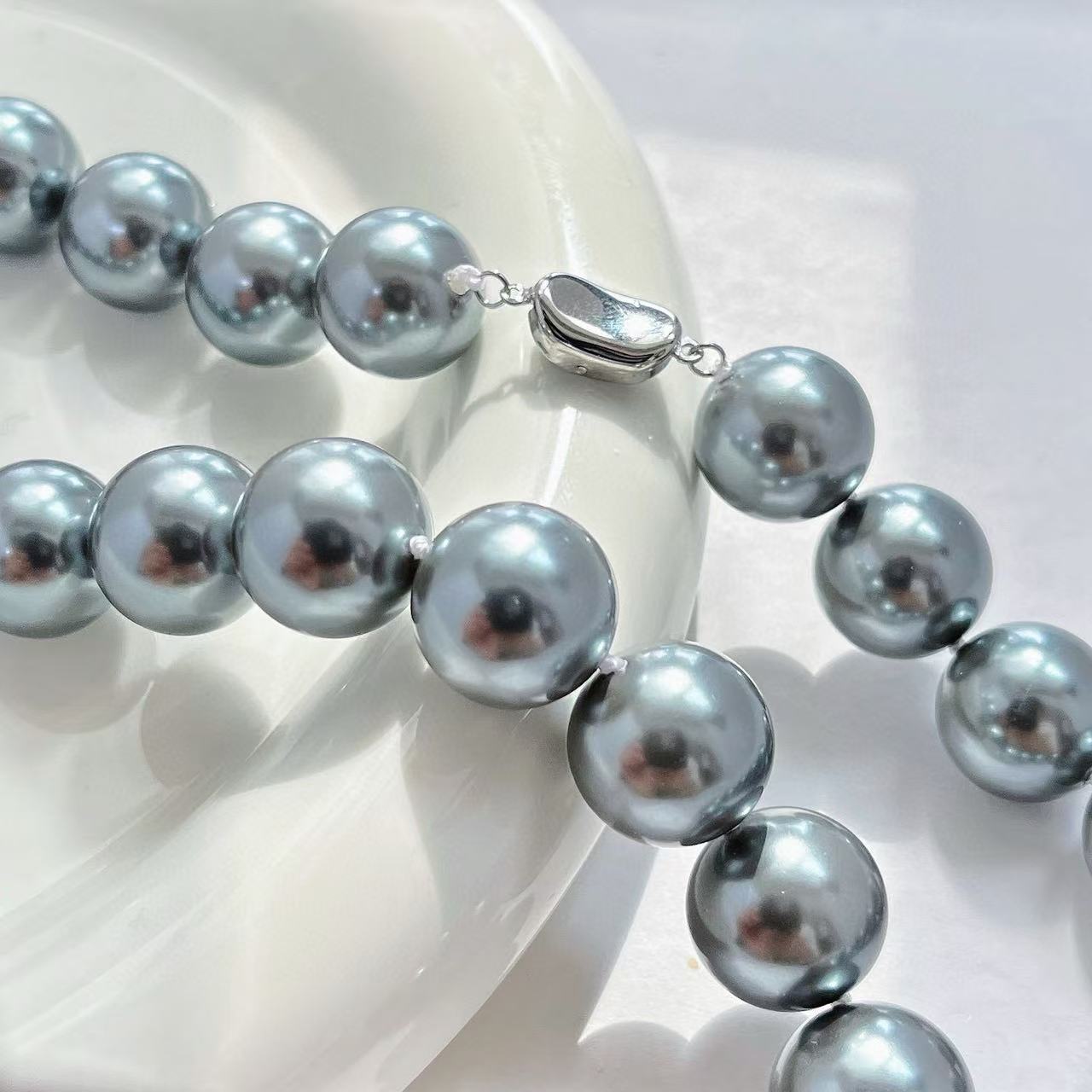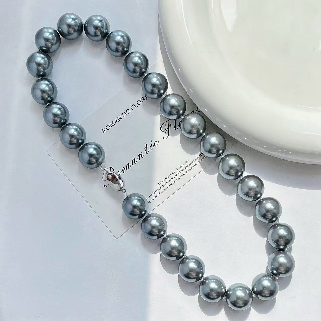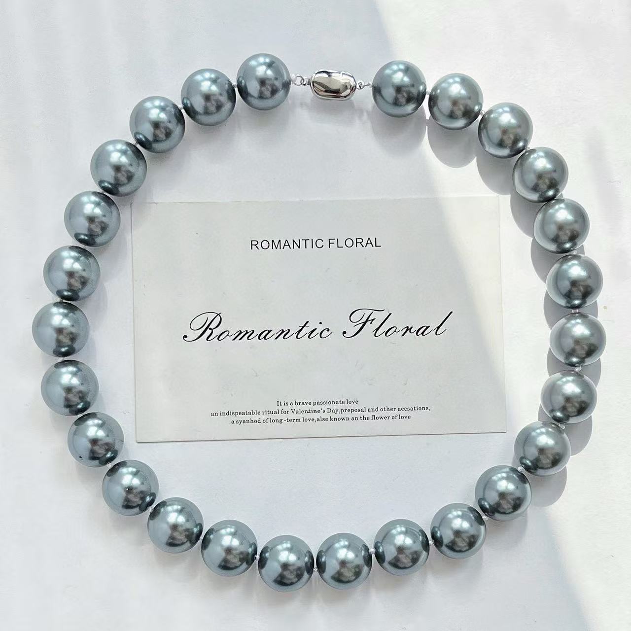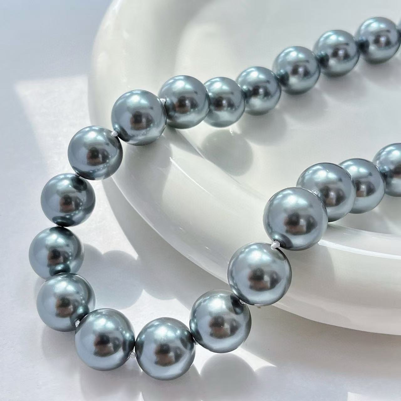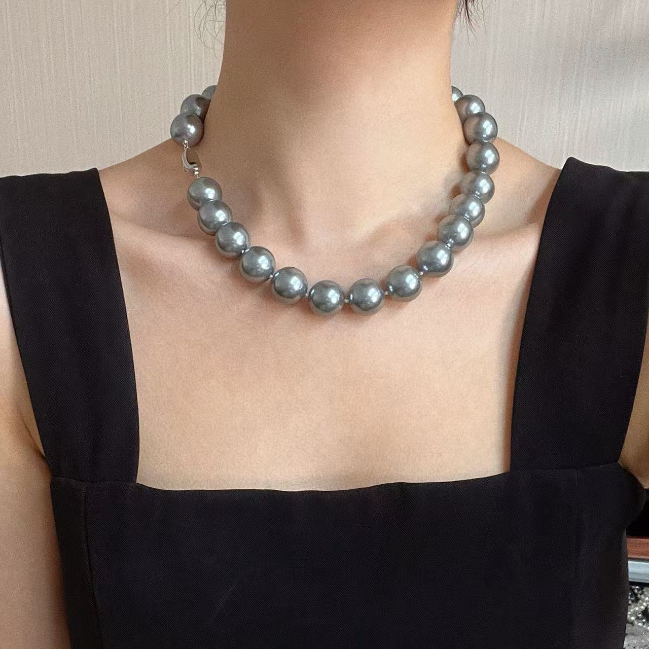 Collar de perlas de cristal artificial de alta calidad con resorte de 16 mm, grano grande, redondo, gris verdoso, cadena para clavícula