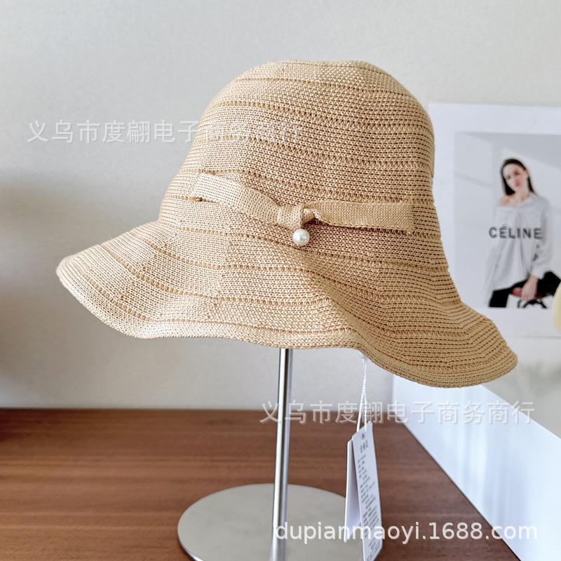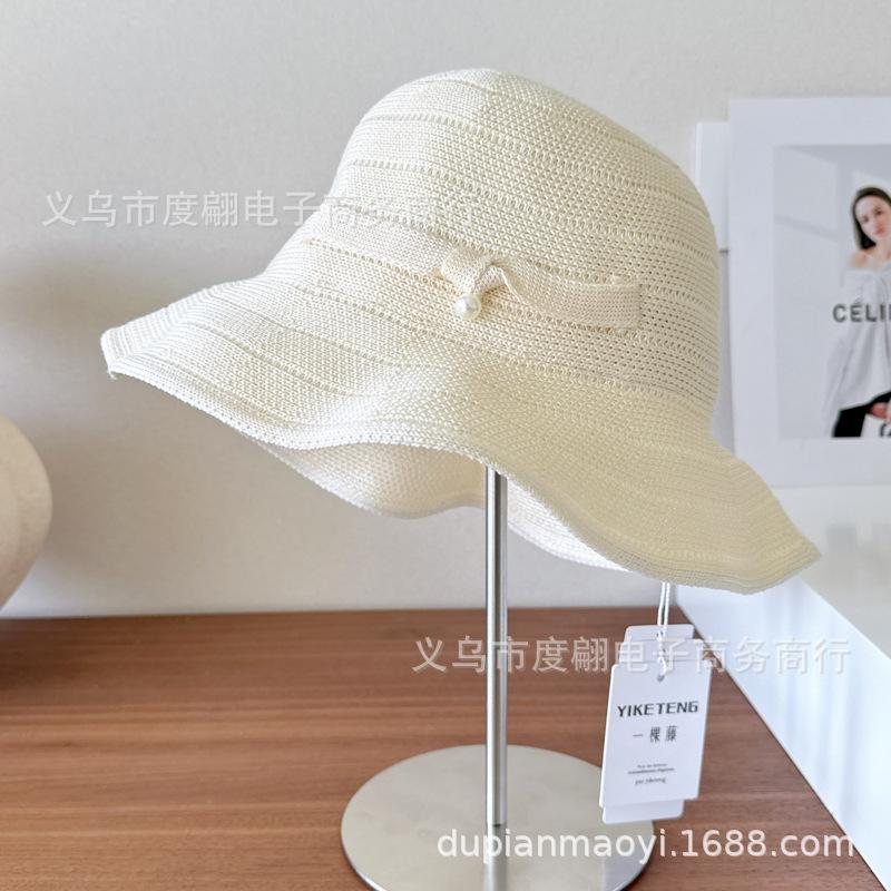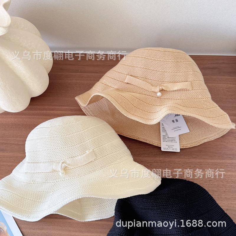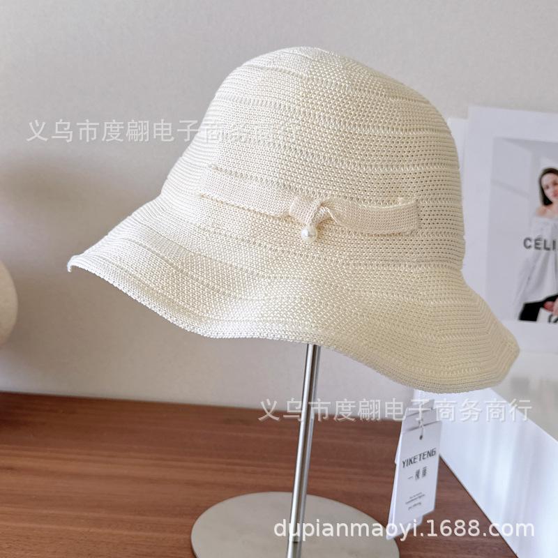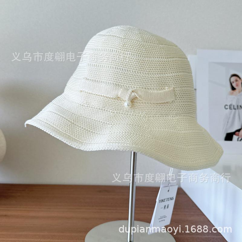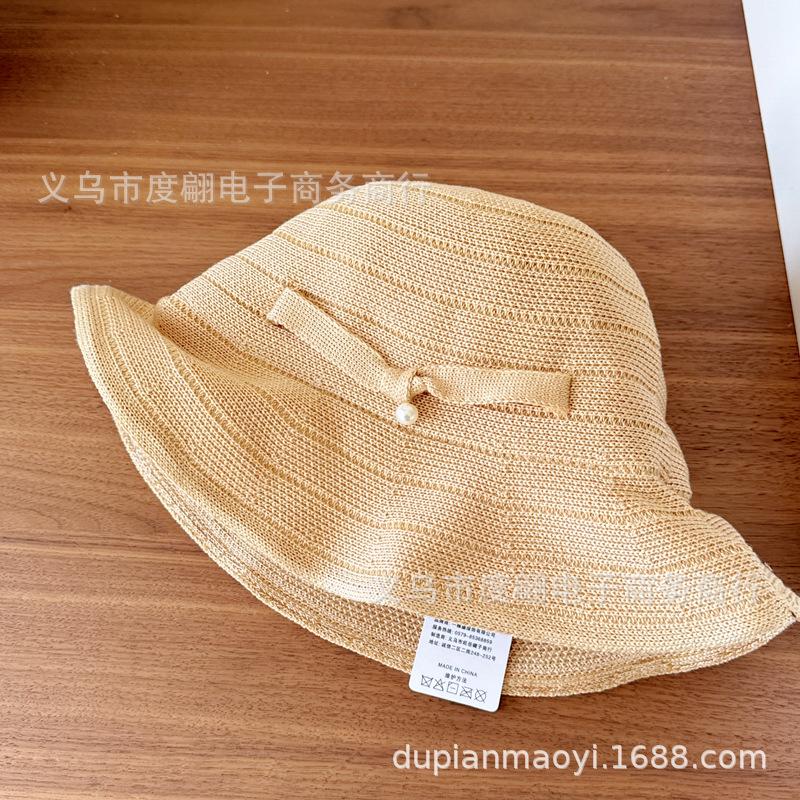 Zg sombrero de pescador de tencel transpirable para niños, sombrero de punto de verano para protección solar, sombrero de cubo con lazo de perlas, sombrero para el sol, moda