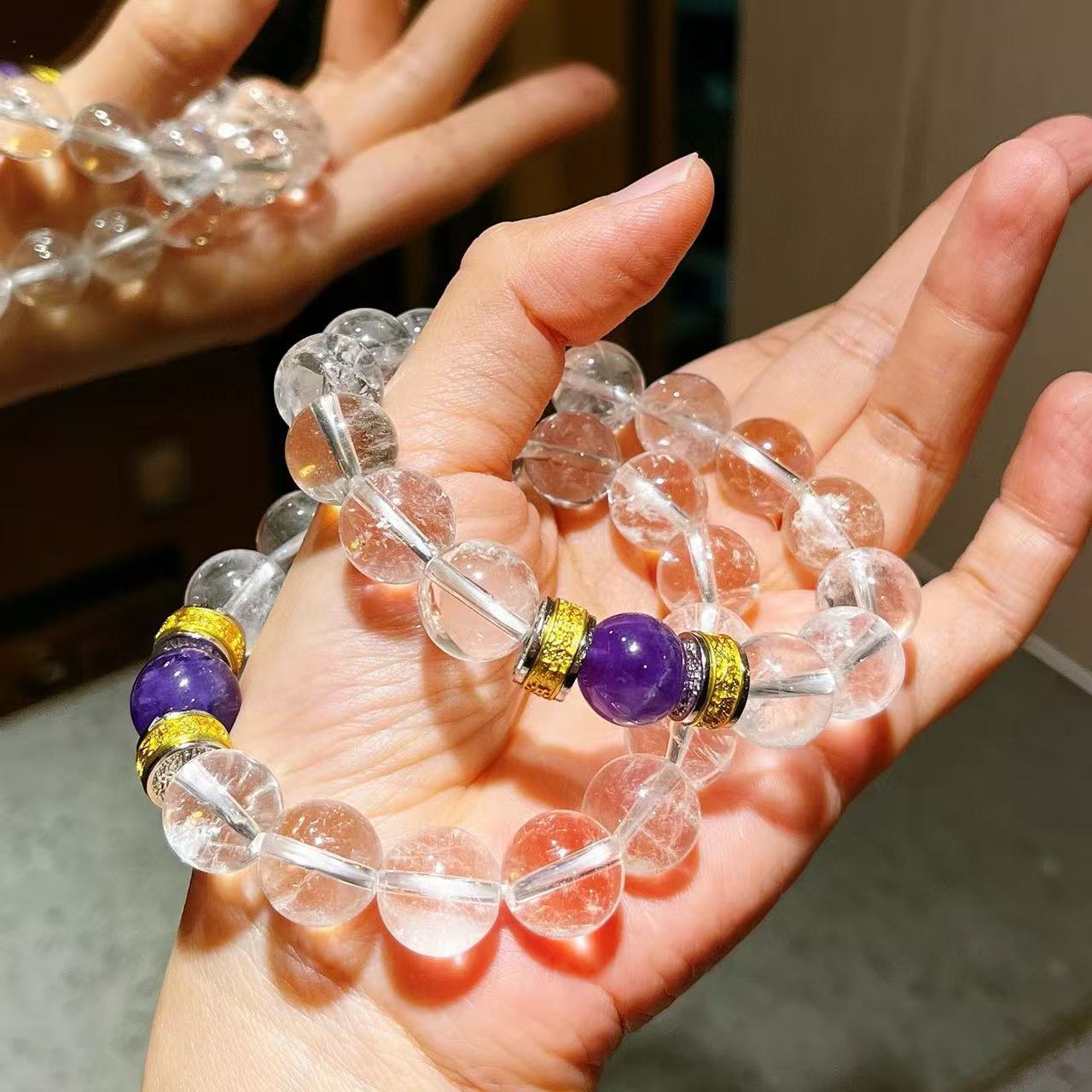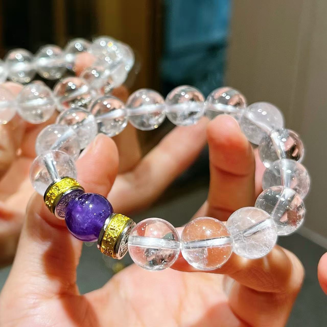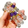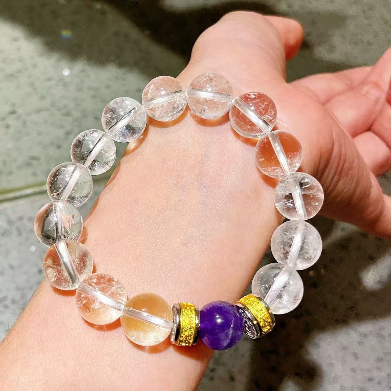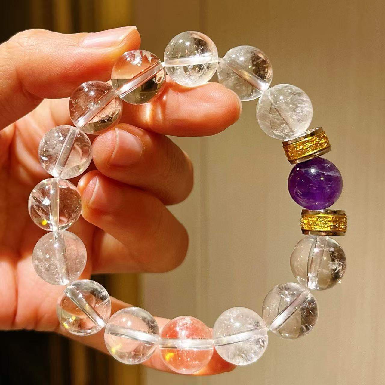 Pulsera de cristal blanco natural de grano grande de 12 mm con diseño de amatista