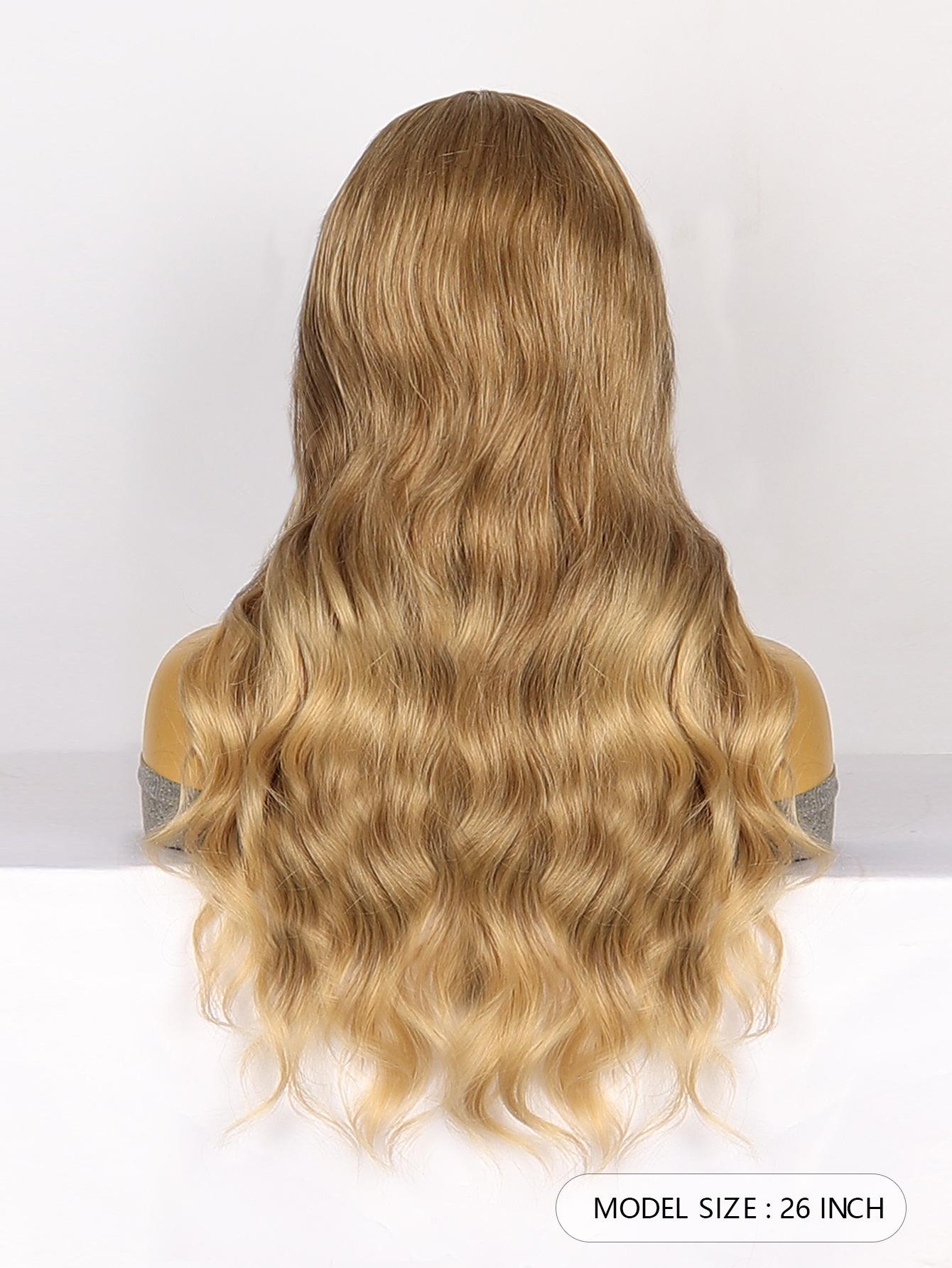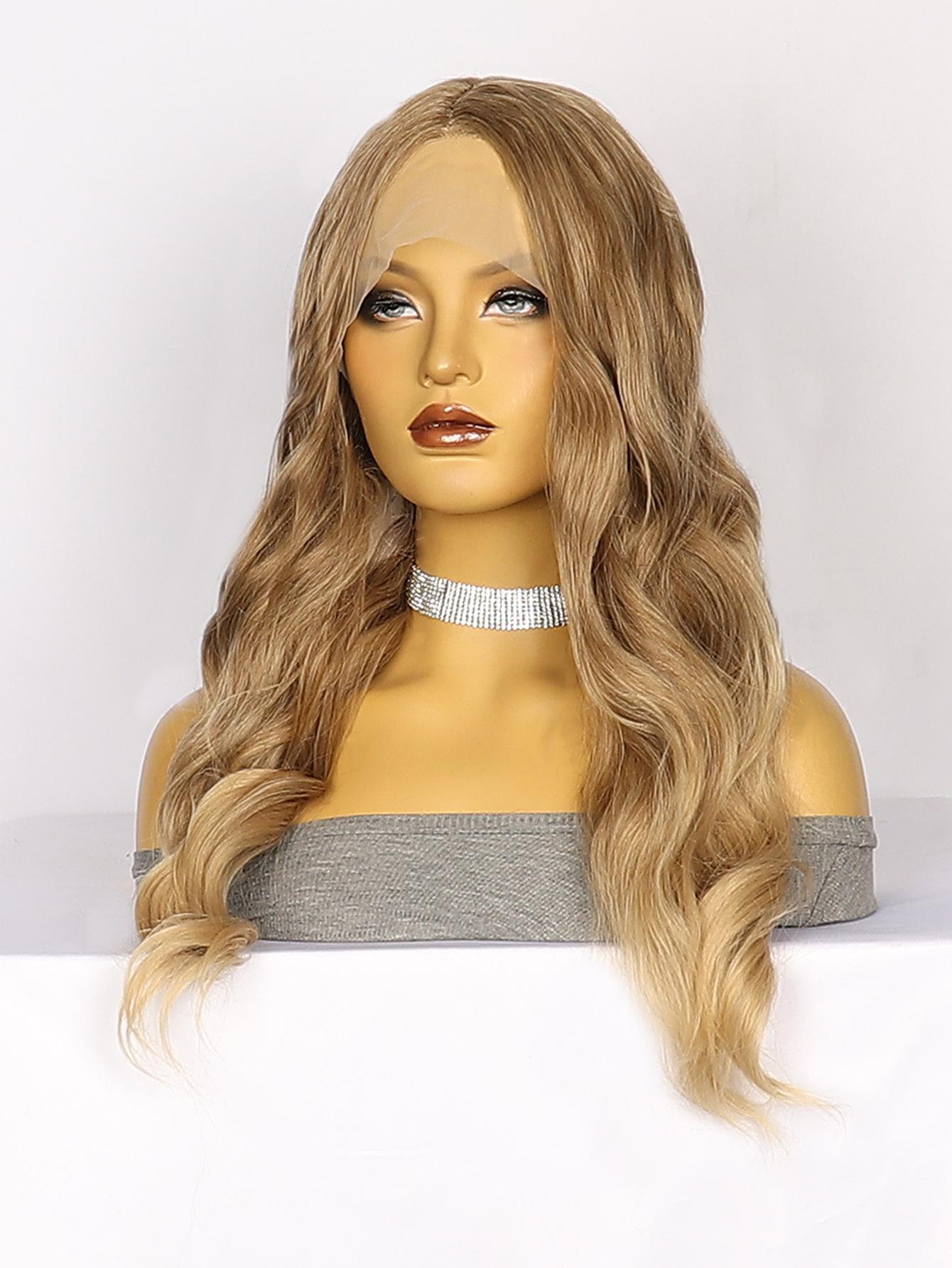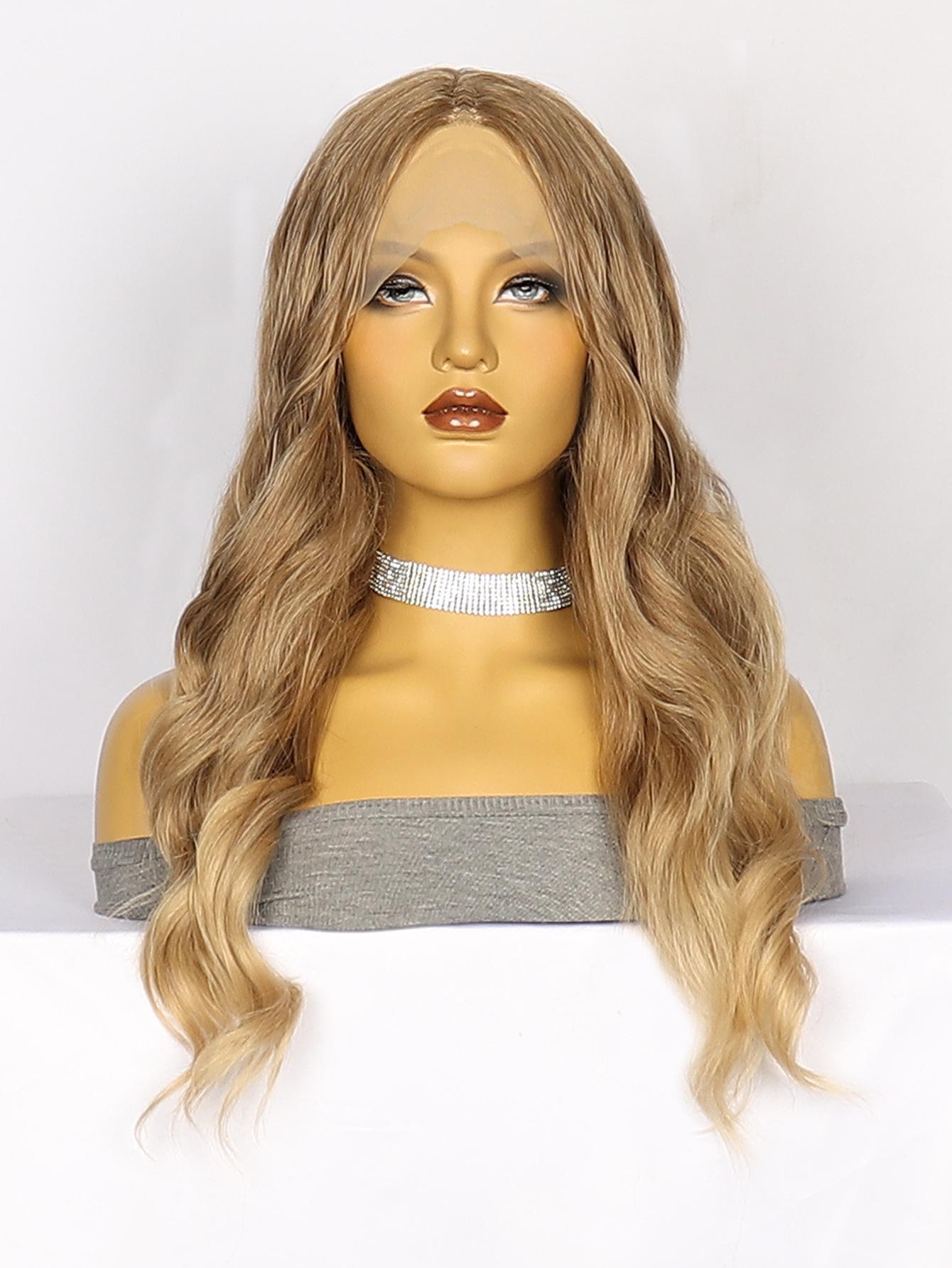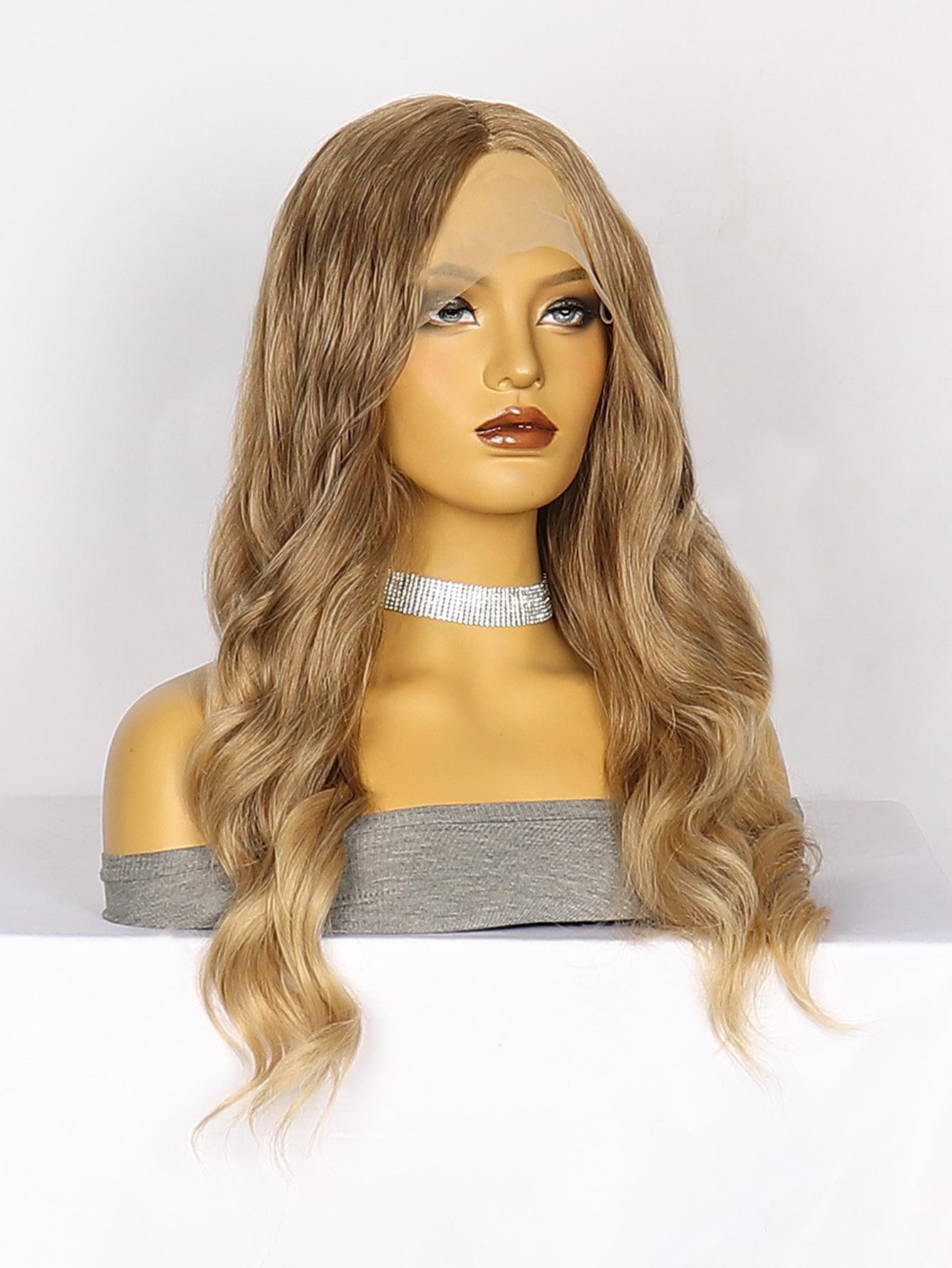 ![]() Peluca de encaje con reflejos marrones, cabello largo y rizado con raya en medio, tocado de fibra química para mujer, disponible para entrega