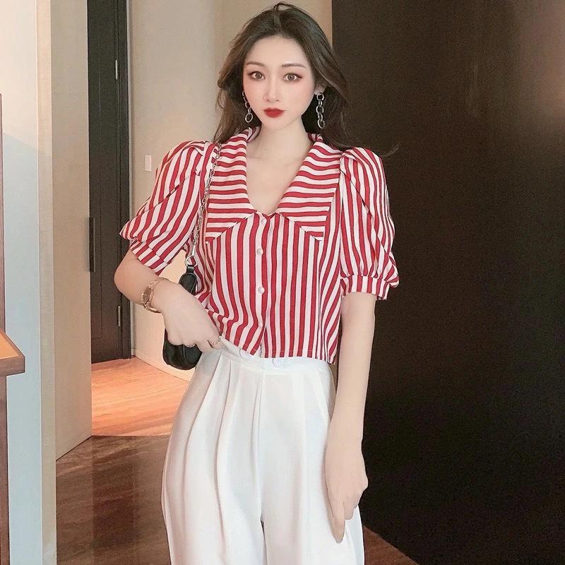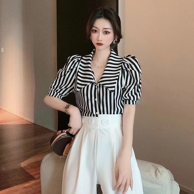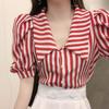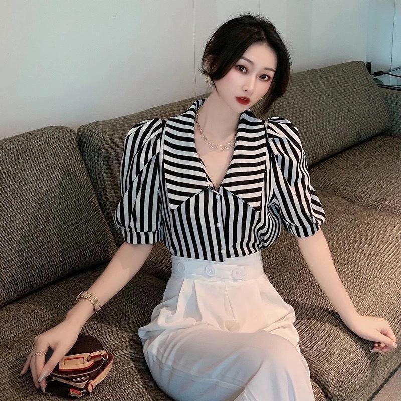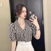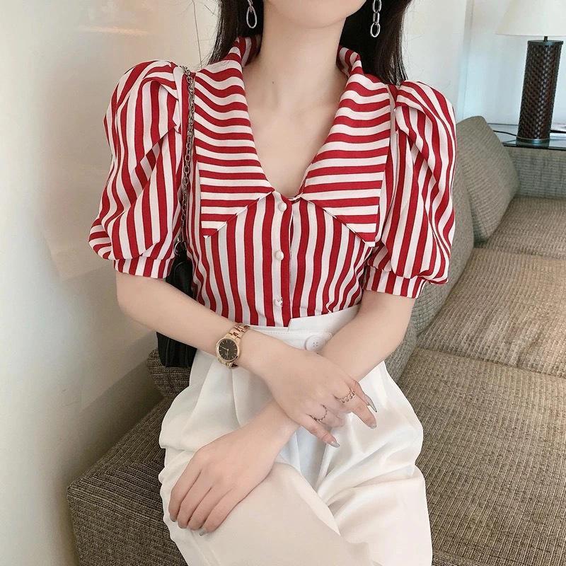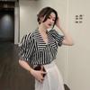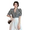 Blusa Vintage de Rayas Manga Corta Abullonada para Mujer Verano Nuevo Sentido del Diseño Nicho Suelta Adelgazante Forro