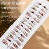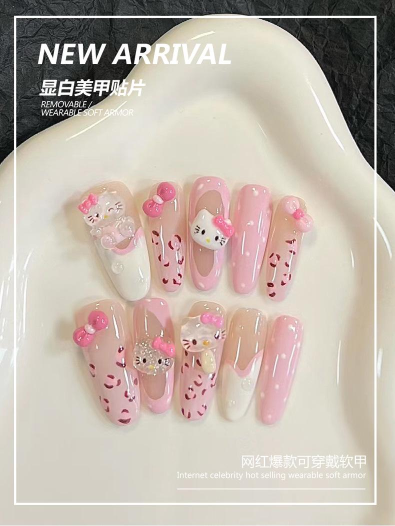 Armadura explosiva con lindo gato de dibujos animados, pajarita, parche para uñas hecho a mano, color rosa, blanco leche, uñas postizas francesas