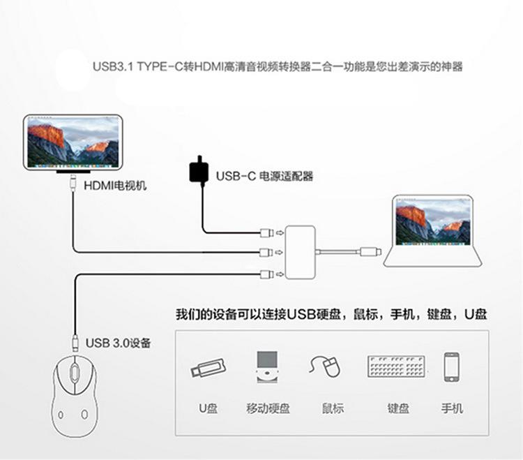 TCable HD USB tipo C a HDMI+USB Aleación de aluminio Cable USB 3.1 a HDMI