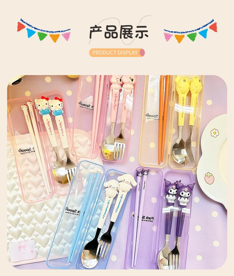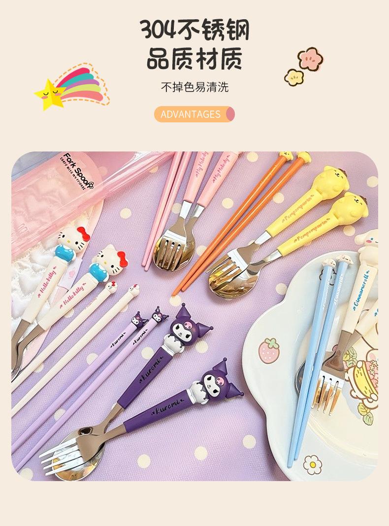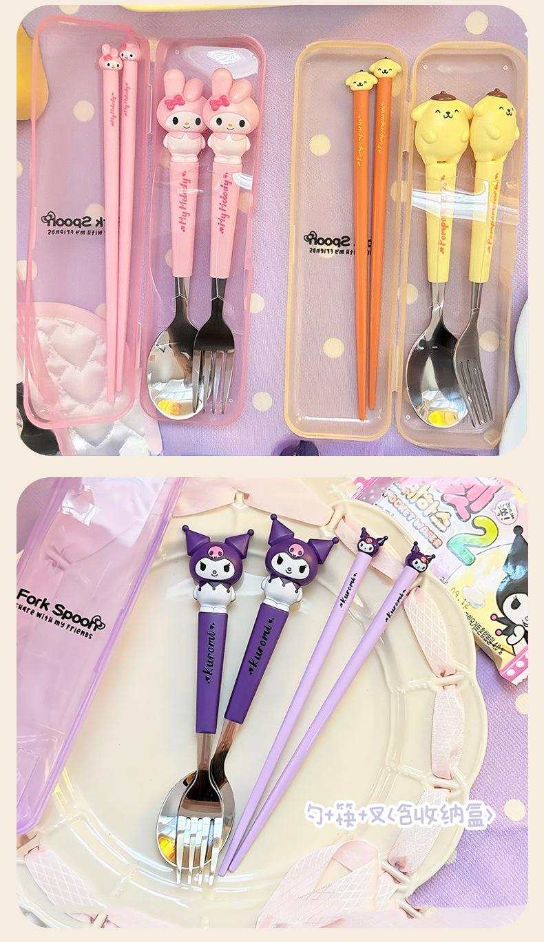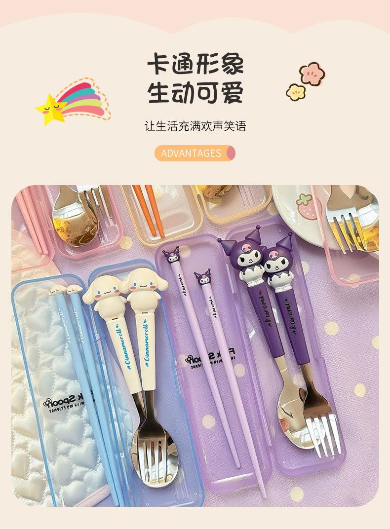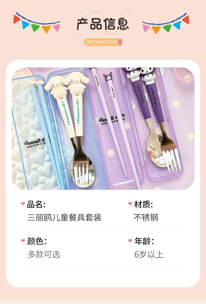 Juego de vajilla portátil de tres piezas con cuchara, tenedor y palillos de Sanlio de dibujos animados para estudiantes con arroz, vajilla de acero inoxidable.