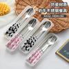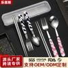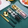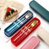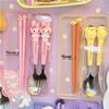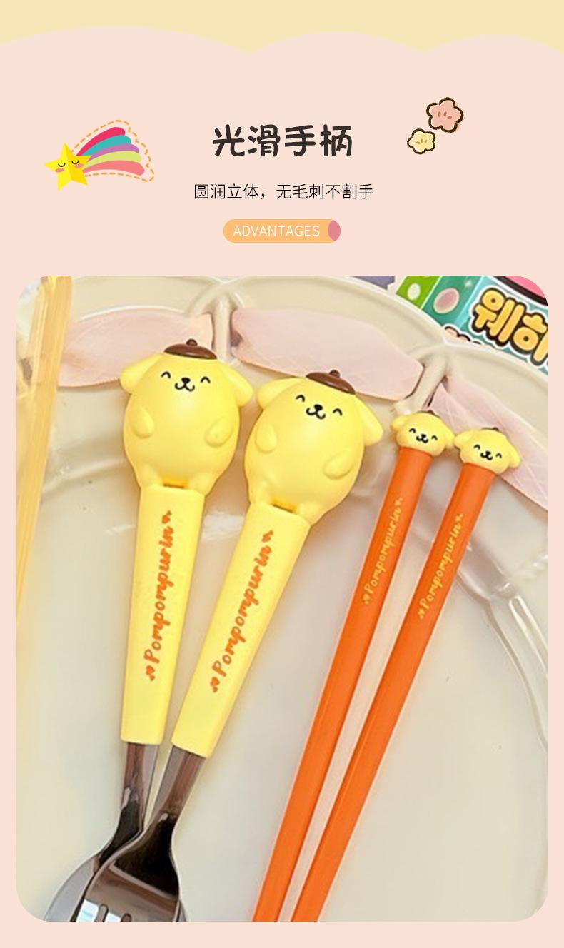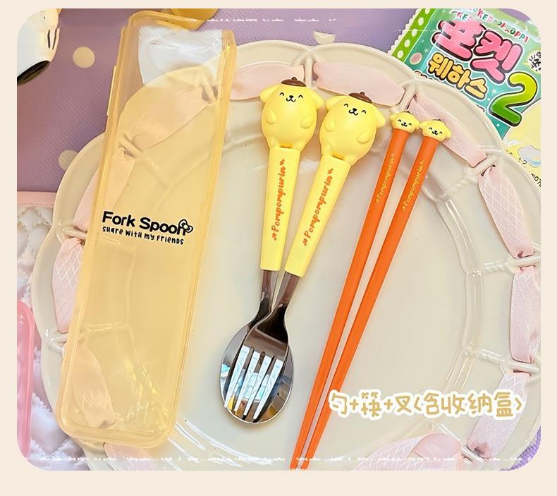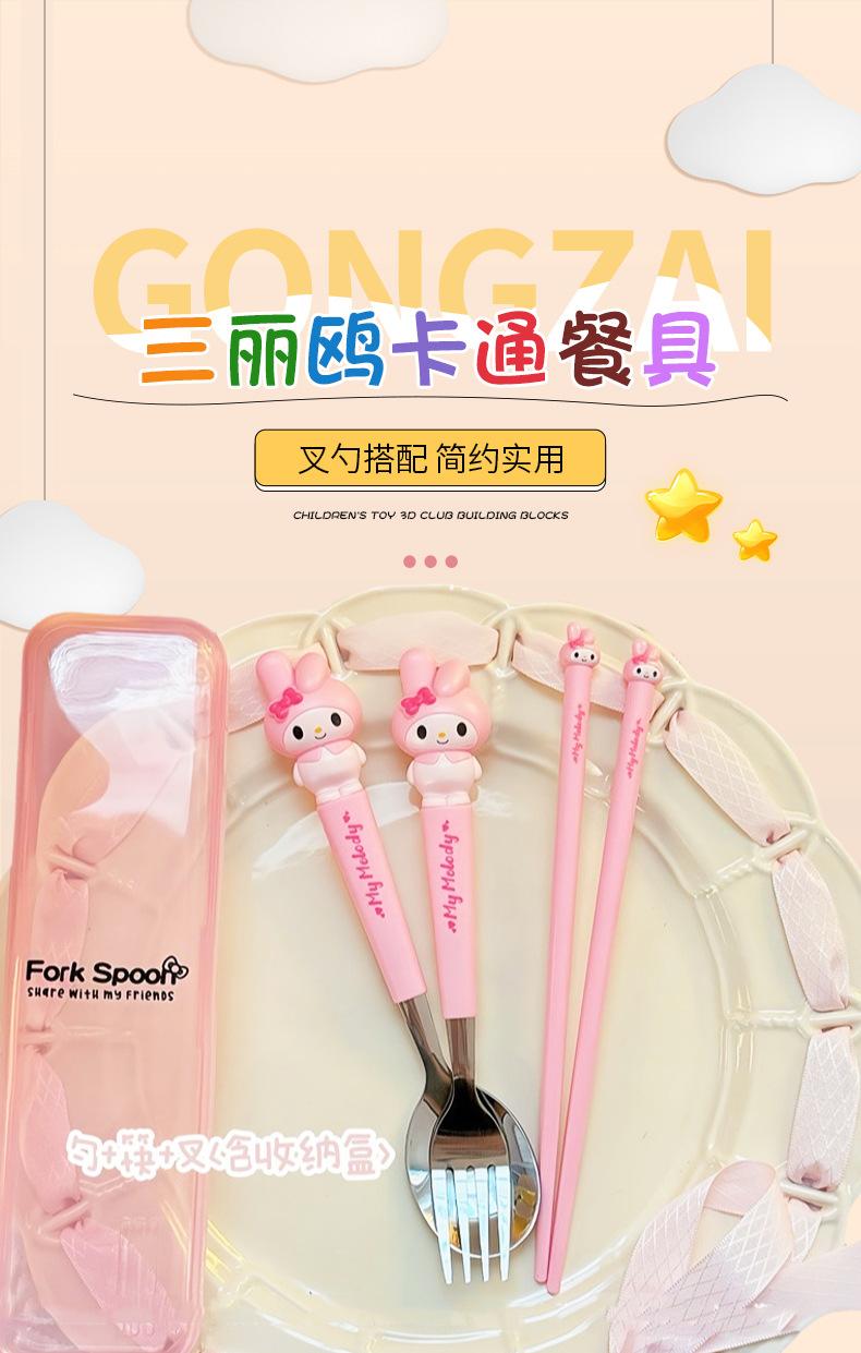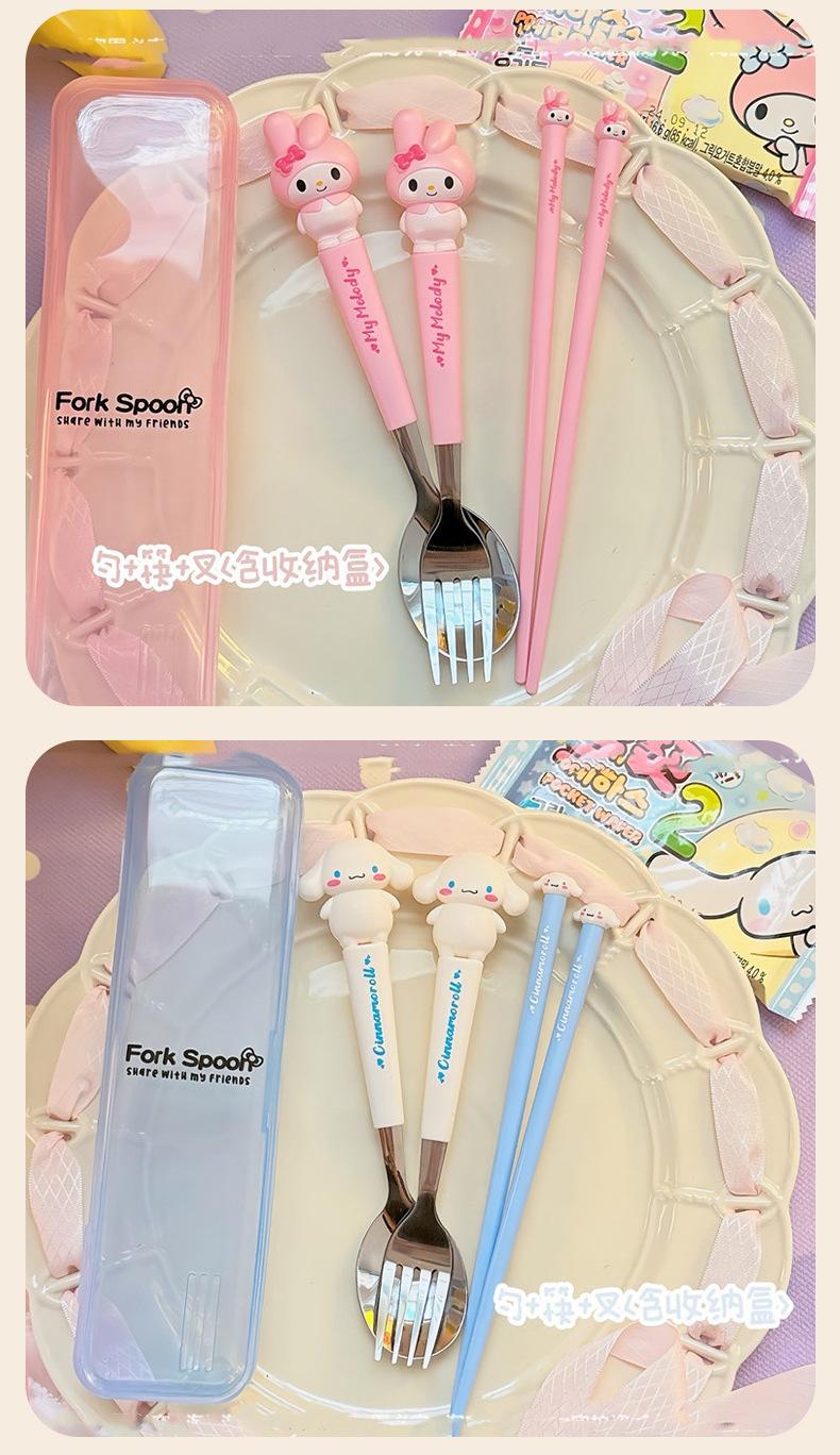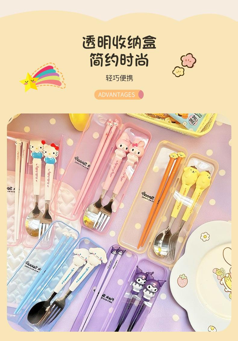 Juego de vajilla portátil de tres piezas con cuchara, tenedor y palillos de Sanlio de dibujos animados para estudiantes con arroz, vajilla de acero inoxidable.
