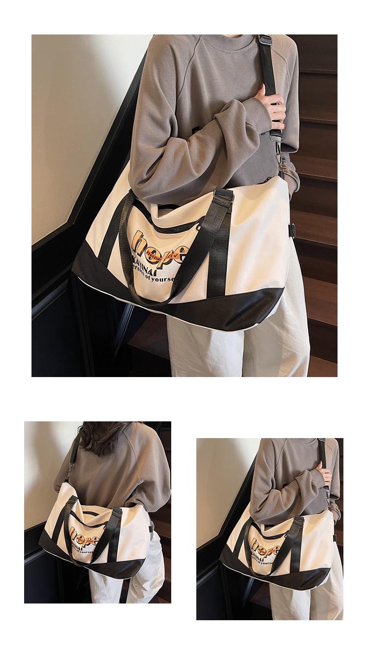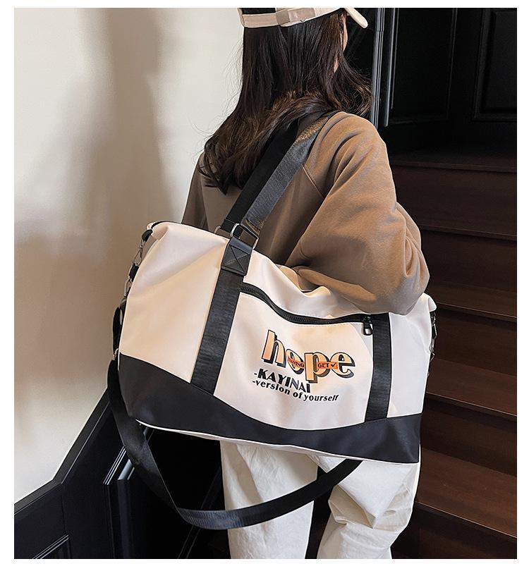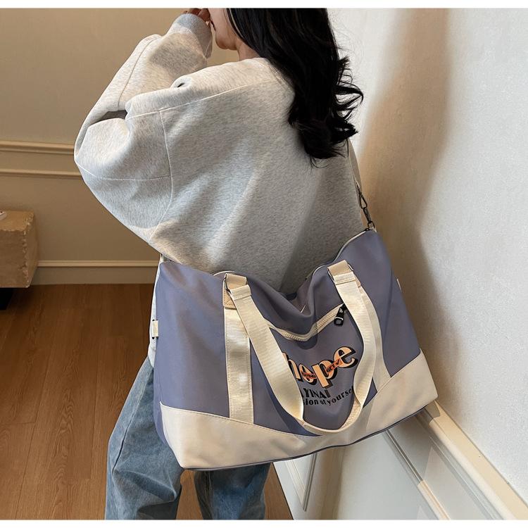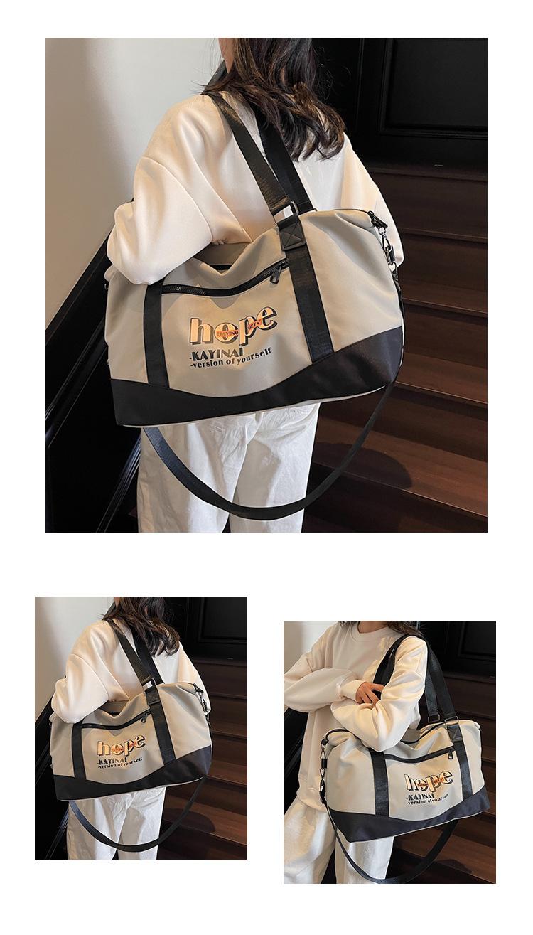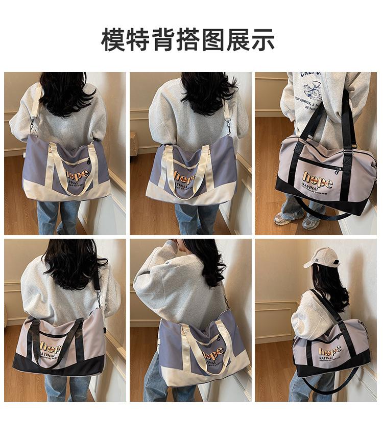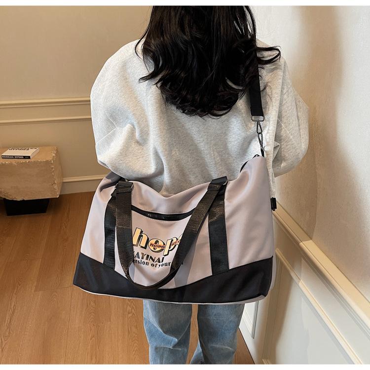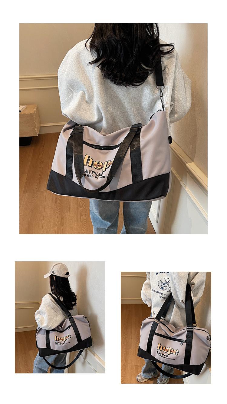 Bolsa de fitness con bloques de color, gran capacidad, con estampado de letras, ligera, para equipaje separado, para ropa seca y húmeda, práctica bolsa de viaje cruzada con hombro.