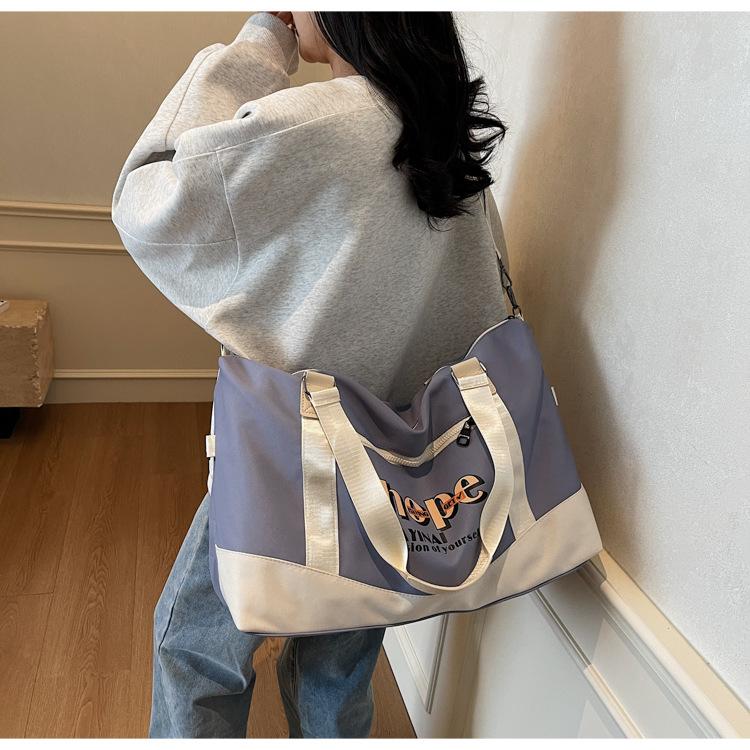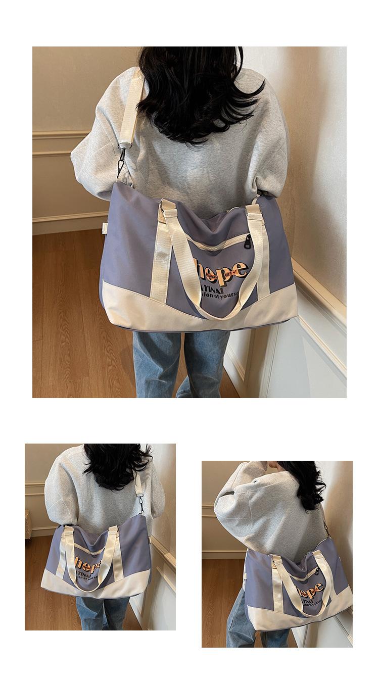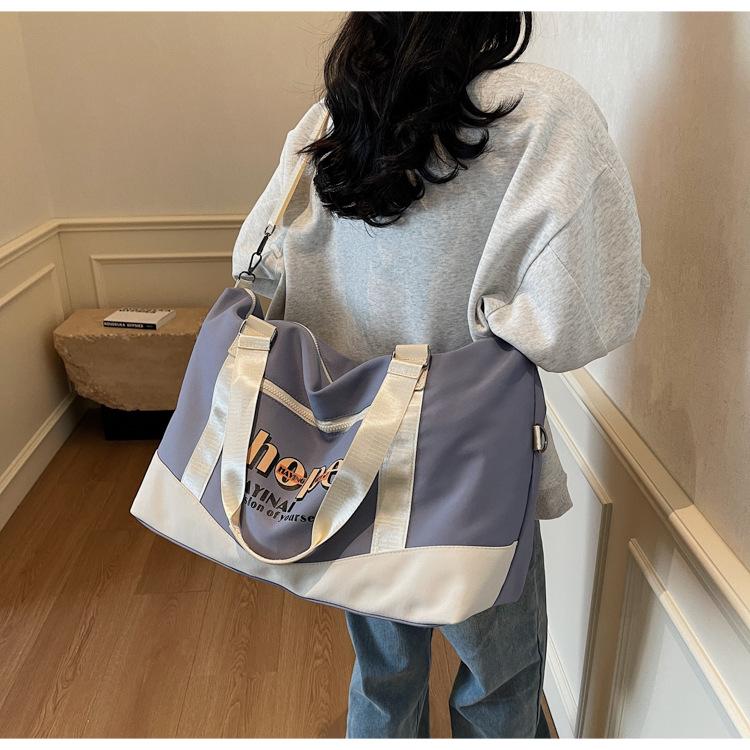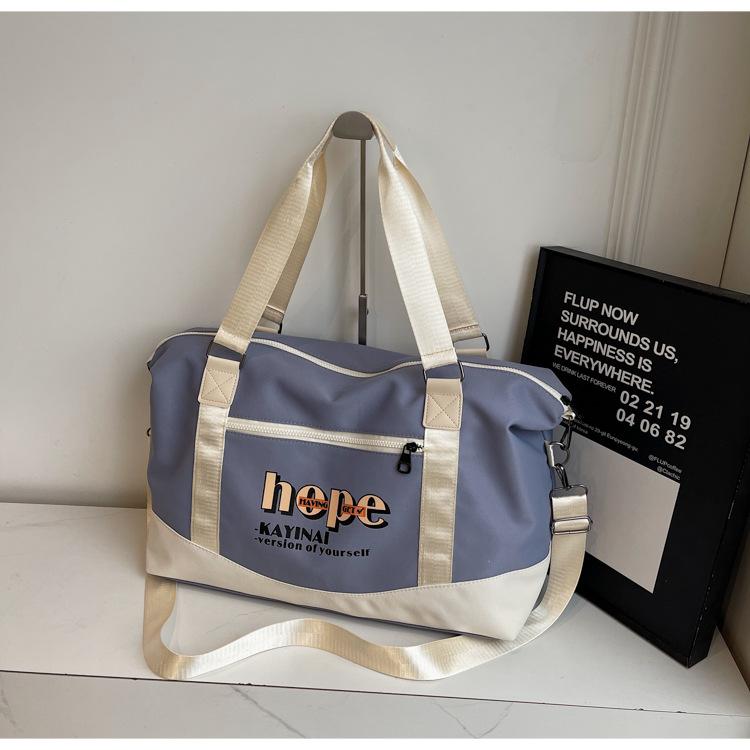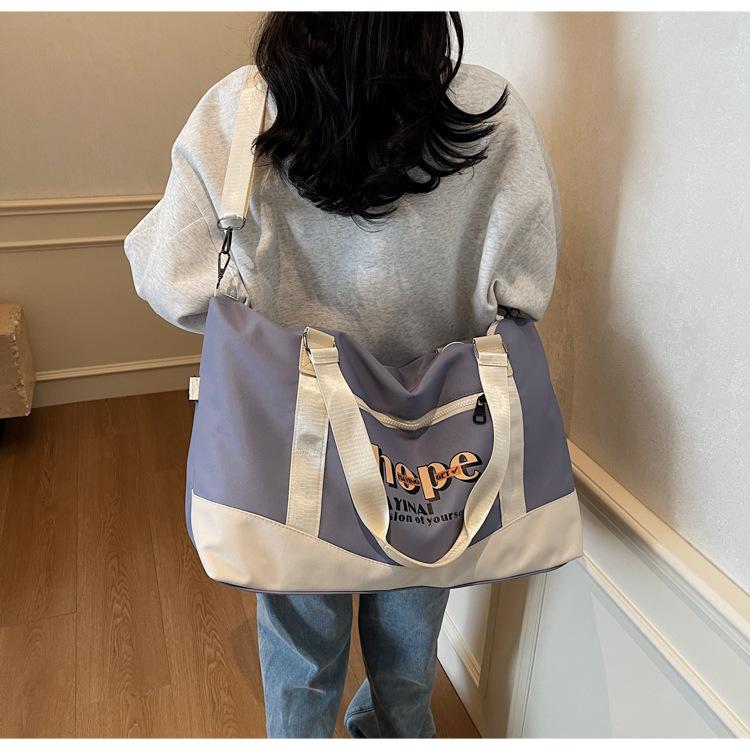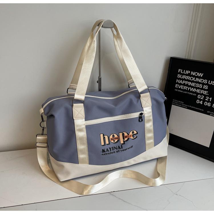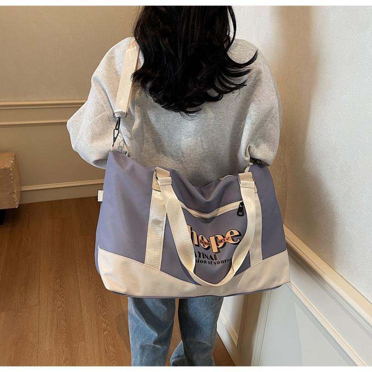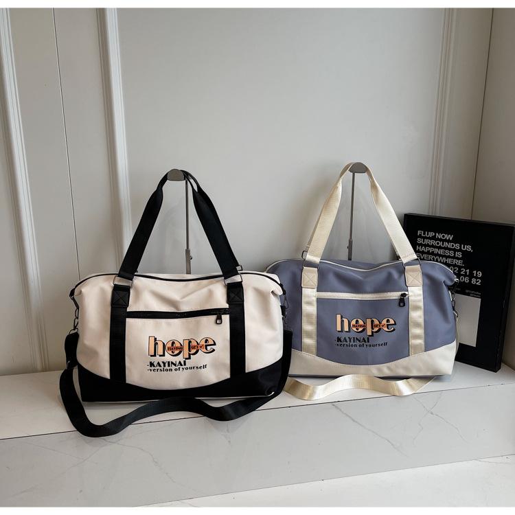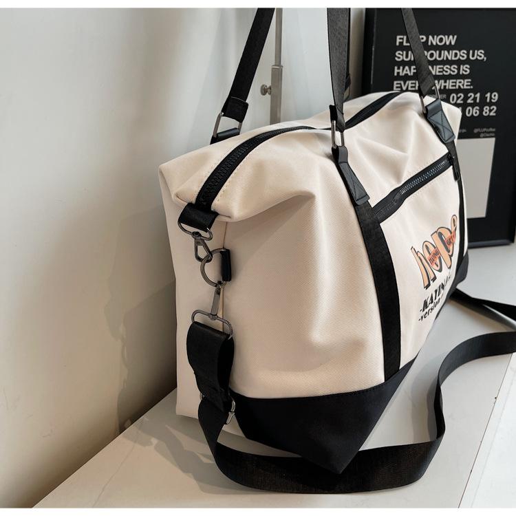Bolsa de fitness con bloques de color, gran capacidad, con estampado de letras, ligera, para equipaje separado, para ropa seca y húmeda, práctica bolsa de viaje cruzada con hombro.
