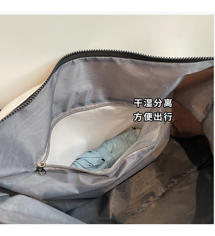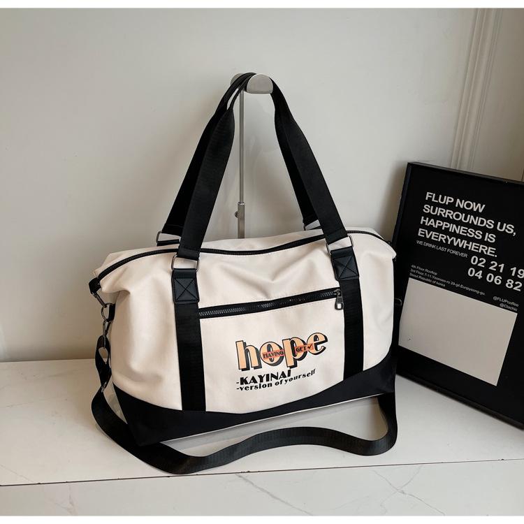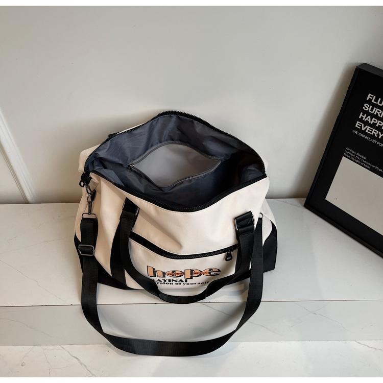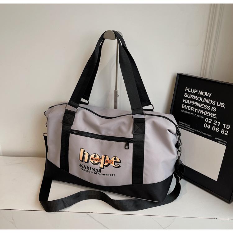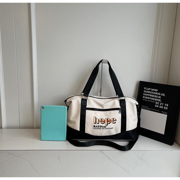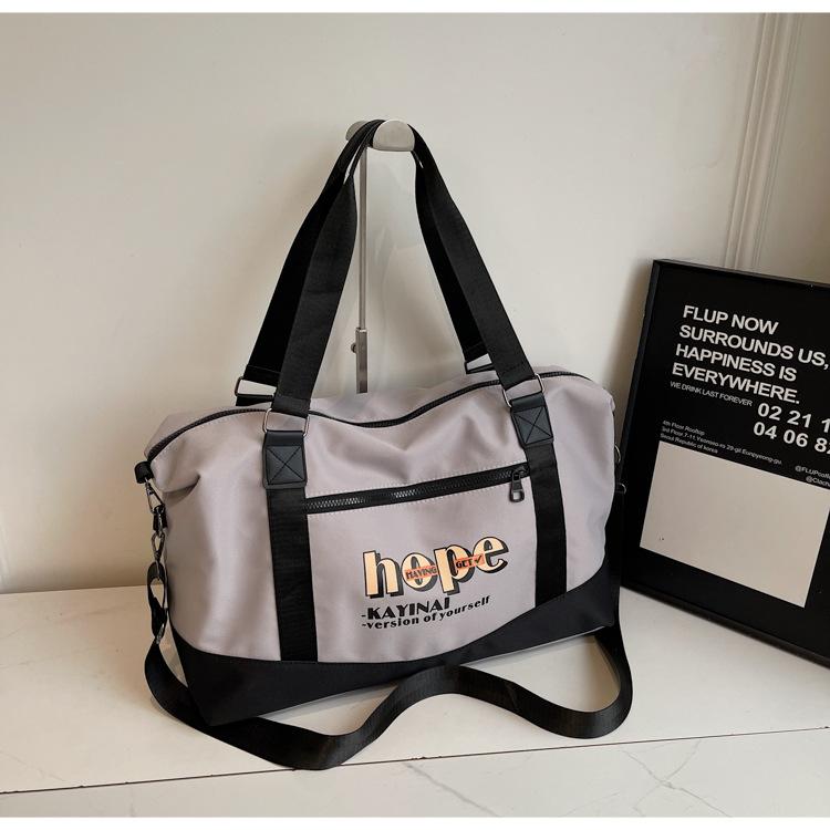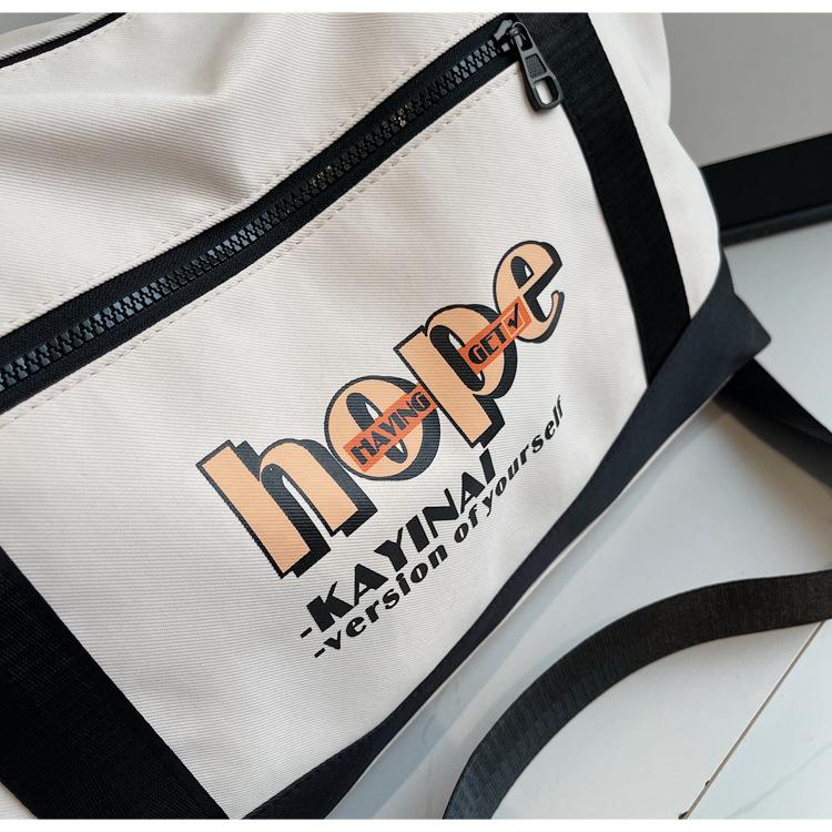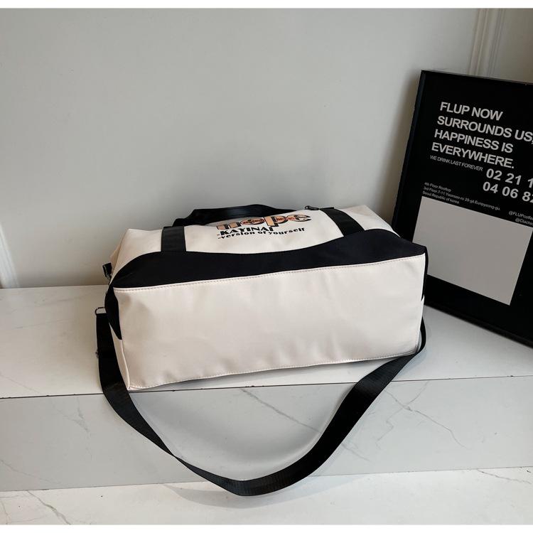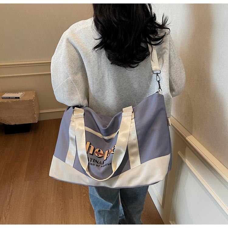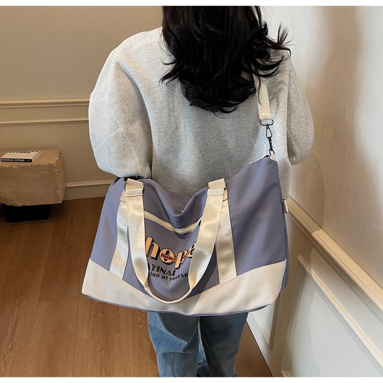 Bolsa de fitness con bloques de color, gran capacidad, con estampado de letras, ligera, para equipaje separado, para ropa seca y húmeda, práctica bolsa de viaje cruzada con hombro.
