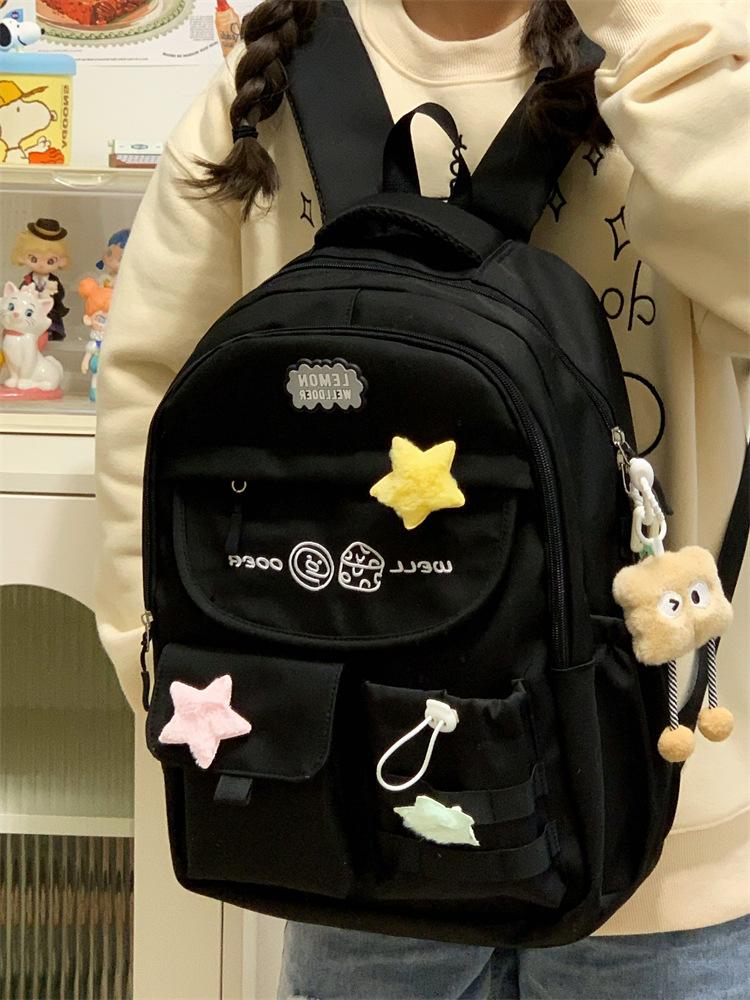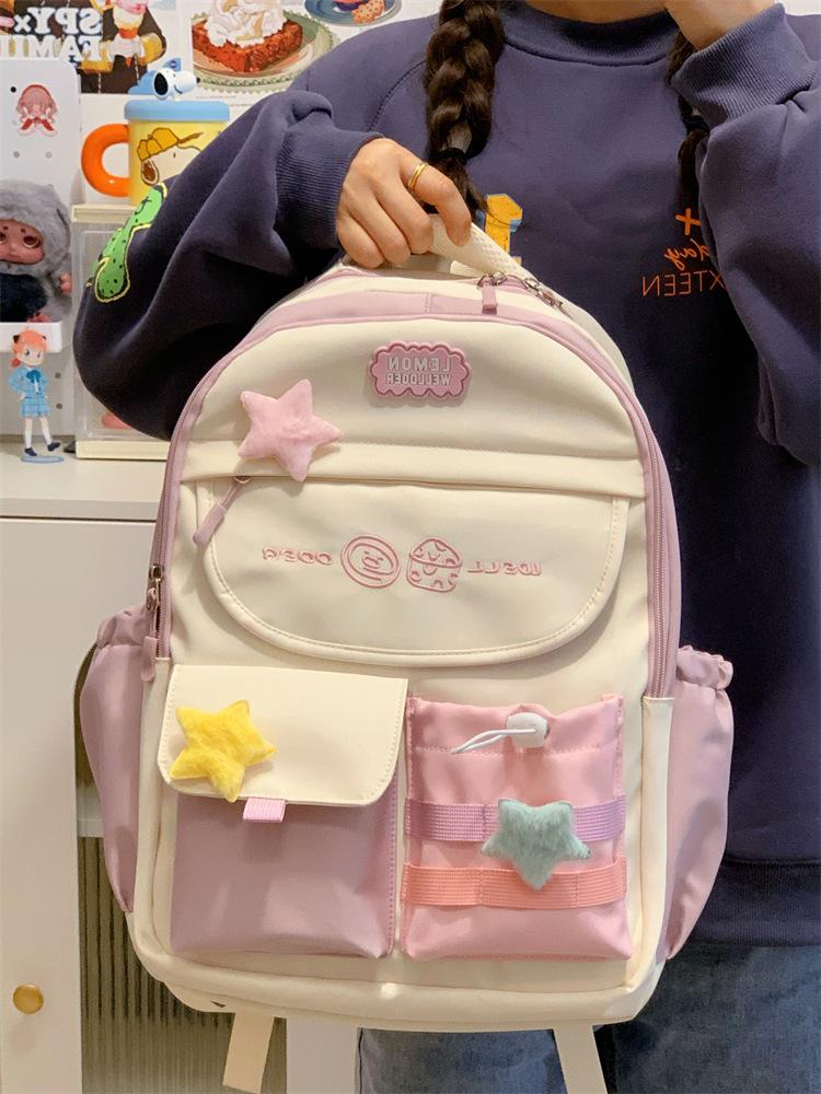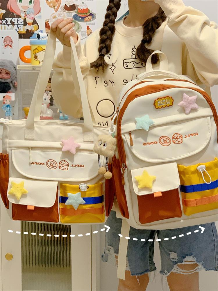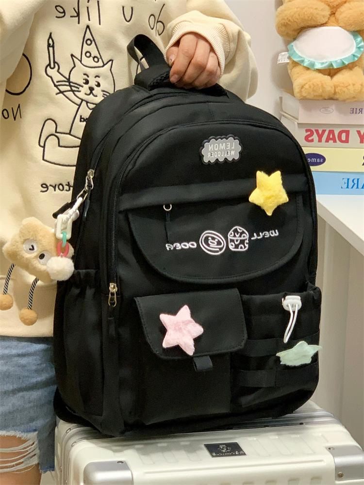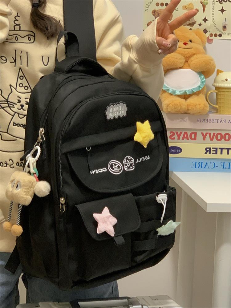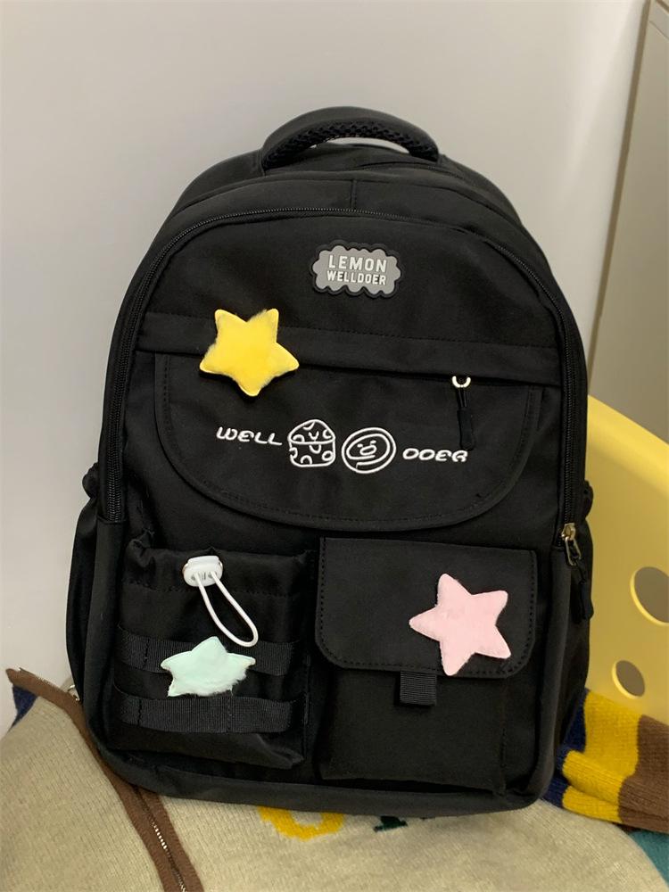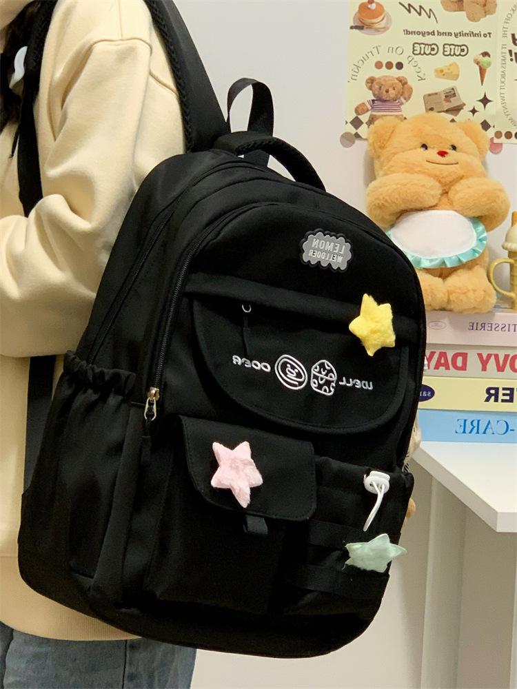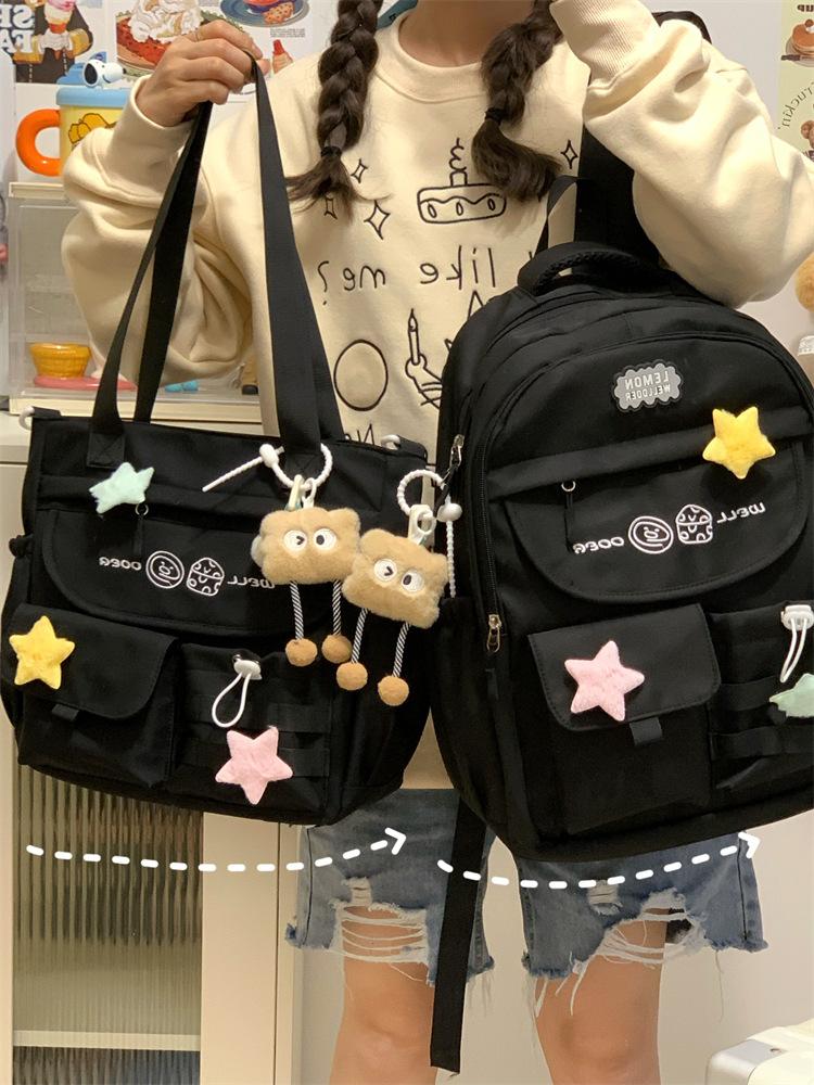 Black backpack + stars, Red backpack + stars, Blue backpack + stars, Pink backpack + stars, Black shoulder bag...