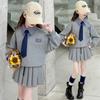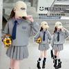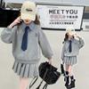 Traje de estilo universitario para niñas primavera 2025 nuevo suéter falso de dos piezas para niños falda de niña grande conjunto de dos piezas
