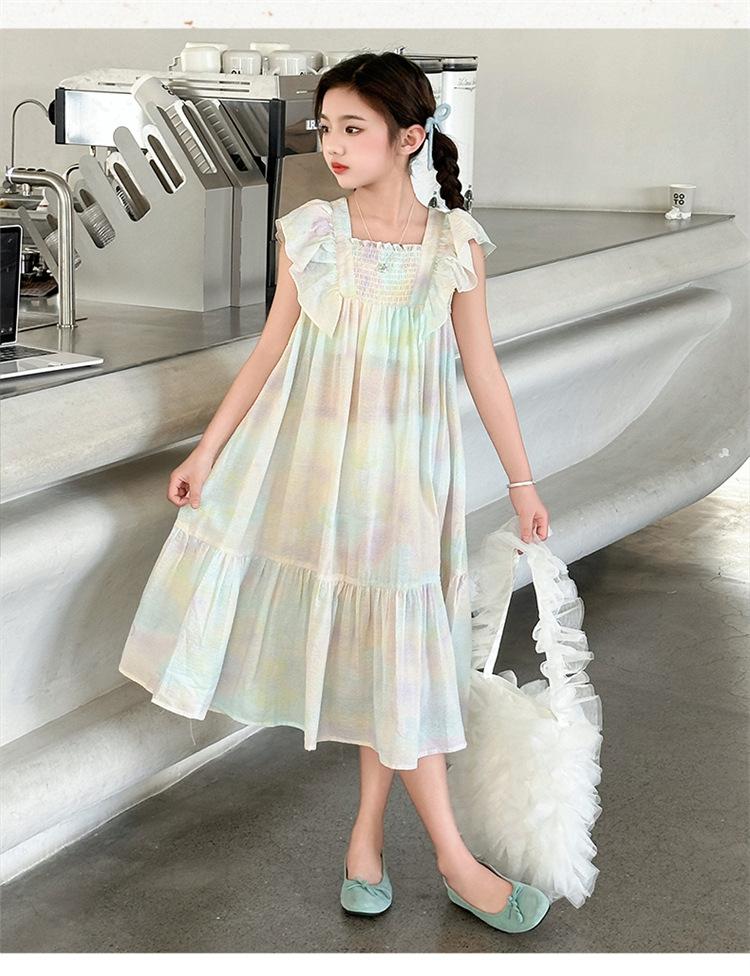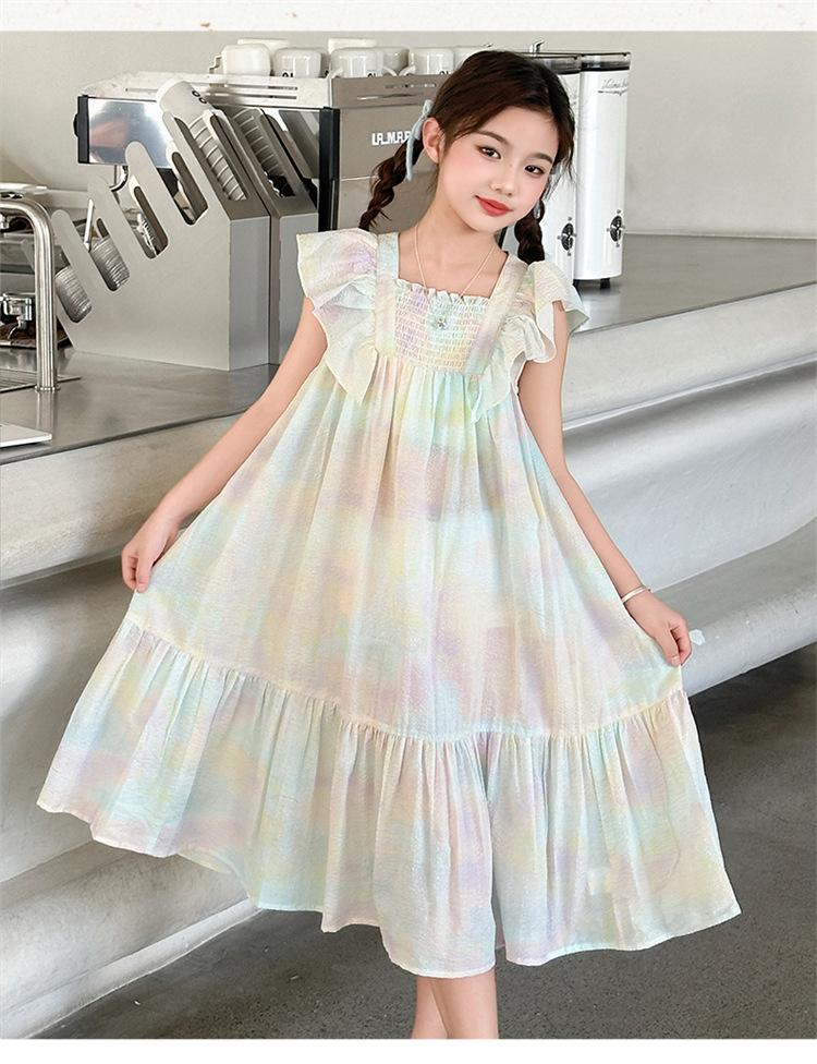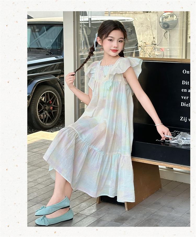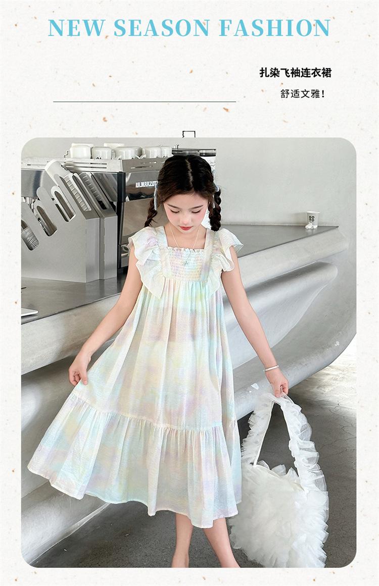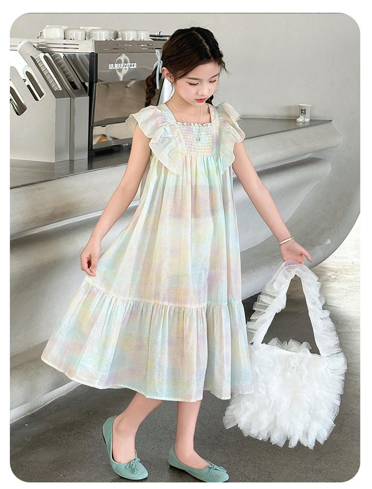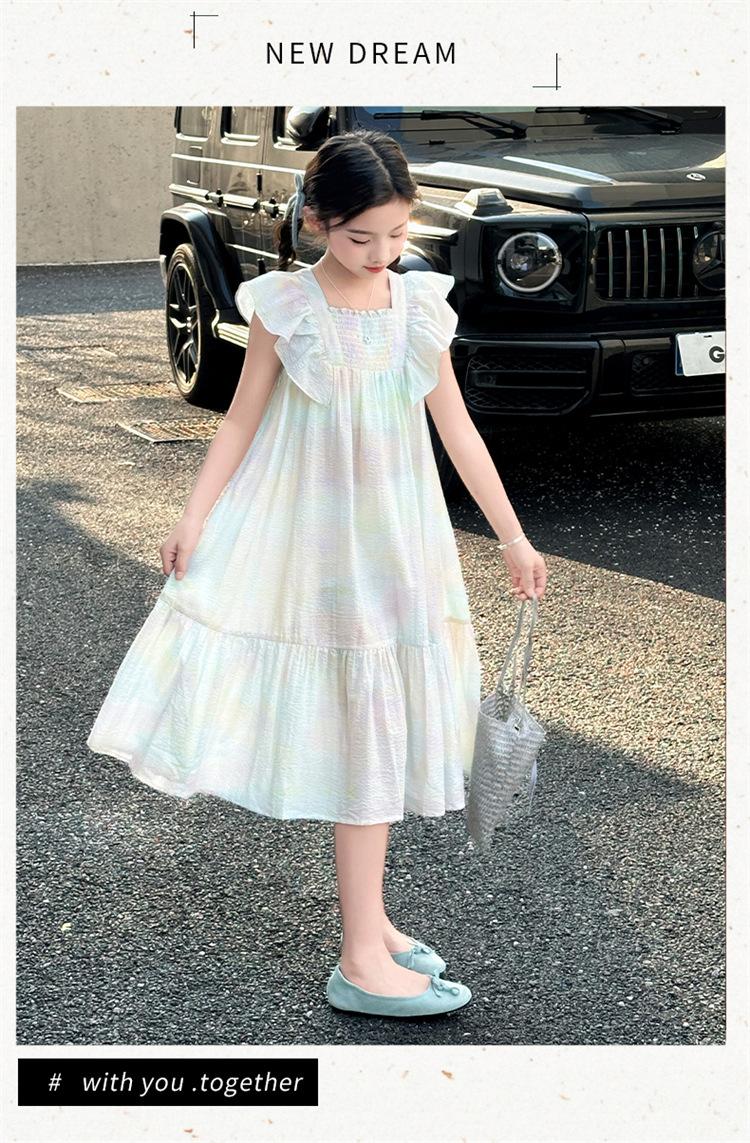 Vestido de niña 2025 Verano Nuevo Elegante Moderno Estilo Vacacional Niña Grande Tie-Dye Manga Volante Vestido de Princesa