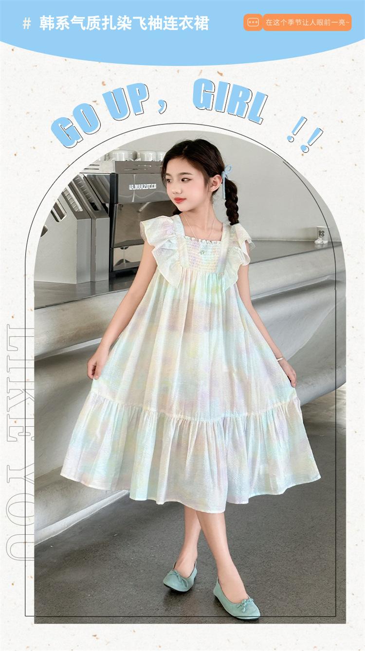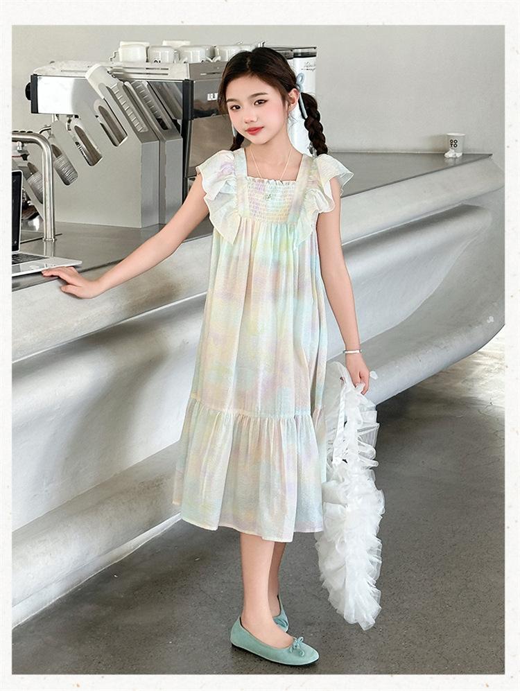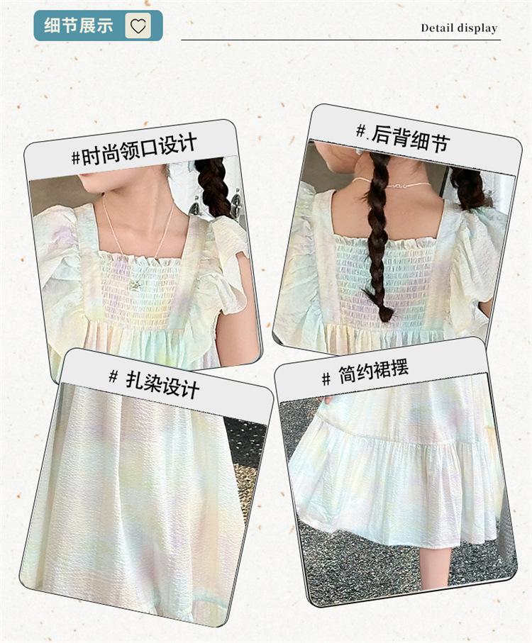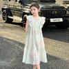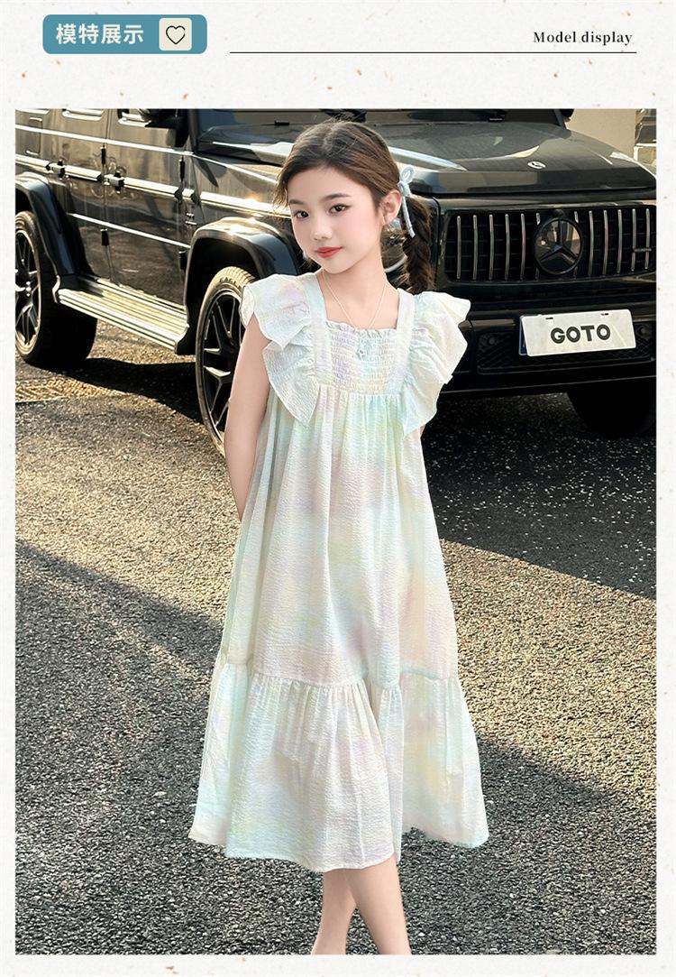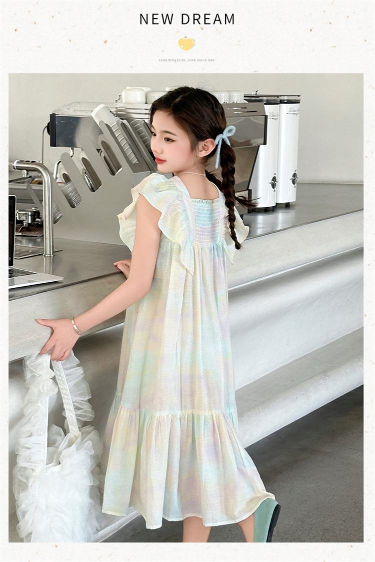Vestido de niña 2025 Verano Nuevo Elegante Moderno Estilo Vacacional Niña Grande Tie-Dye Manga Volante Vestido de Princesa