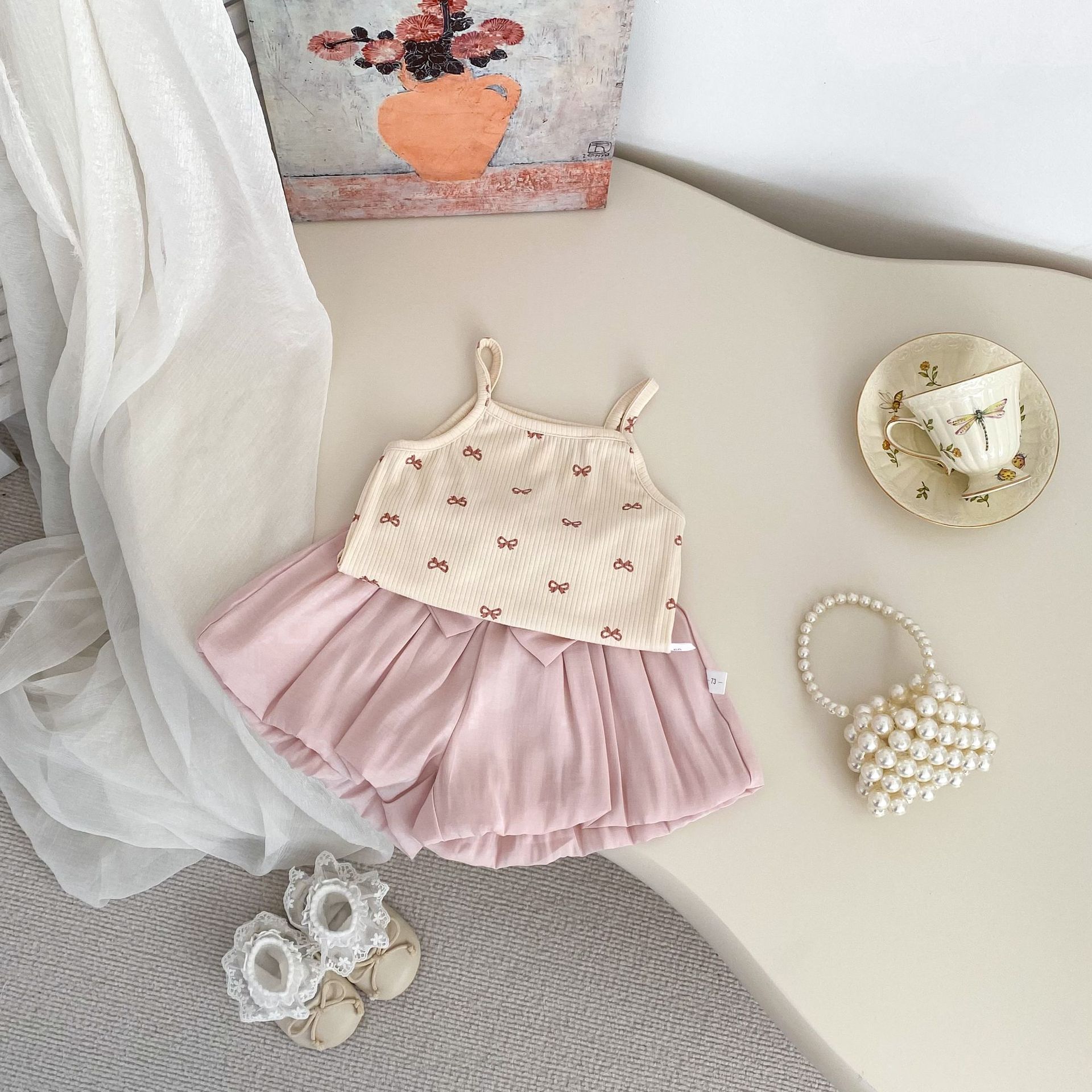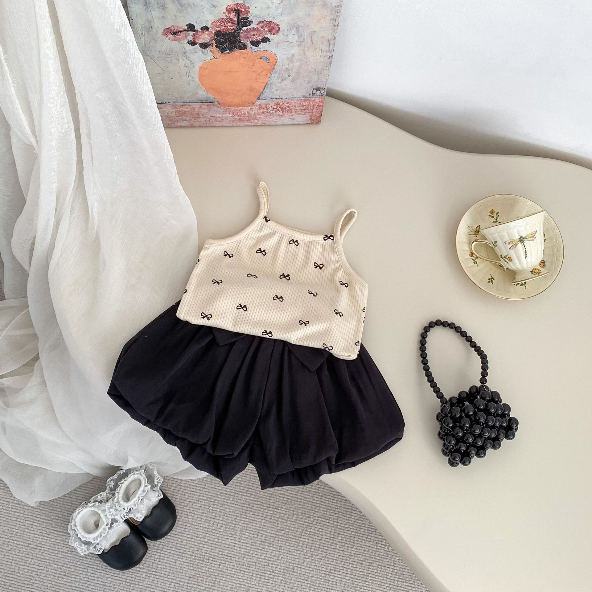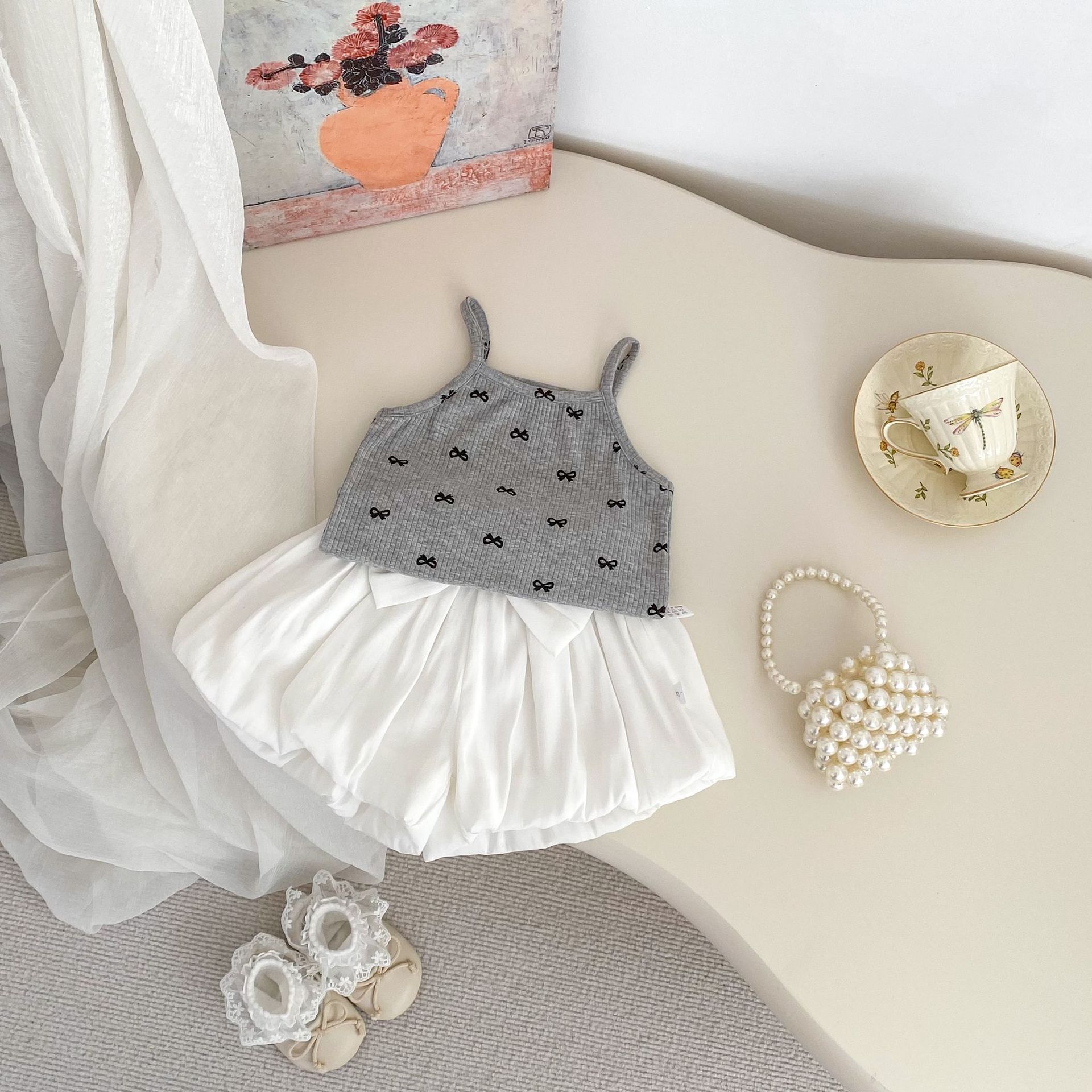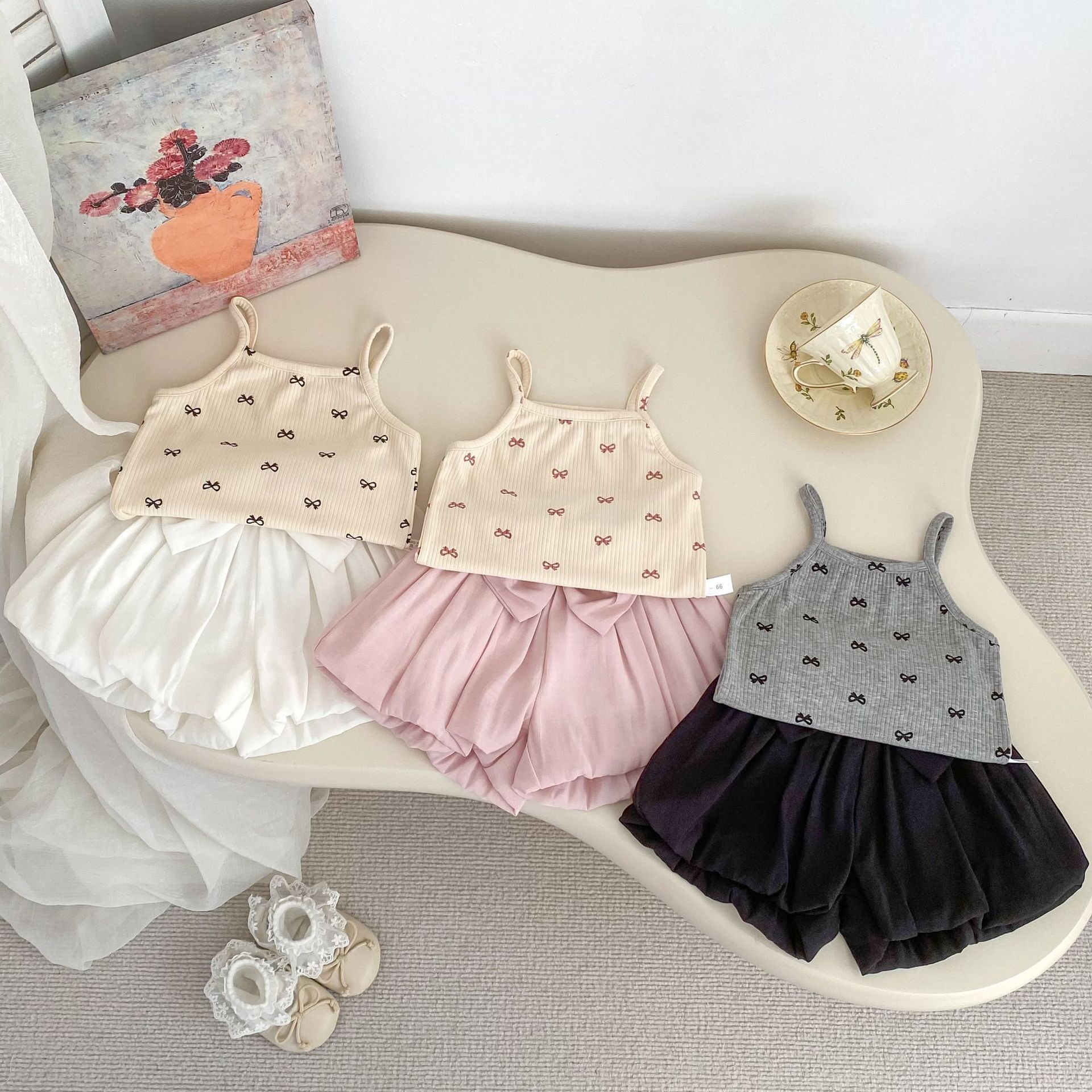 INS Verano Moda para Niñas Pequeña Sling Dos Piezas Estilo Occidental Combinable Camiseta Top Lazo Shorts