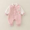 Pink [white lapel flower long sleeve jumpsuit] fleece-lined