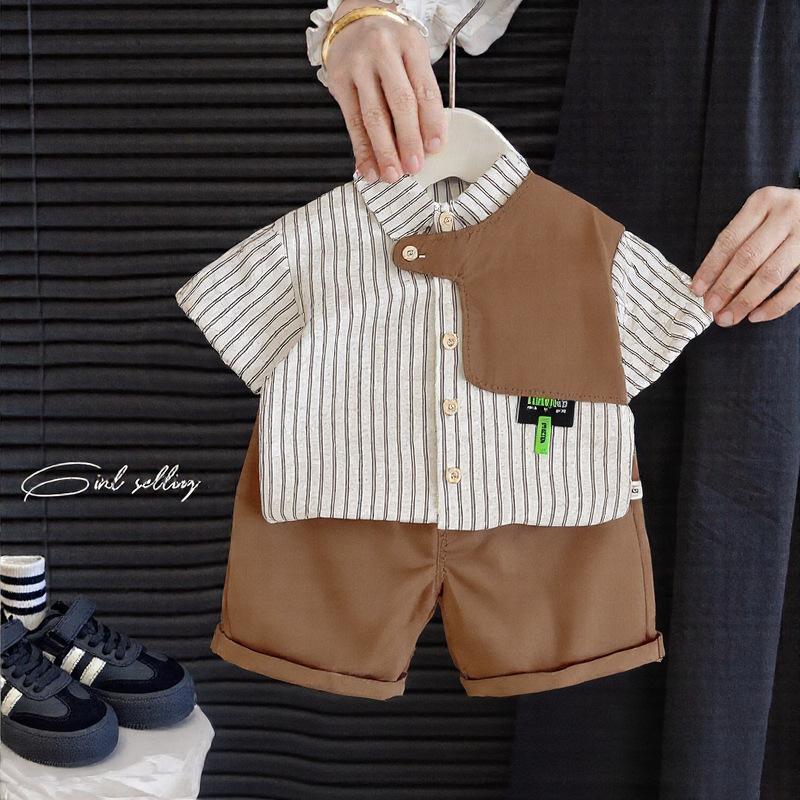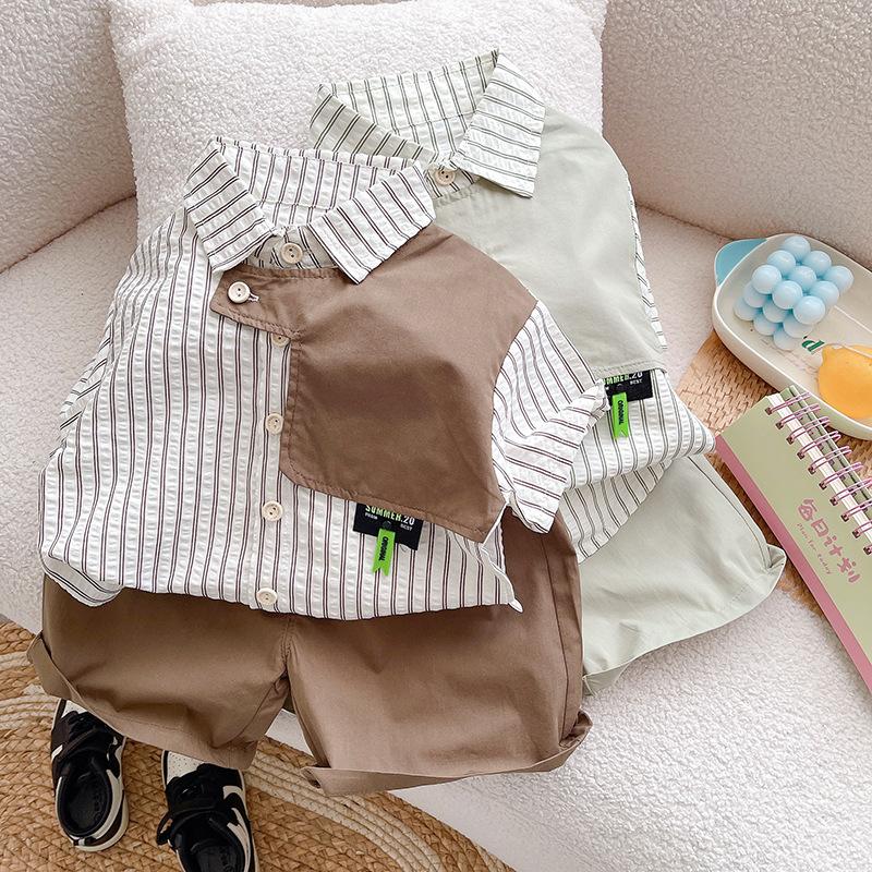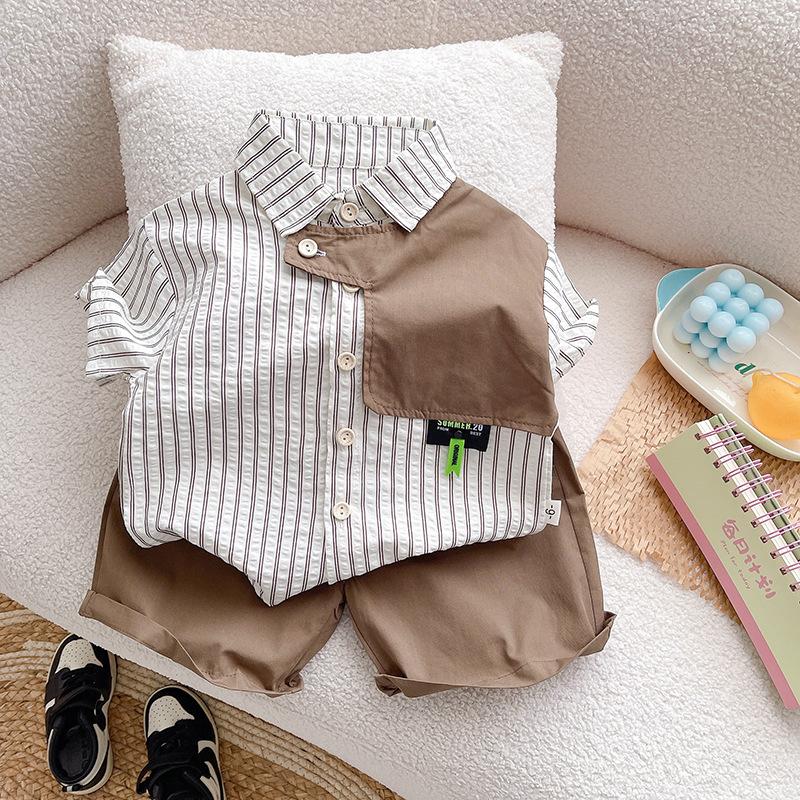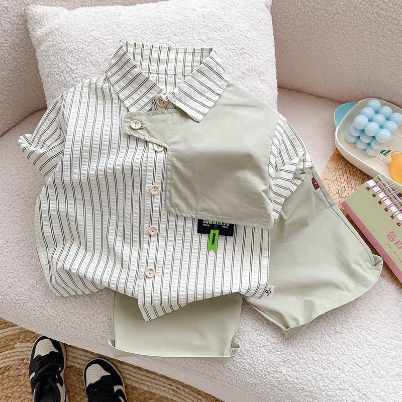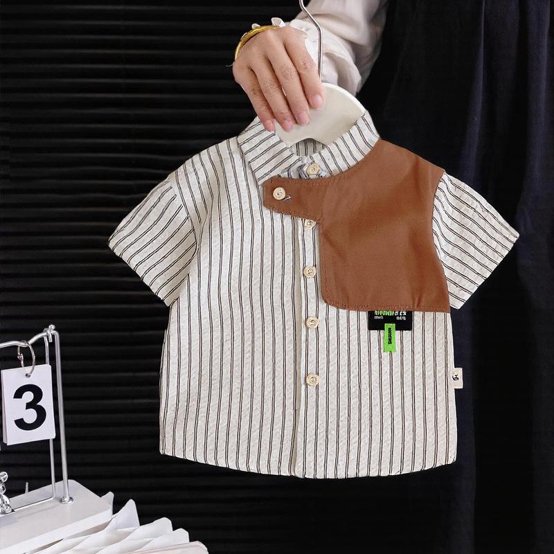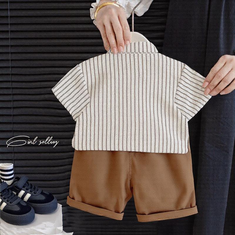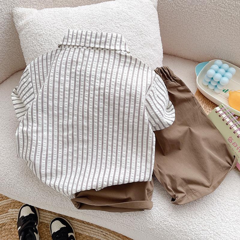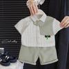 Ropa de Verano para Bebé 2025 Nuevo Estilo Niño Guapo Camisa Fina de Rayas Verticales Manga Corta Conjunto de Dos Piezas Ropa Infantil de Moda