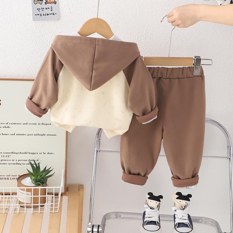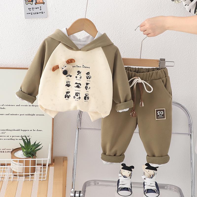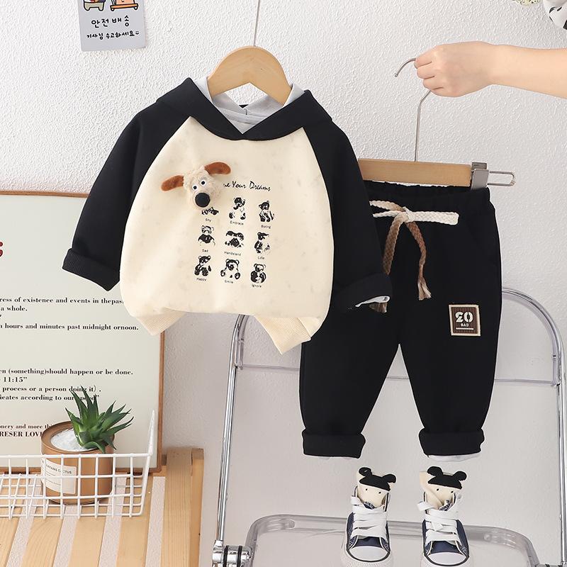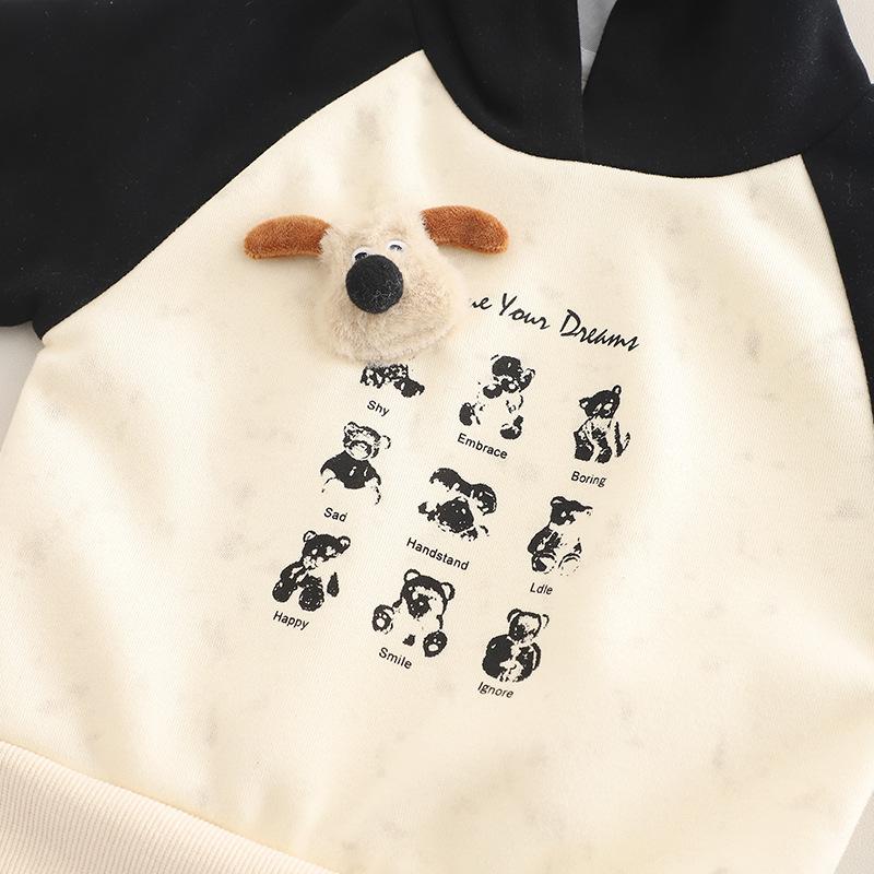 Traje de ropa de primavera para niños moderno estilo coreano nuevo elegante para niños primavera cabeza de perro manga larga con capucha conjunto de dos piezas