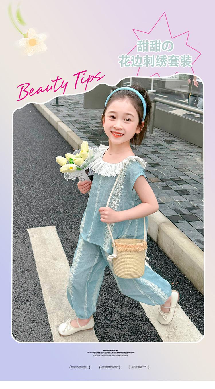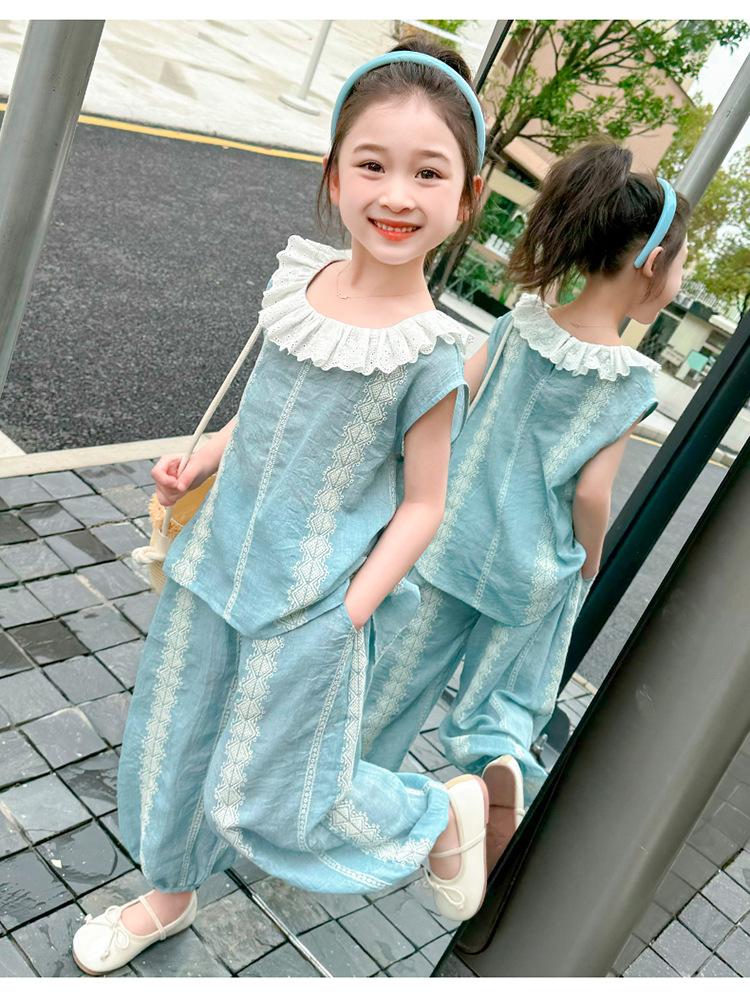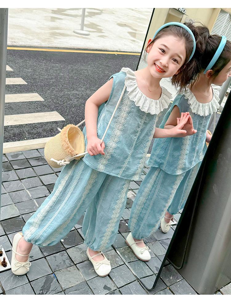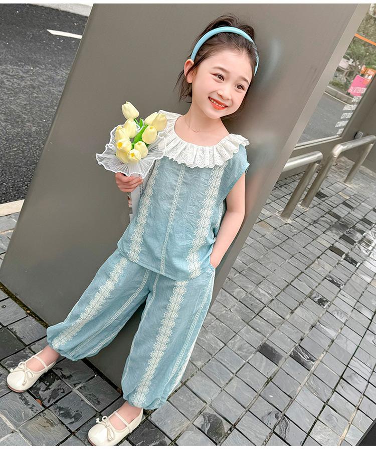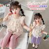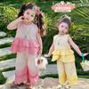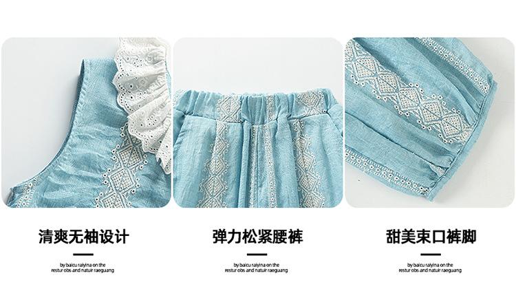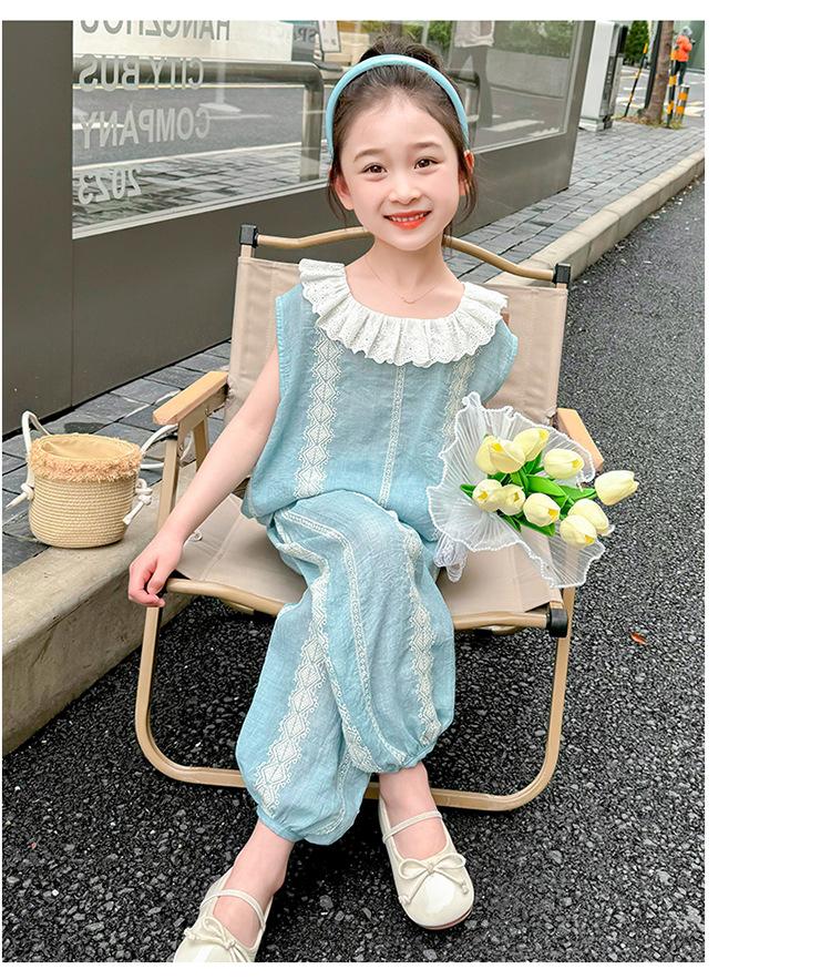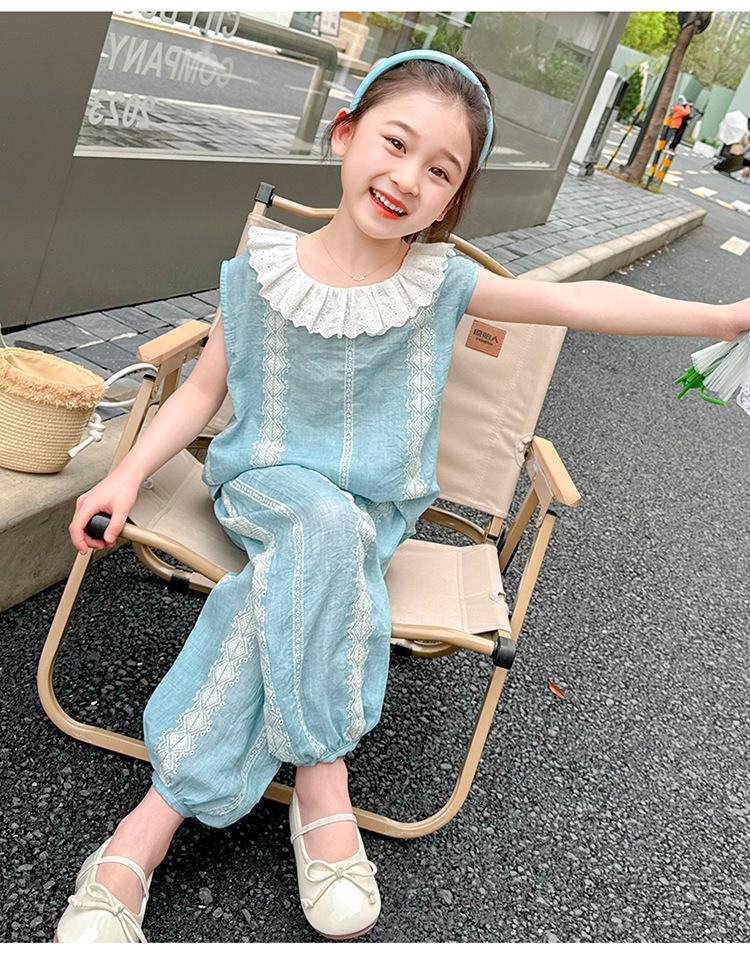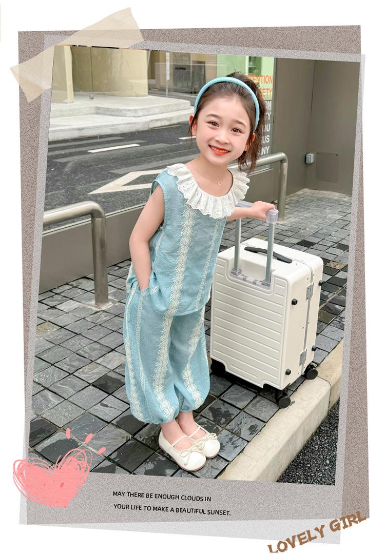Traje bordado de encaje para niña, verano 2025, nuevo, elegante, sin mangas, pantalones, conjunto de dos piezas