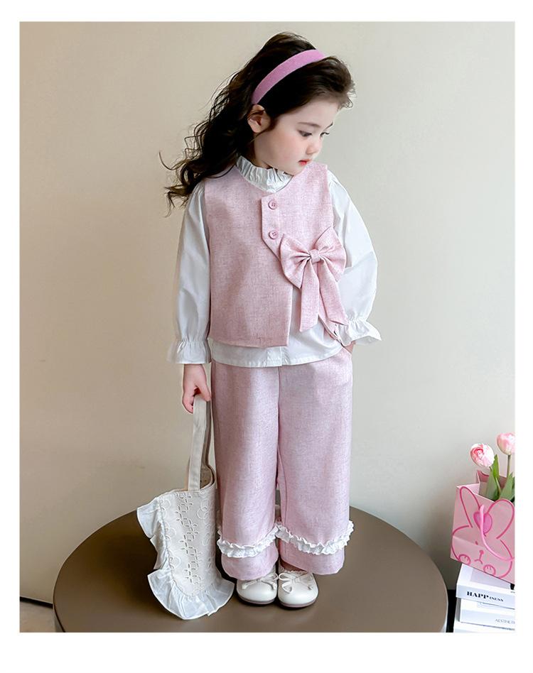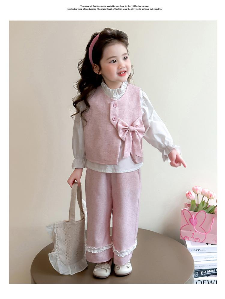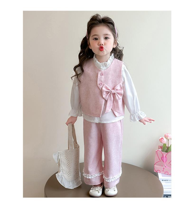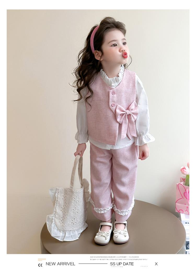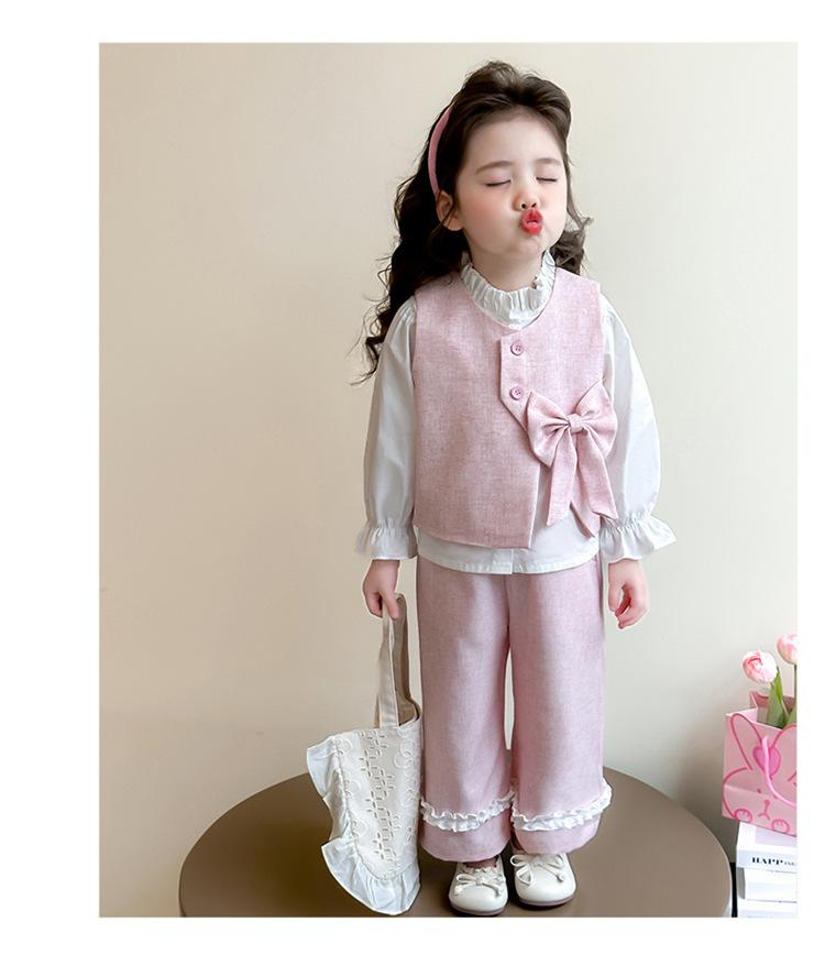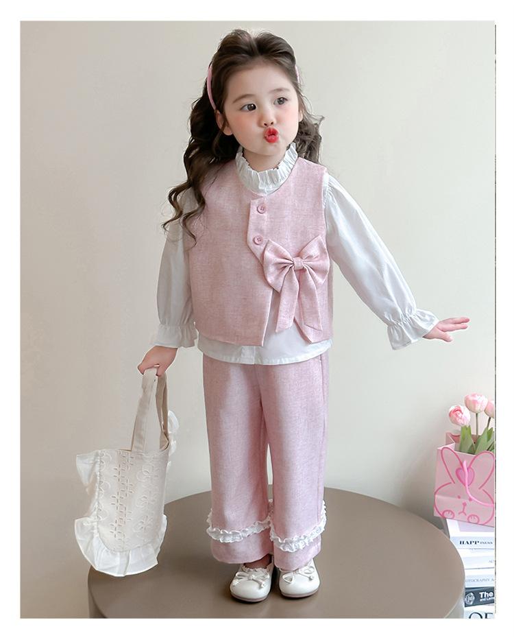 Conjunto de tres piezas con lazo para niña, primavera y otoño 2025, nueva moda, traje informal para niña pequeña, ropa de estilo occidental para niños