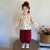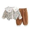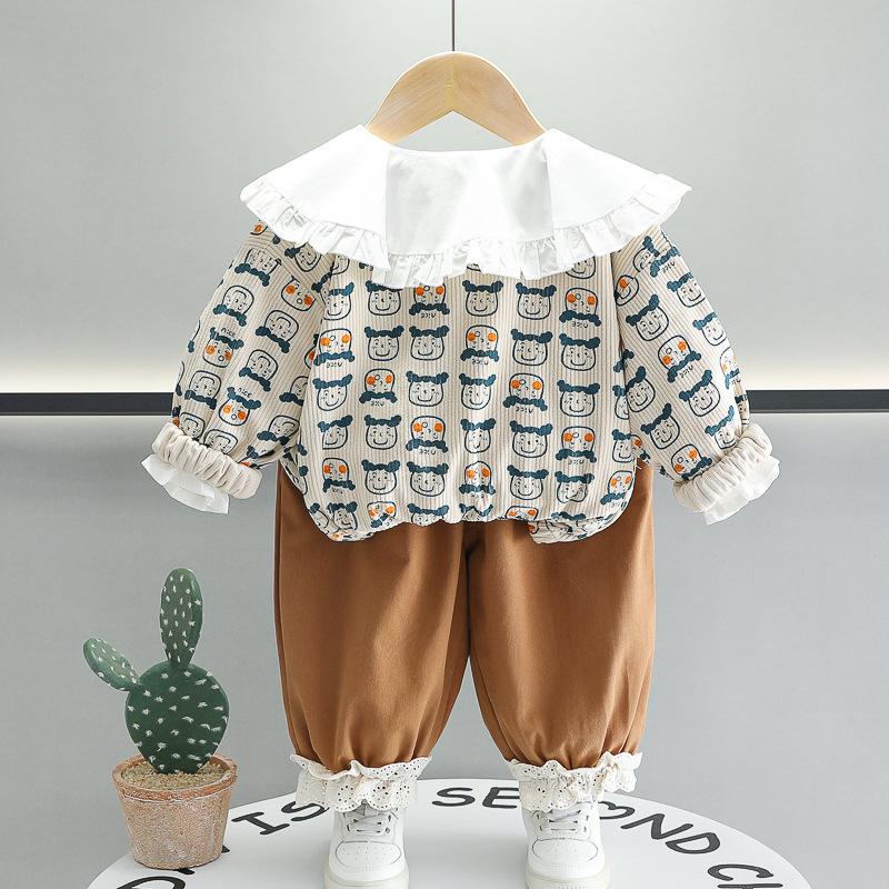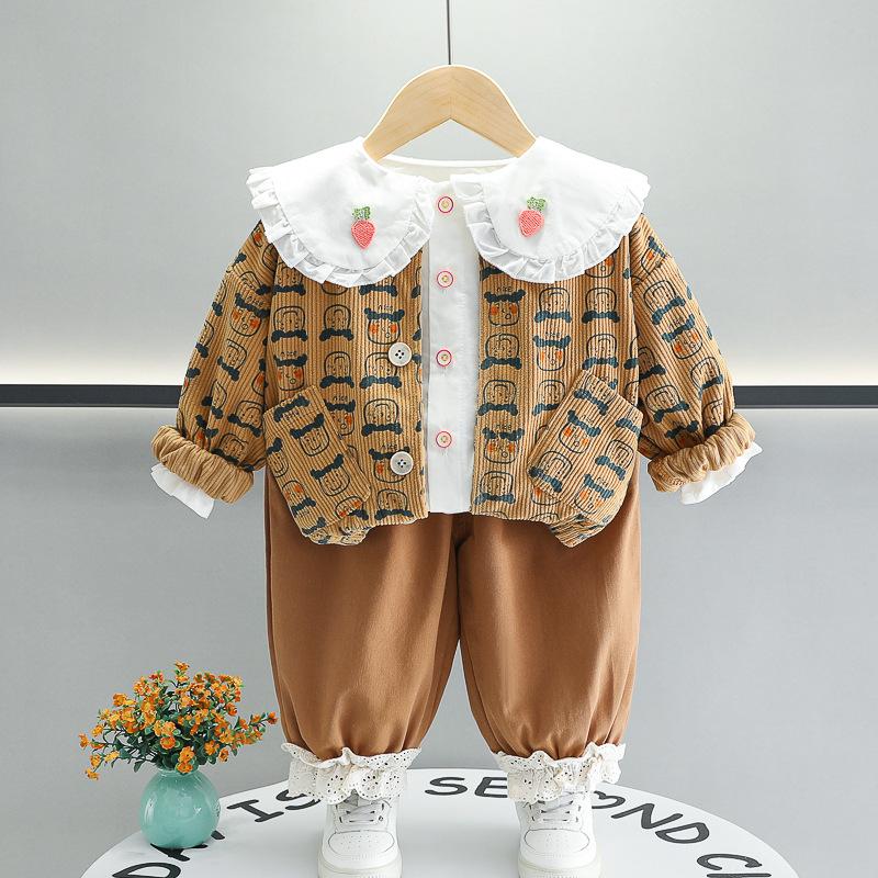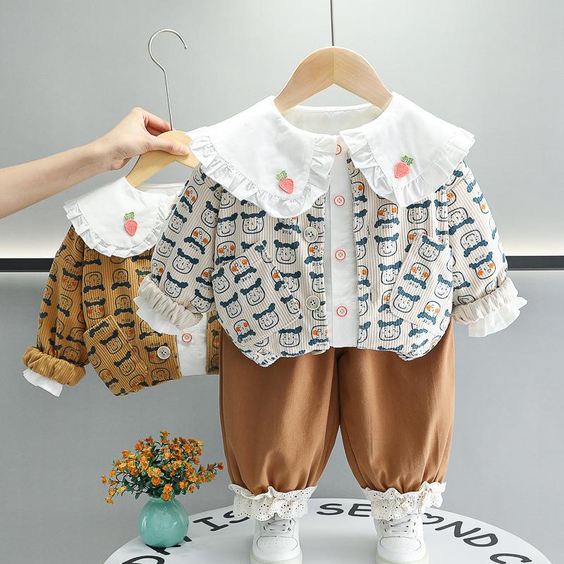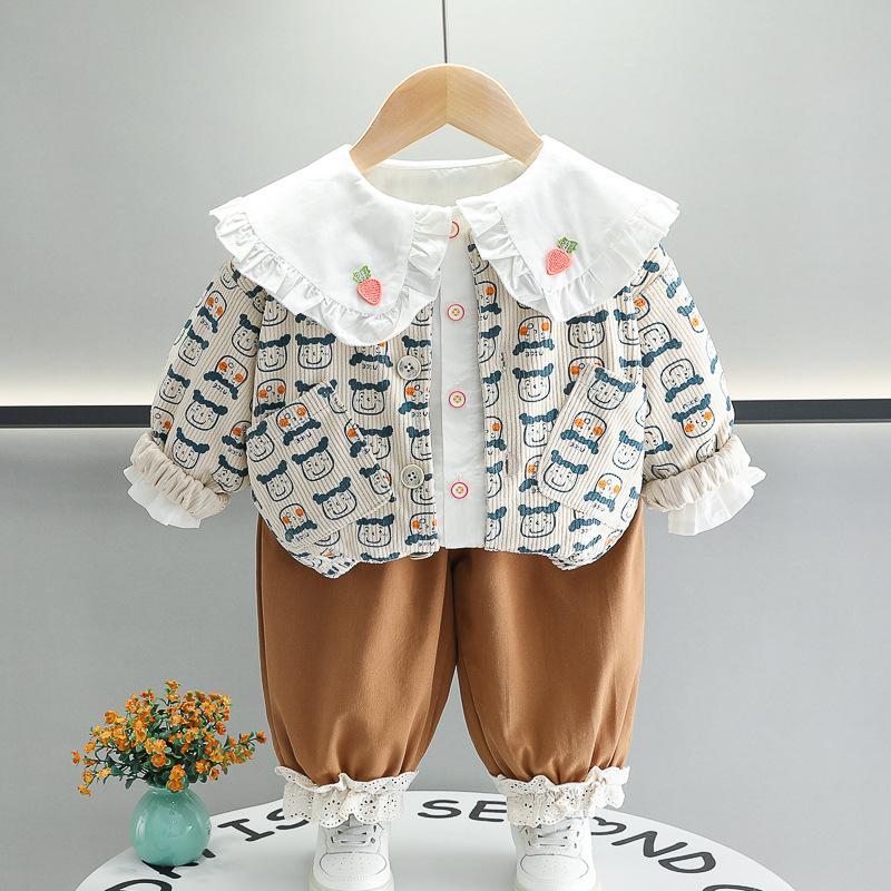 Traje de Moda para Niñas Primavera 2025 Nuevo Estilo Bebé Talla Pequeña y Mediana Moda Otoño Estampado Completo Muñeca Manga Larga Conjunto de Tres Piezas