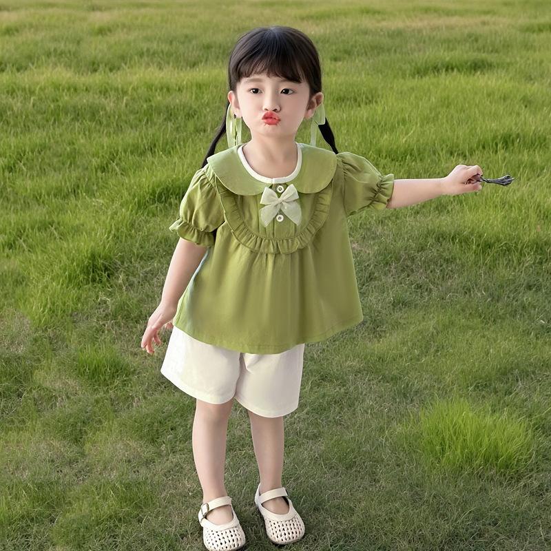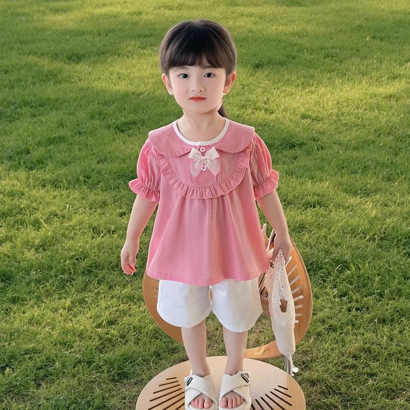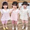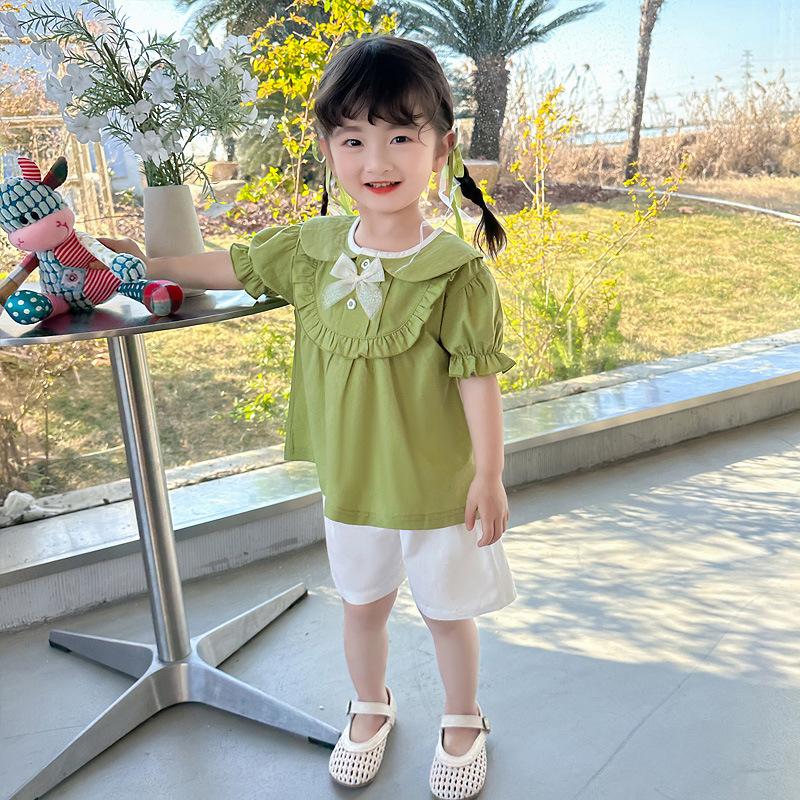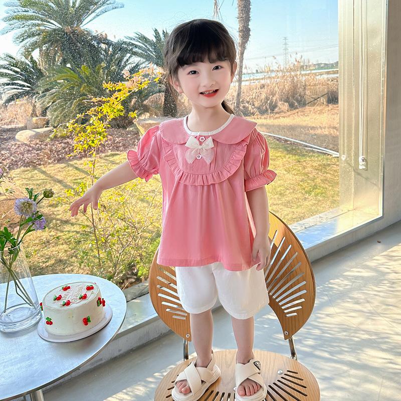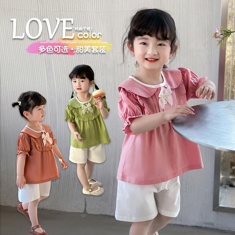 Traje de verano 2025 para niñas, nuevo conjunto de dos piezas de manga corta, bonito traje para niñas de 1 a 5 años.