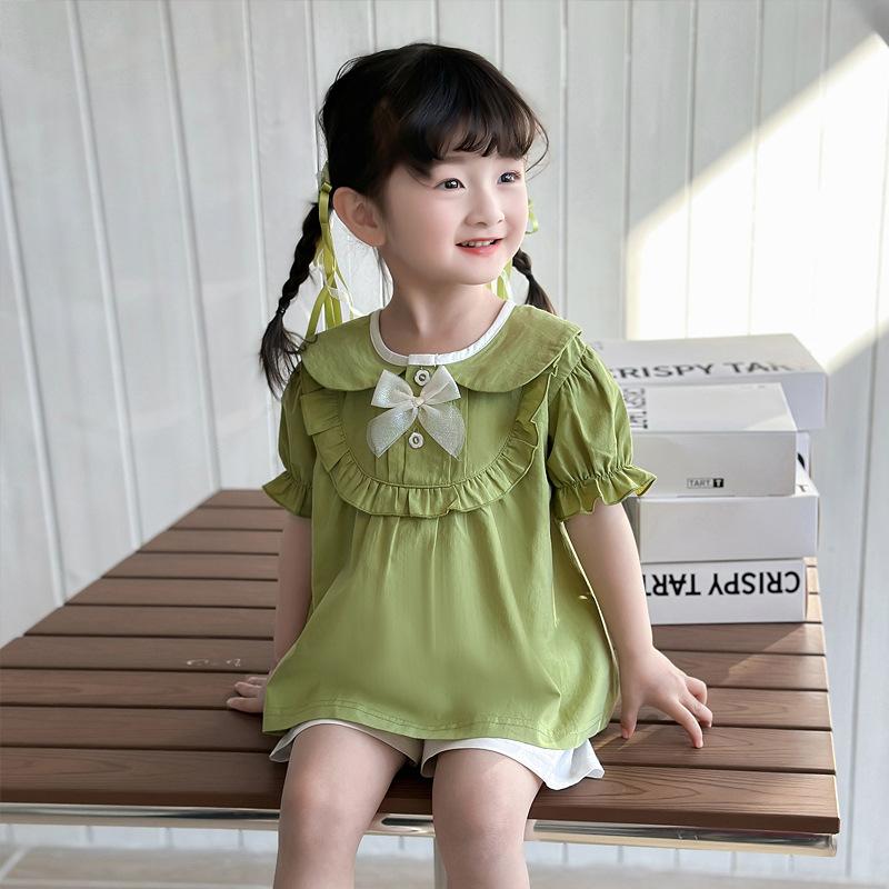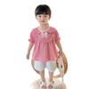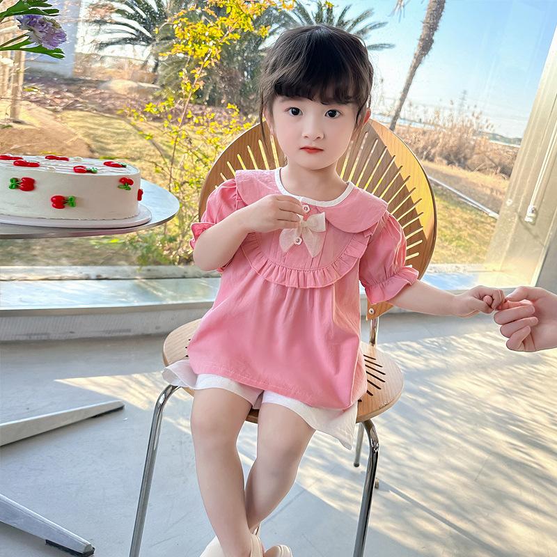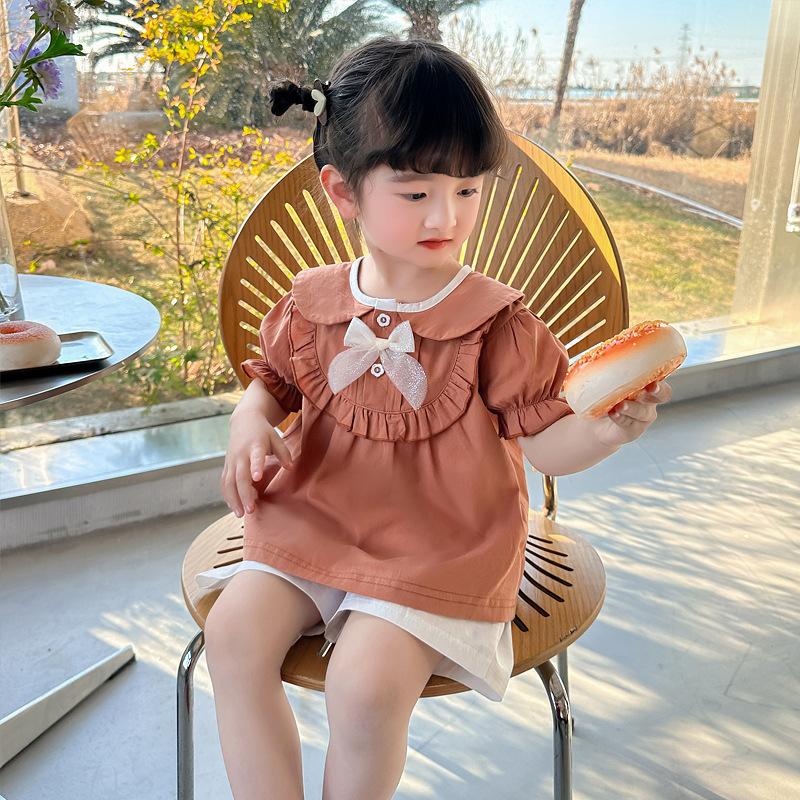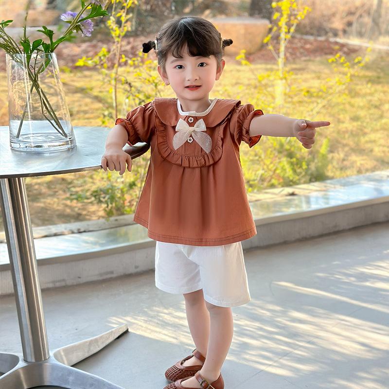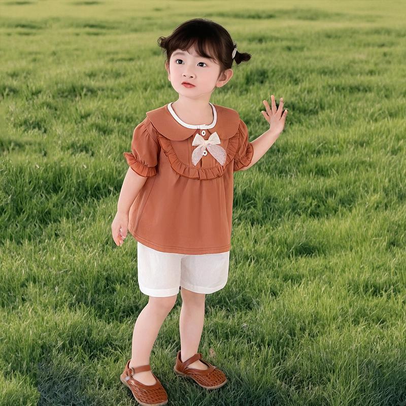 Traje de verano 2025 para niñas, nuevo conjunto de dos piezas de manga corta, bonito traje para niñas de 1 a 5 años.