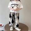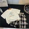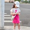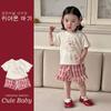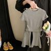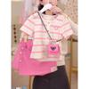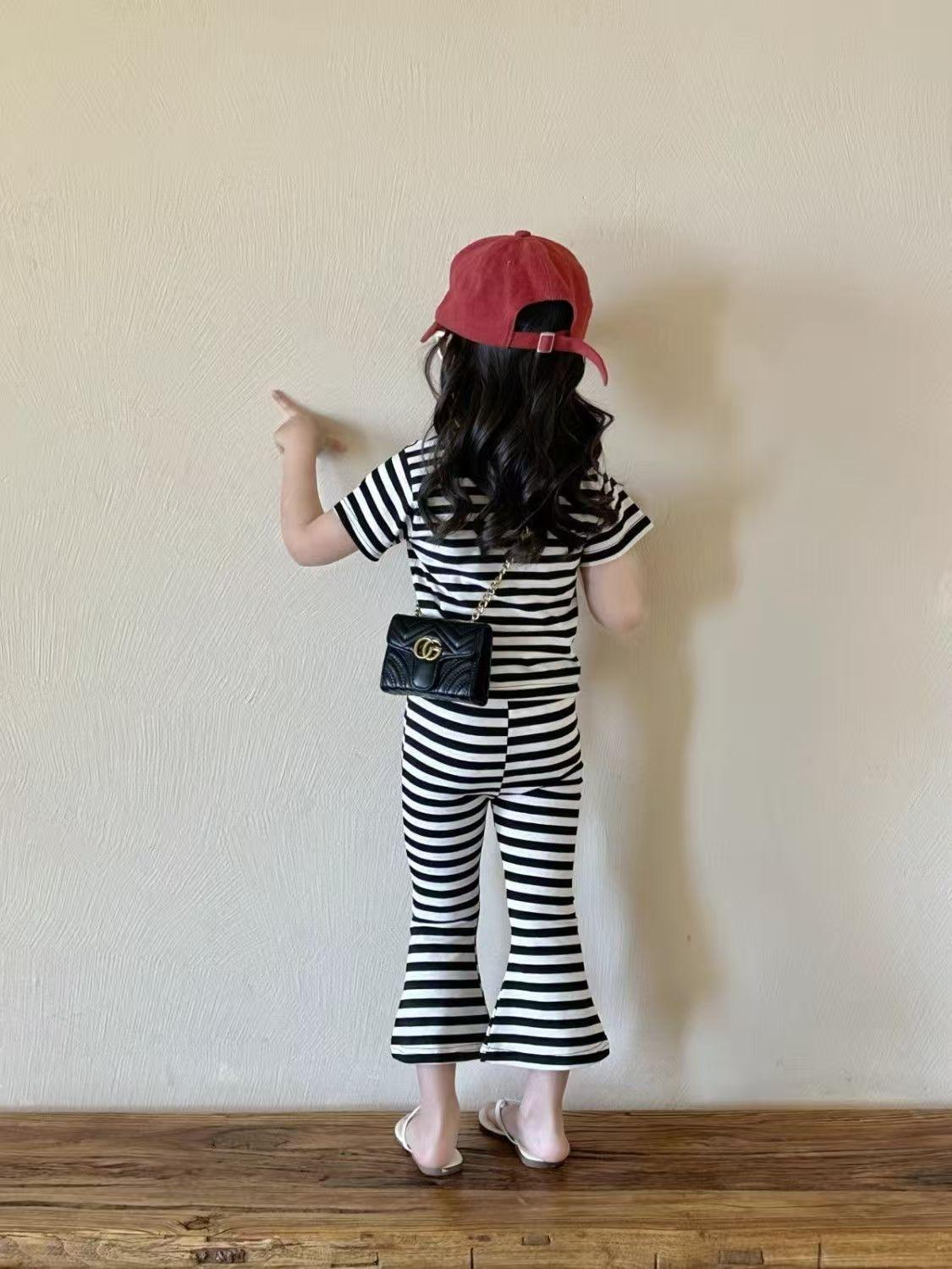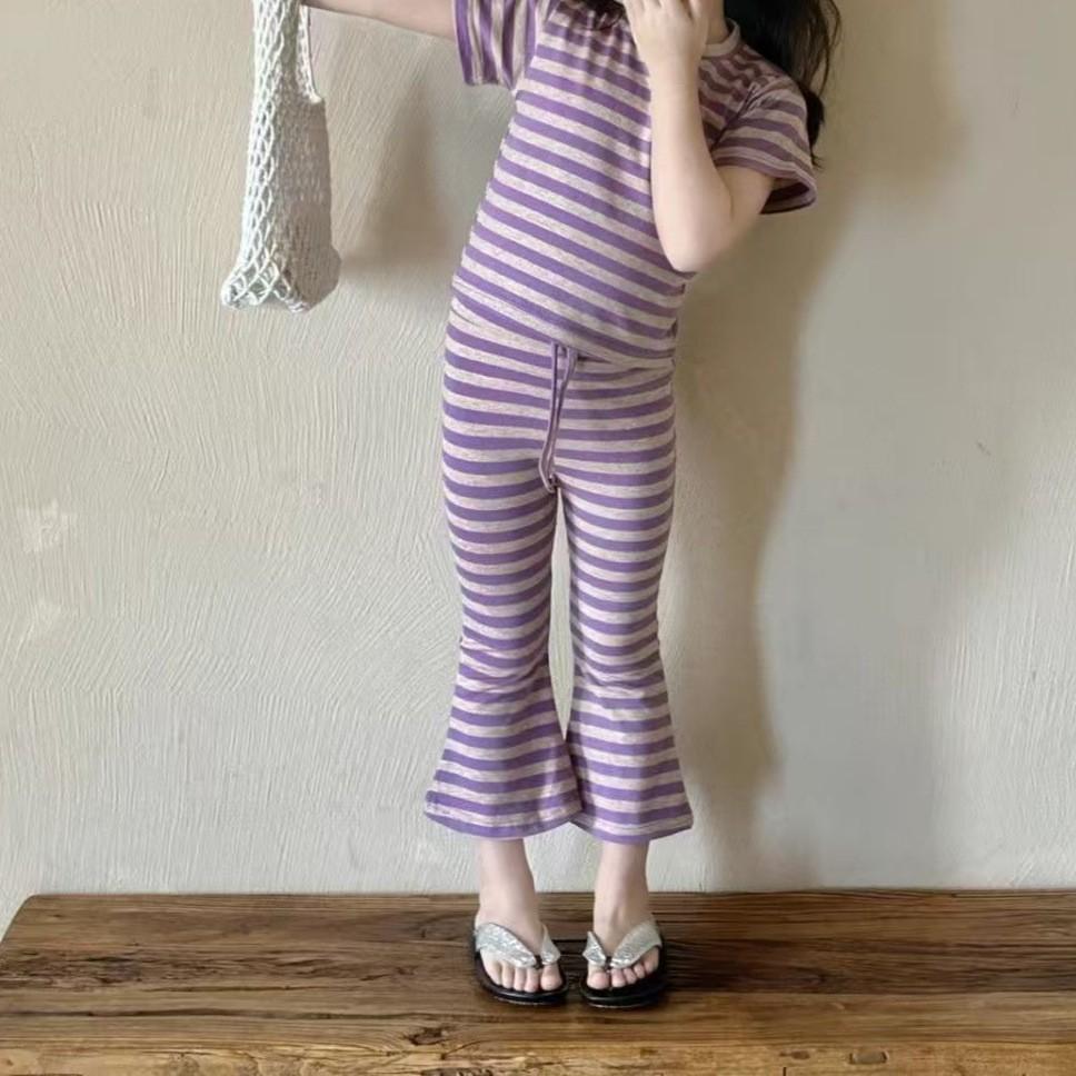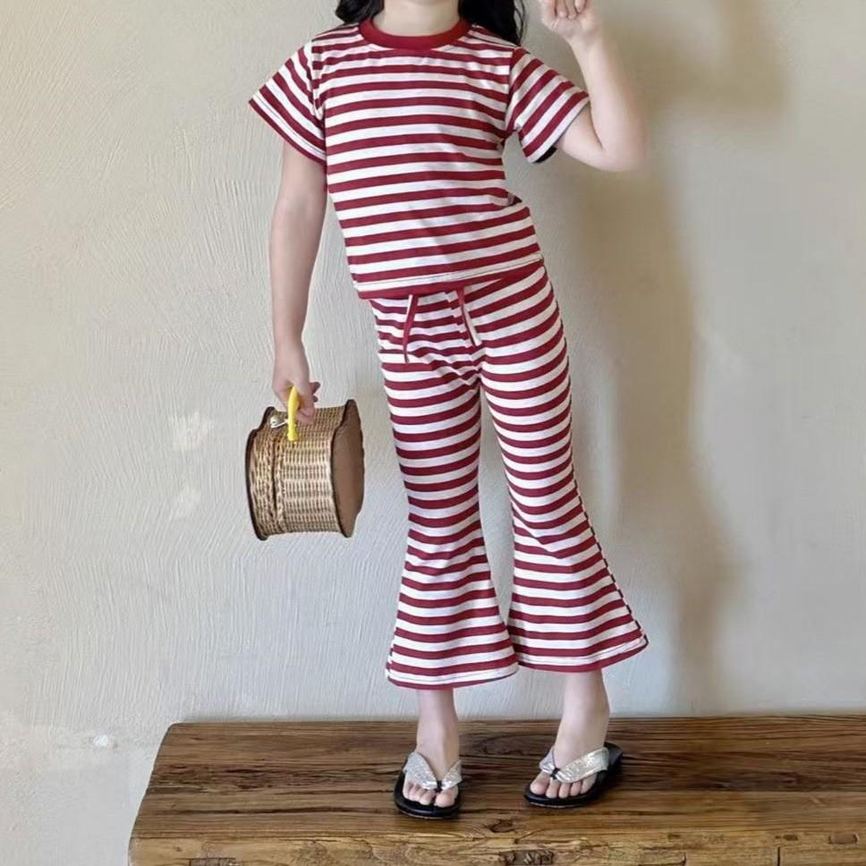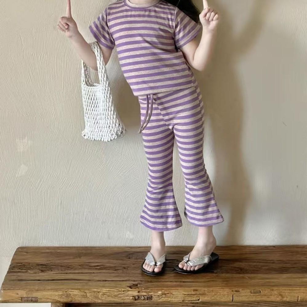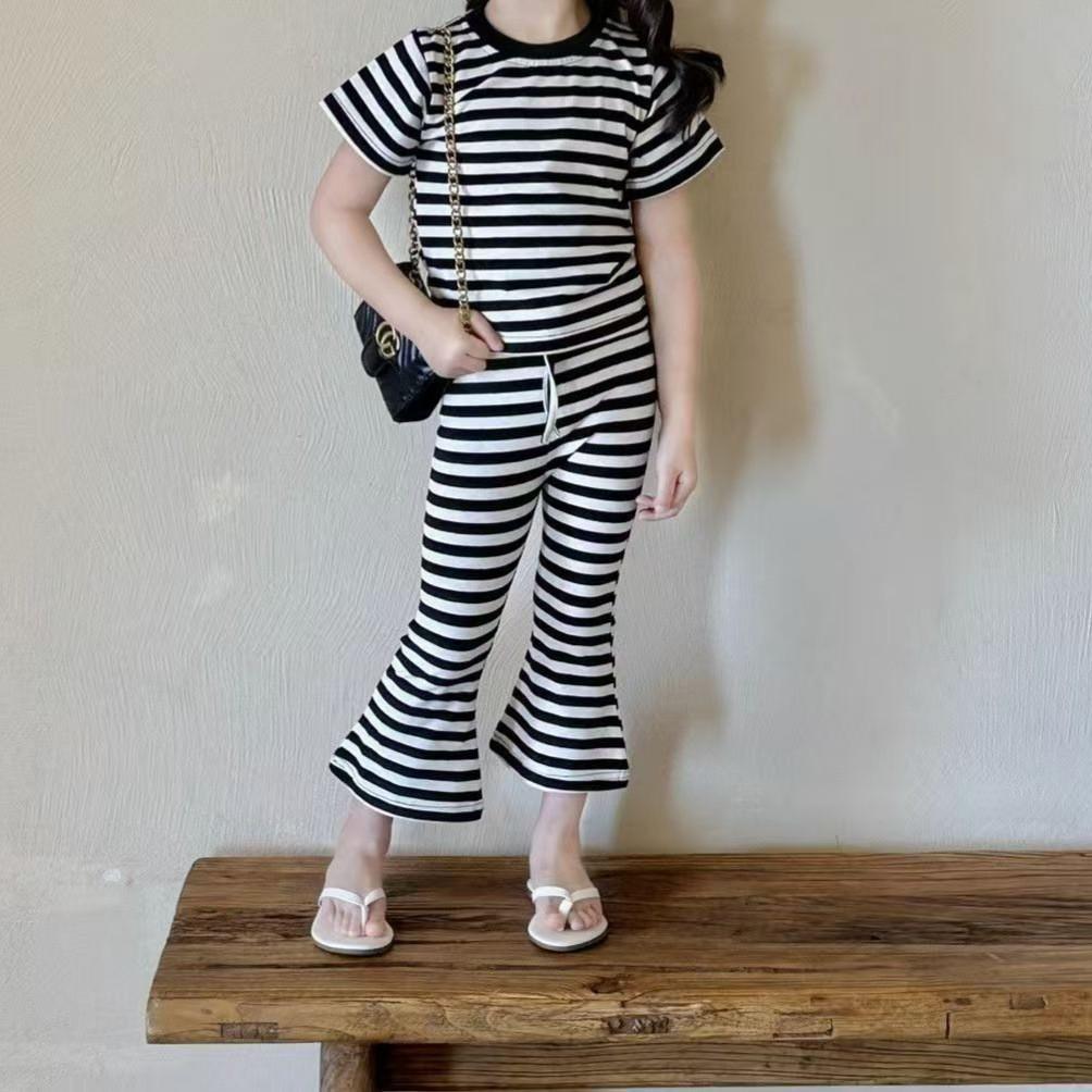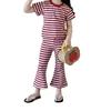Traje de verano para niñas Bebé Elegante Infantil Personalidad Moderna Coreano Bloque de color Rayado Camiseta de manga corta Pantalones acampanados cortos