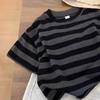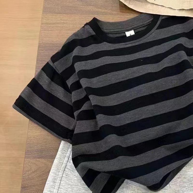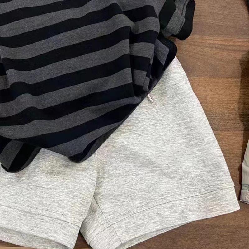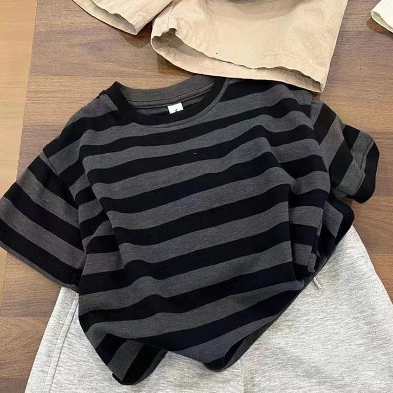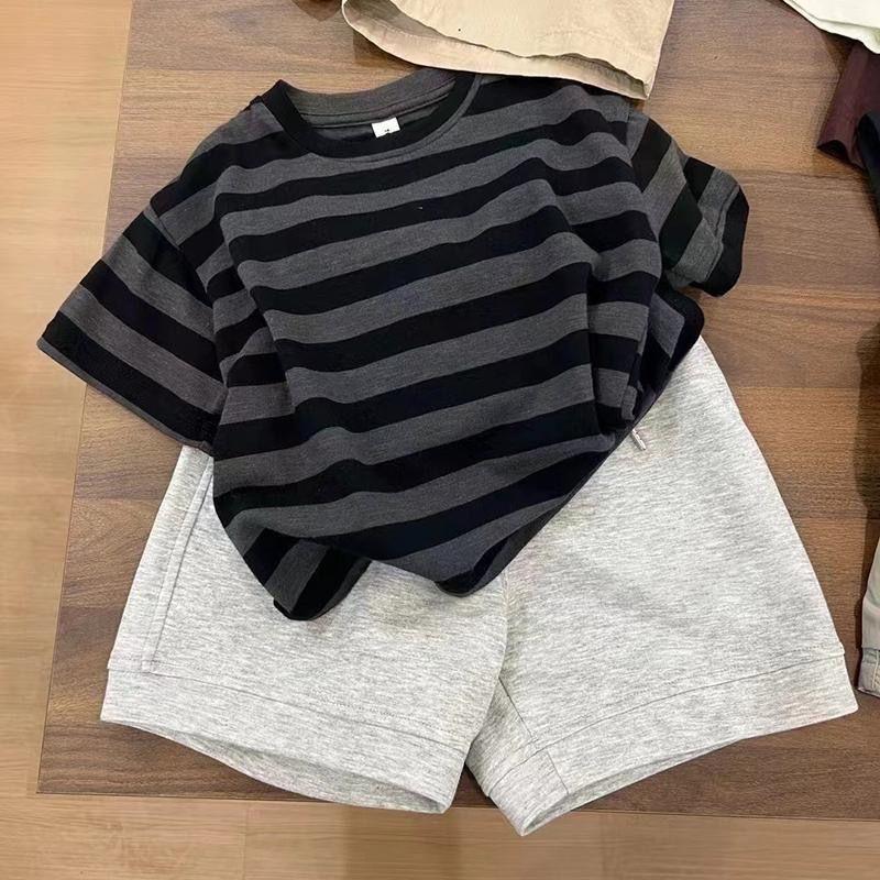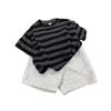 Traje de verano para niños y niñas, camiseta de manga corta a rayas con bloques de colores coreanos, pantalones cortos deportivos con personalidad para bebés y niños.