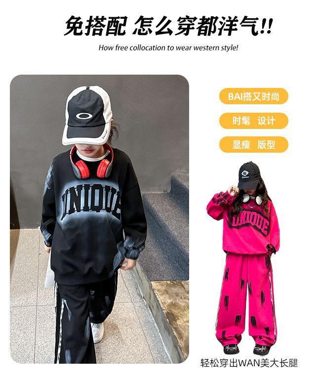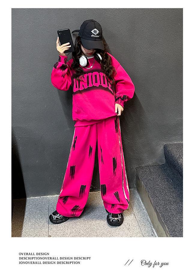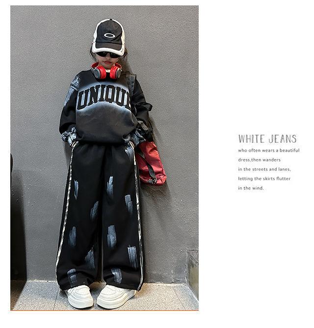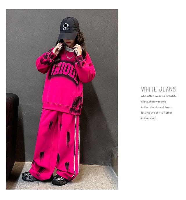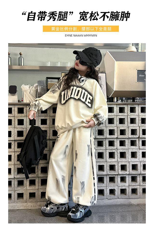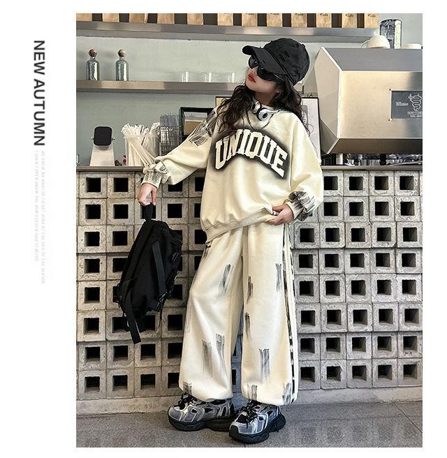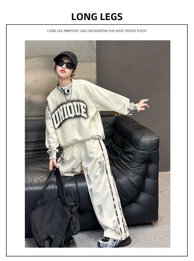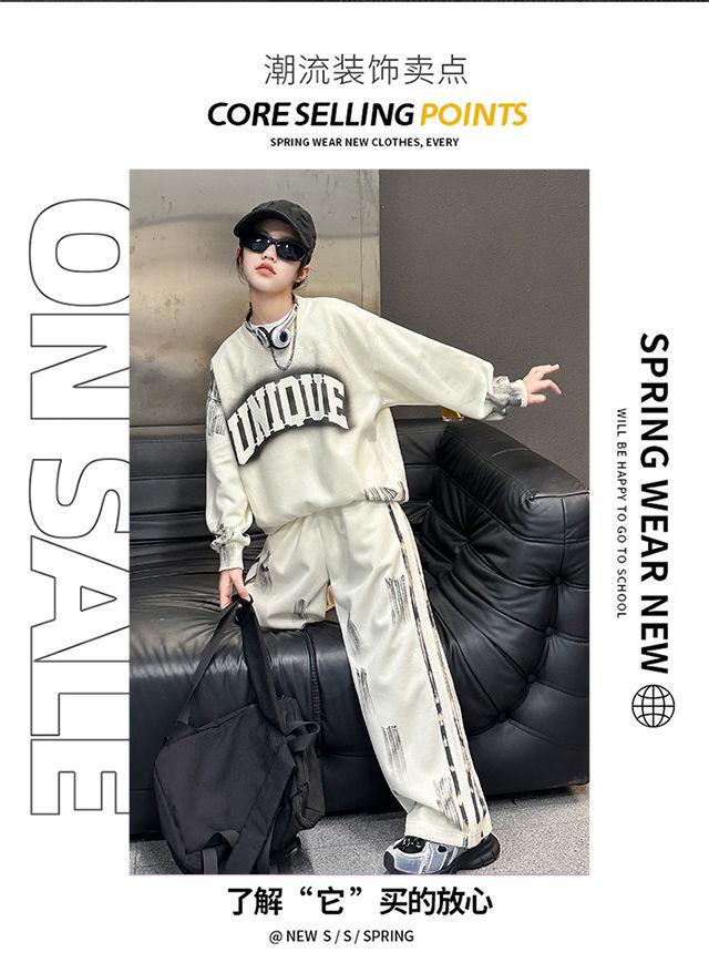 Conjunto deportivo de estilo coreano para niñas de talla mediana y grande, primavera y otoño, nuevo y elegante conjunto de dos piezas con pantalones a rayas y parte superior con letras a la moda.