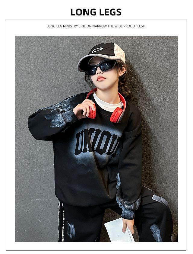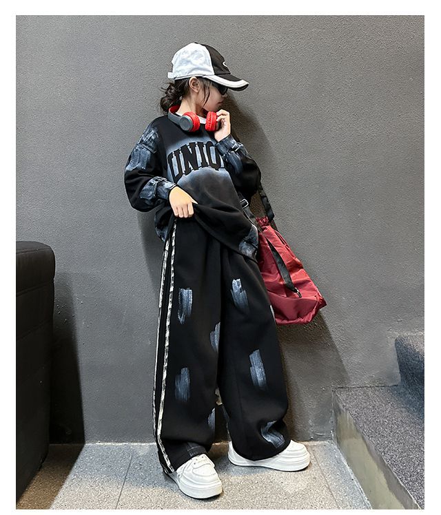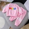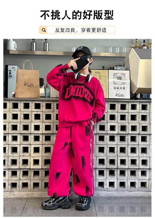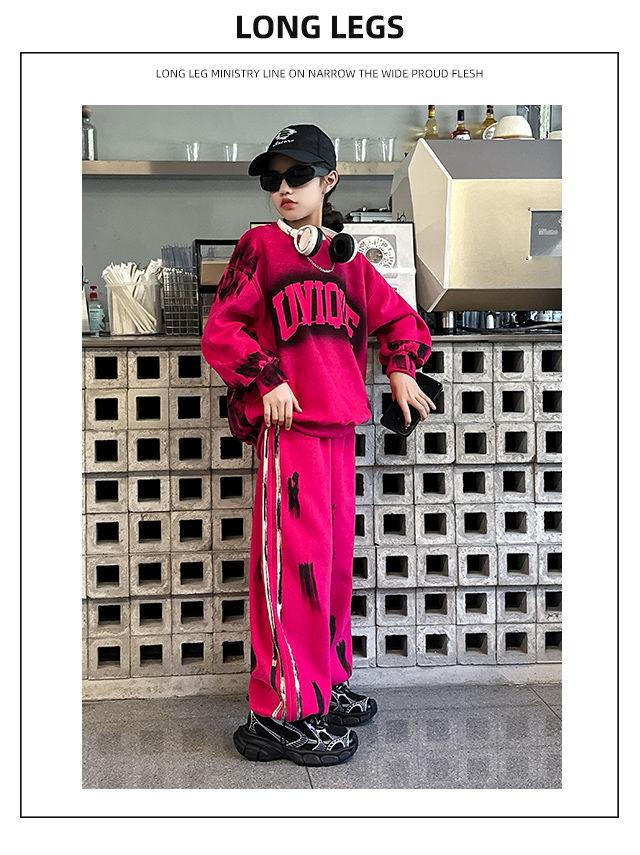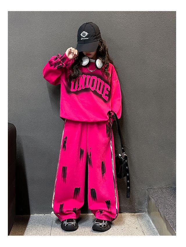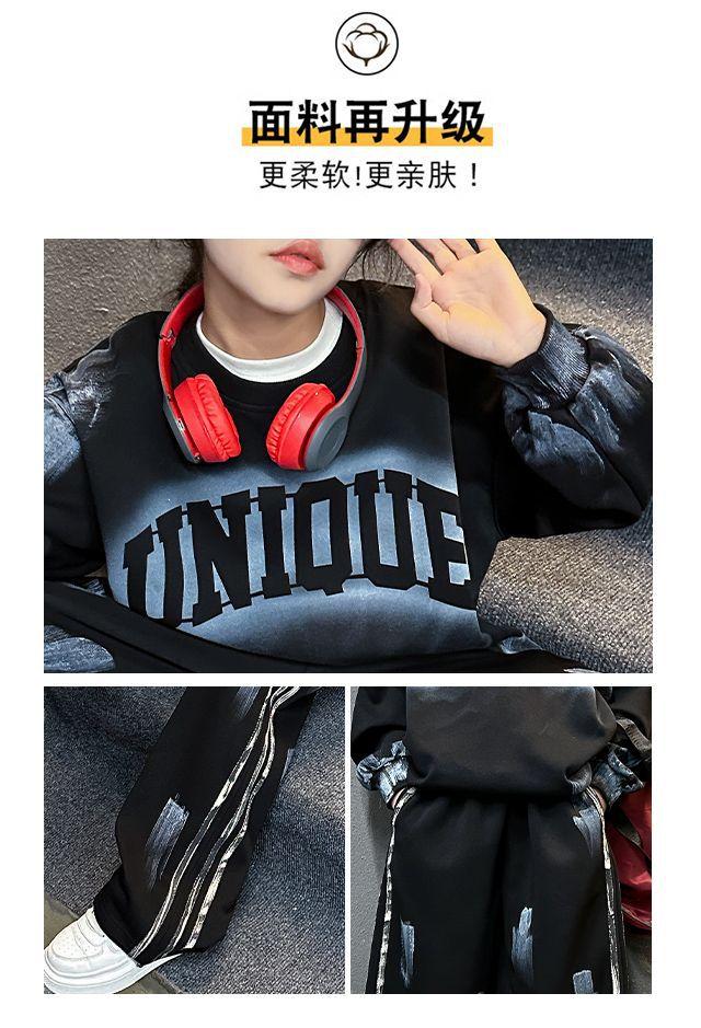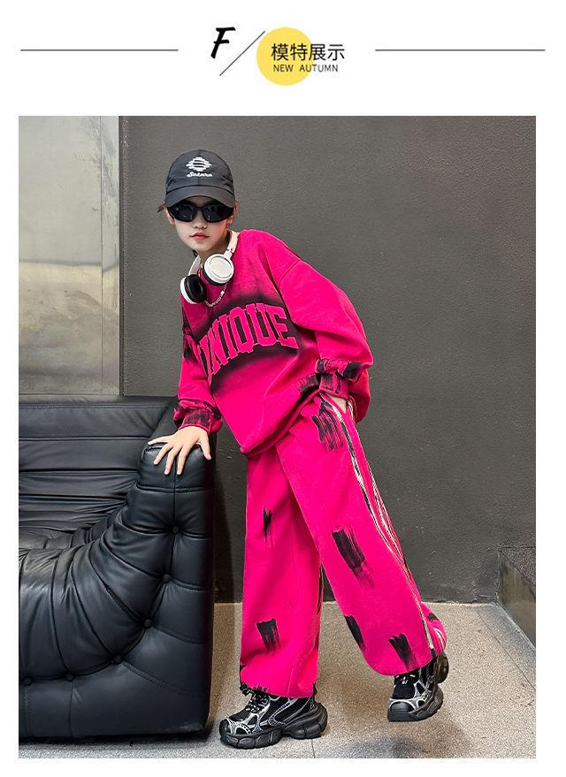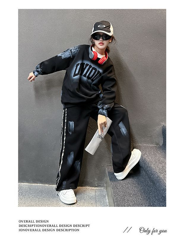 Conjunto deportivo de estilo coreano para niñas de talla mediana y grande, primavera y otoño, nuevo y elegante conjunto de dos piezas con pantalones a rayas y parte superior con letras a la moda.