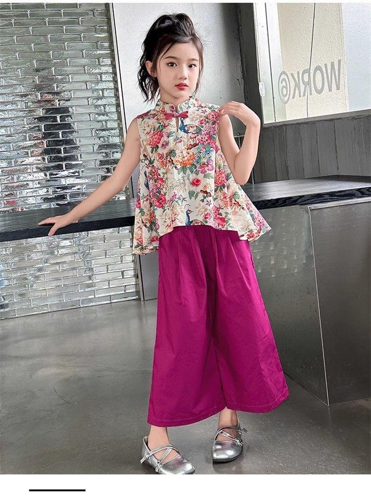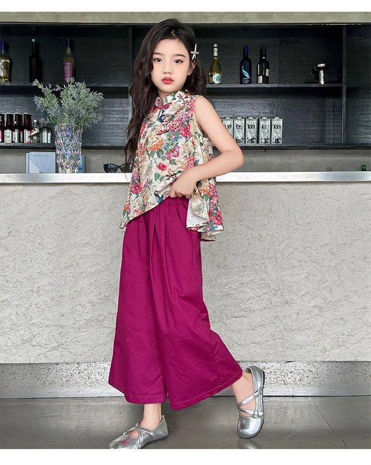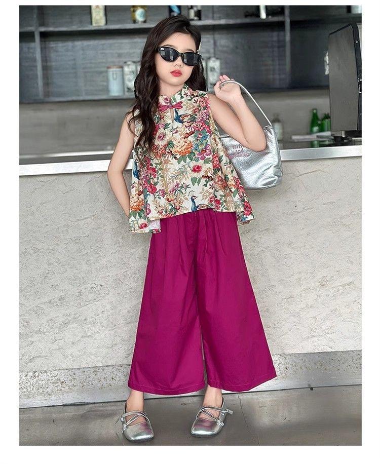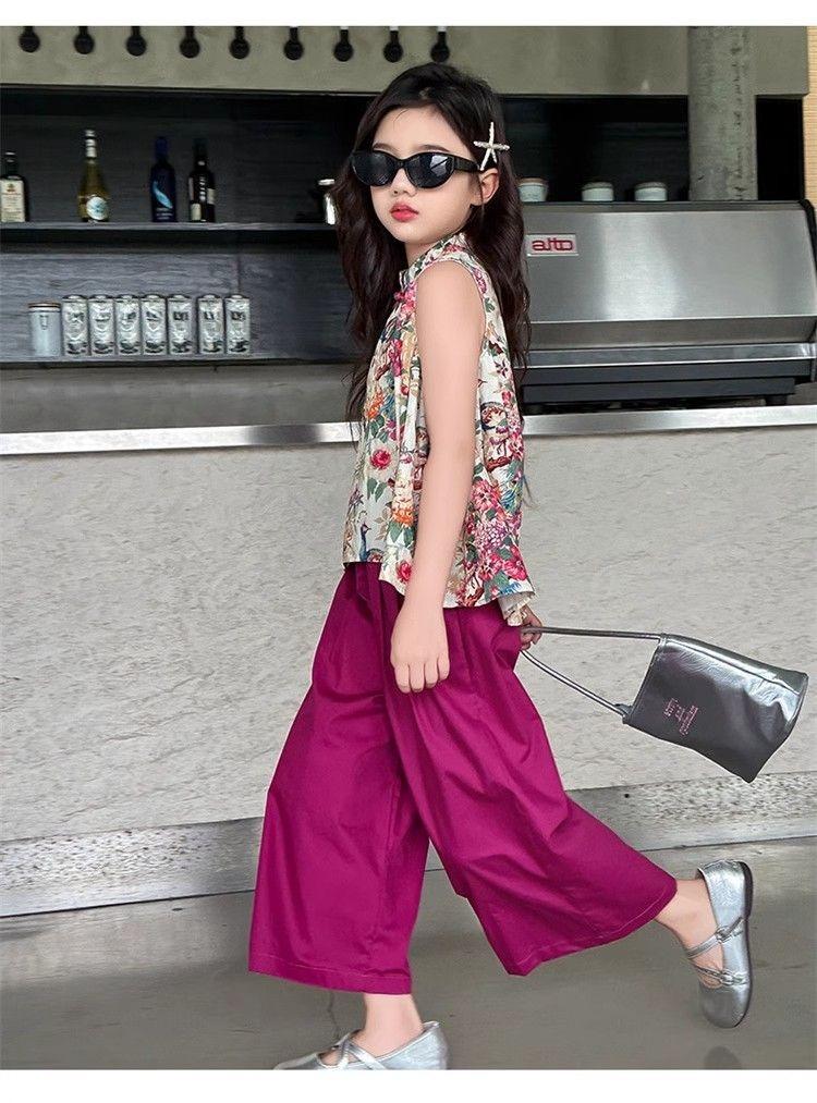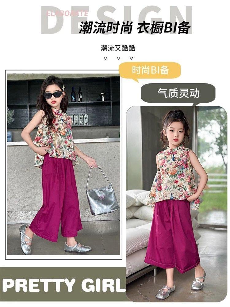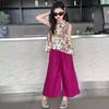 Traje de verano para niñas 2025, nuevo y elegante conjunto de dos piezas con camisa floral sin mangas y pantalones anchos de estilo coreano.
