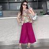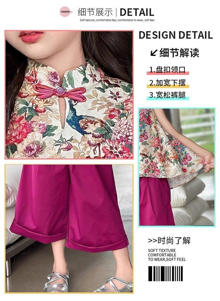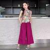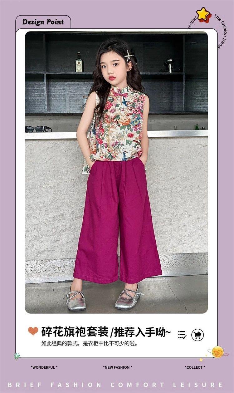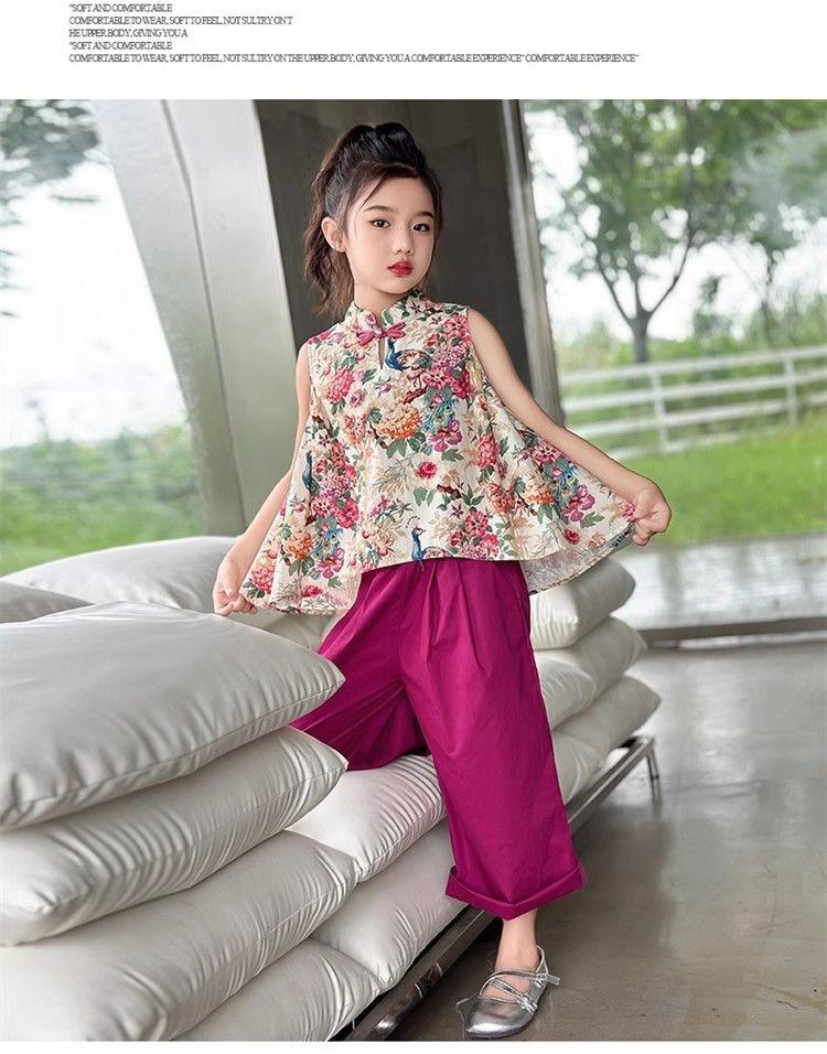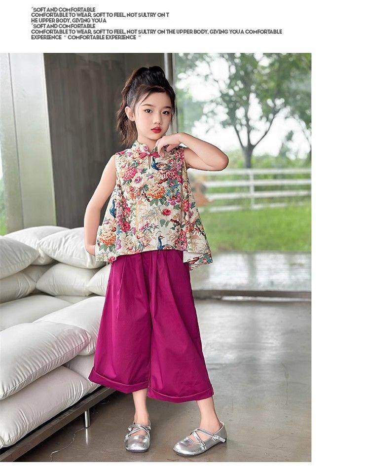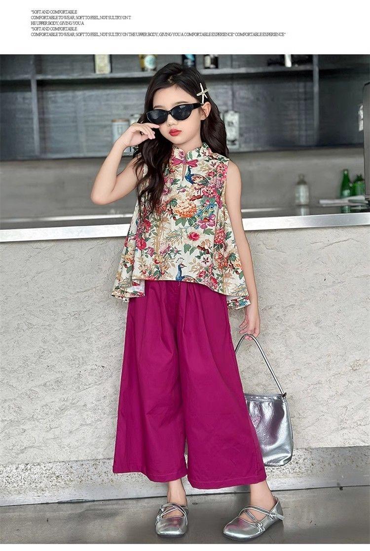 Traje de verano para niñas 2025, nuevo y elegante conjunto de dos piezas con camisa floral sin mangas y pantalones anchos de estilo coreano.