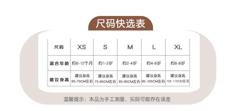Xs size is about 6-12 months and the recommended height is 65-75cm, S size is about 1-2 years old, recommended...