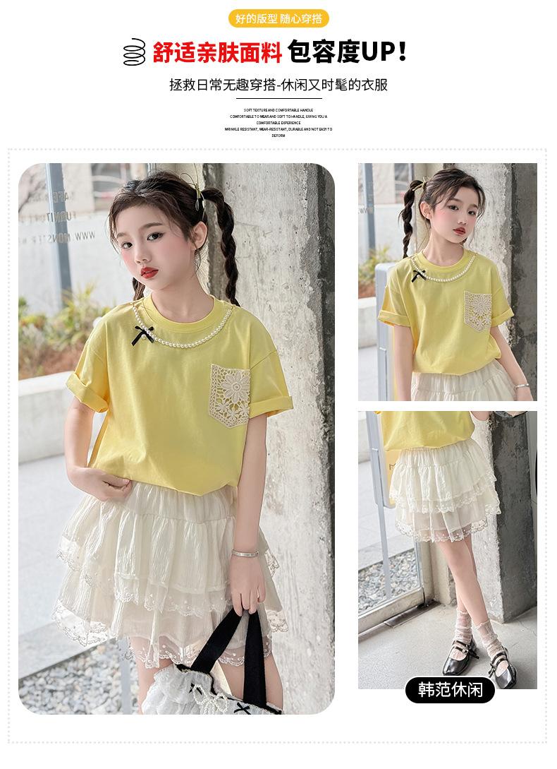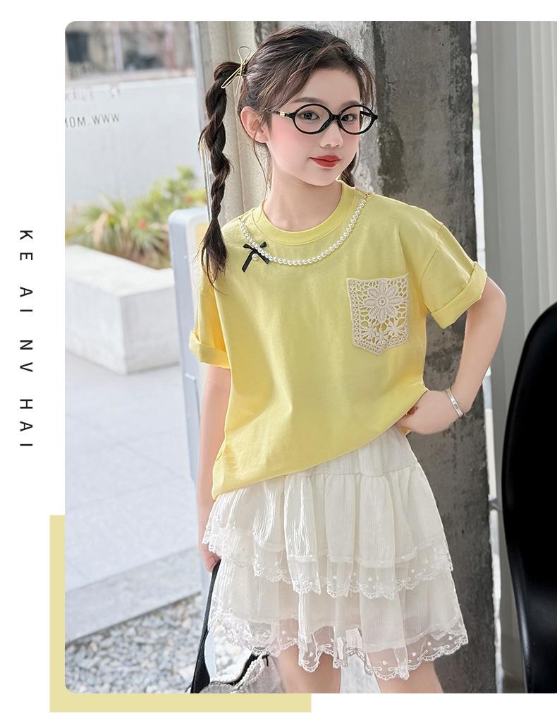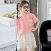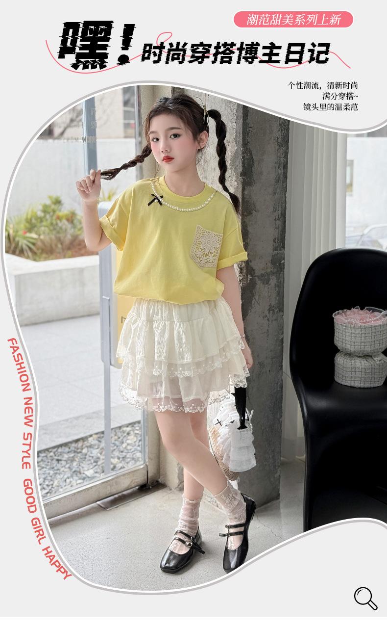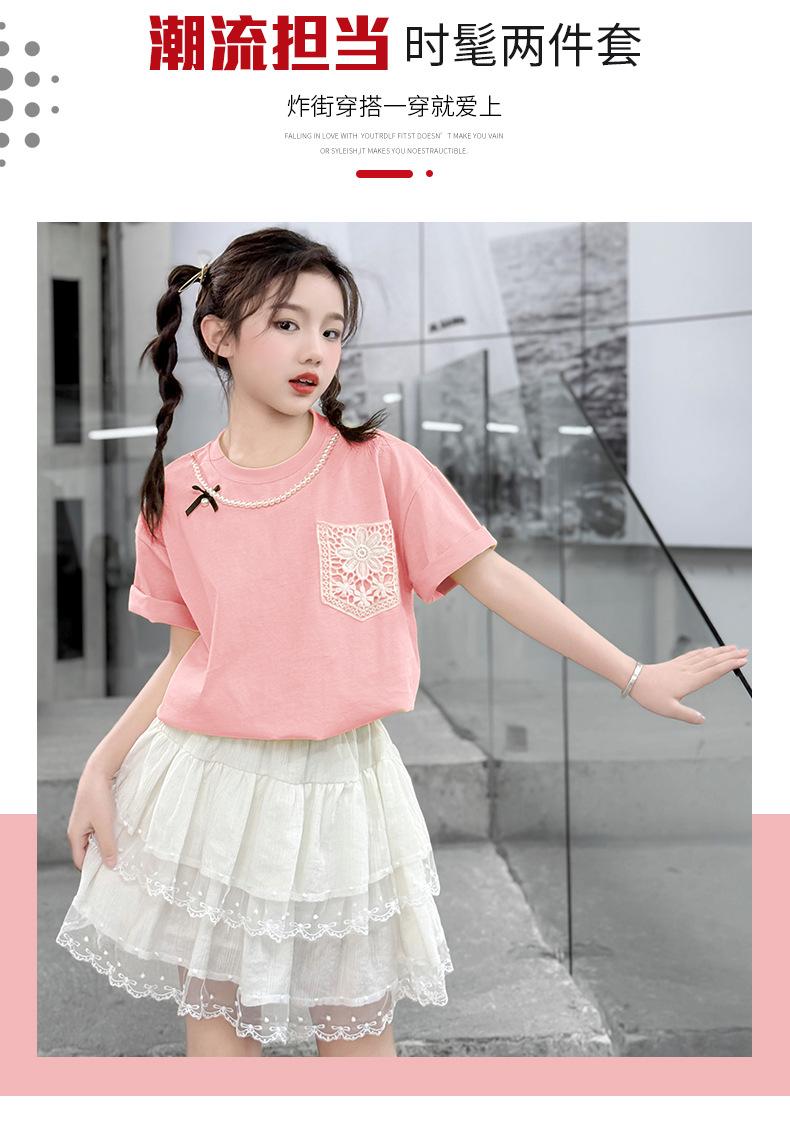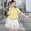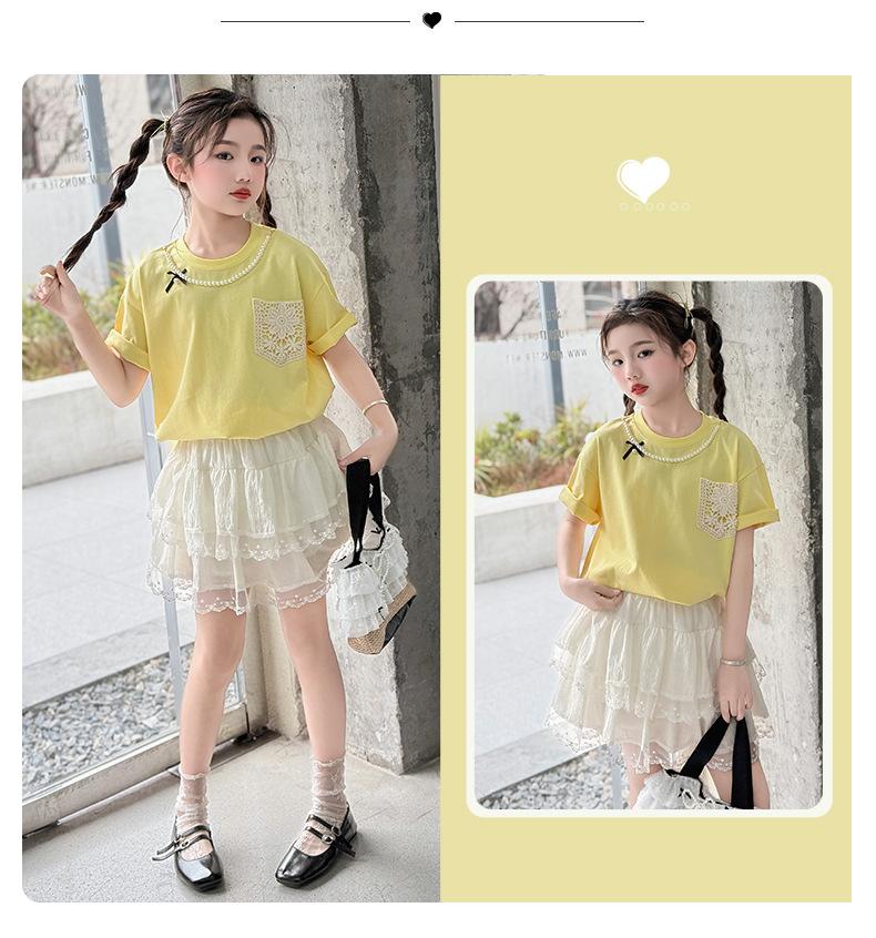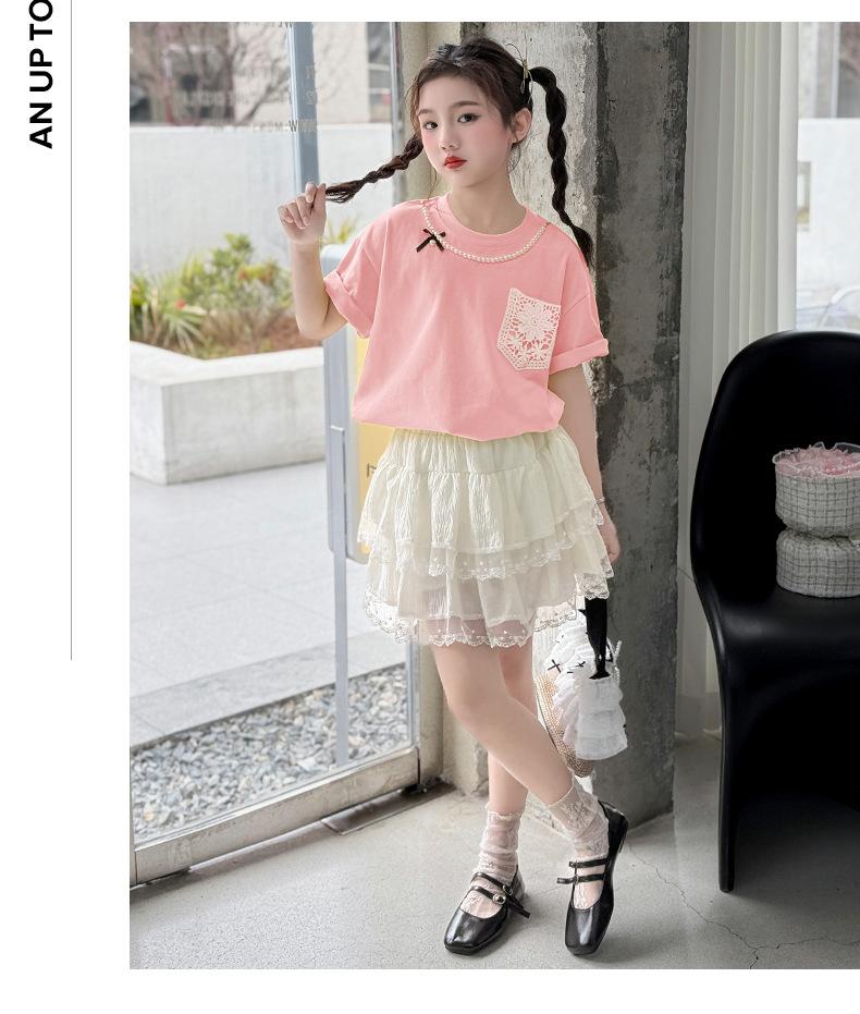 Traje de verano de manga corta para niñas 2025, nuevo conjunto de dos piezas de falda de media longitud de verano para niñas de estilo occidental a la moda para niñas de tallas medianas y grandes.